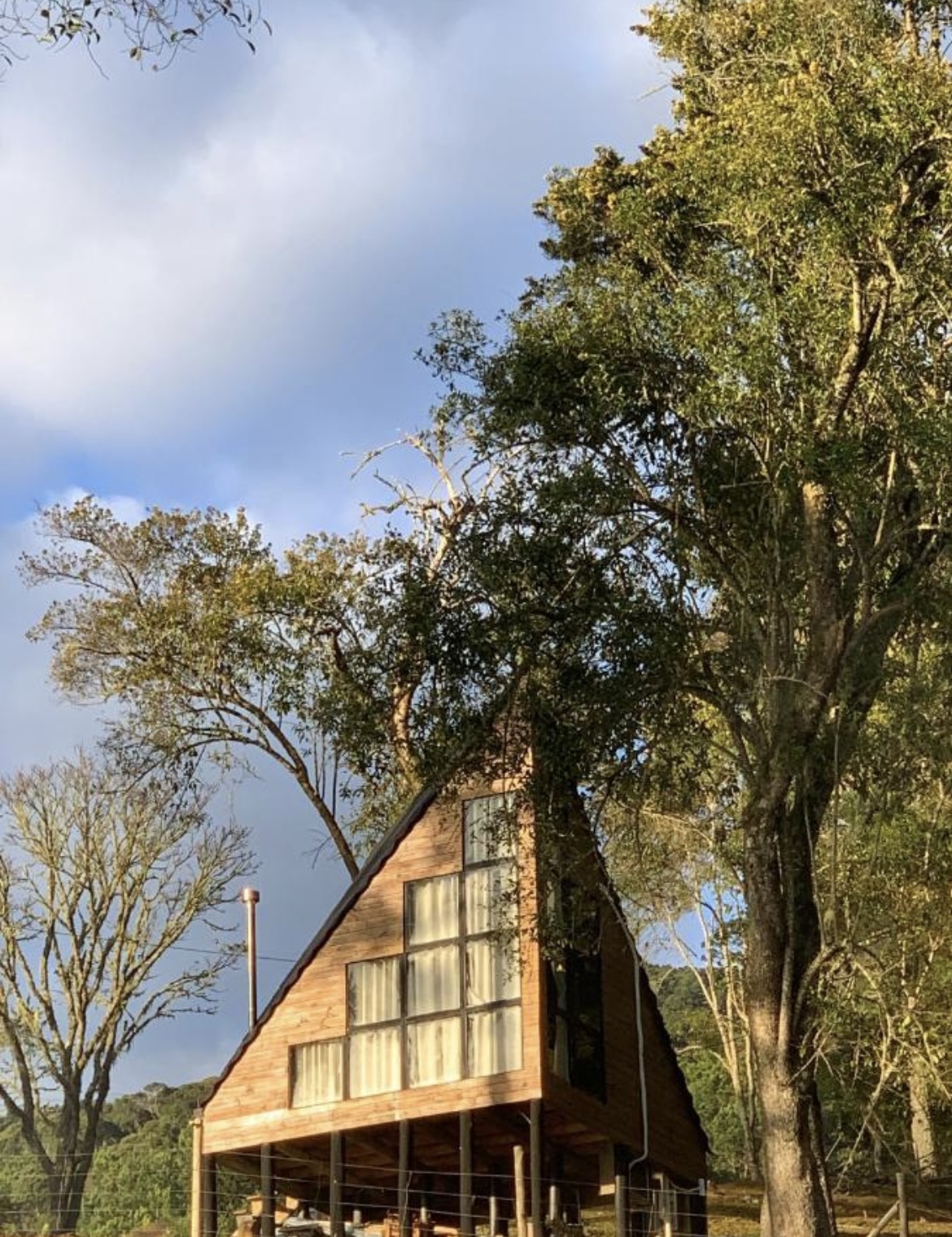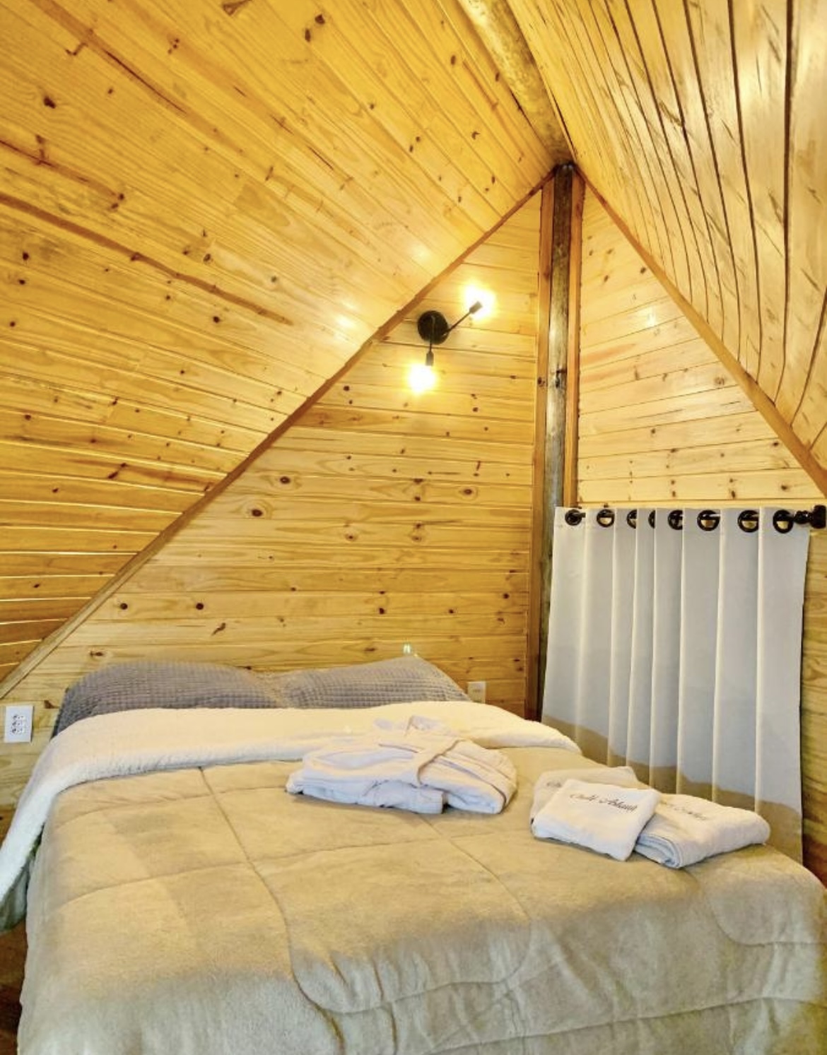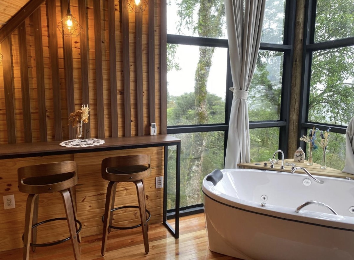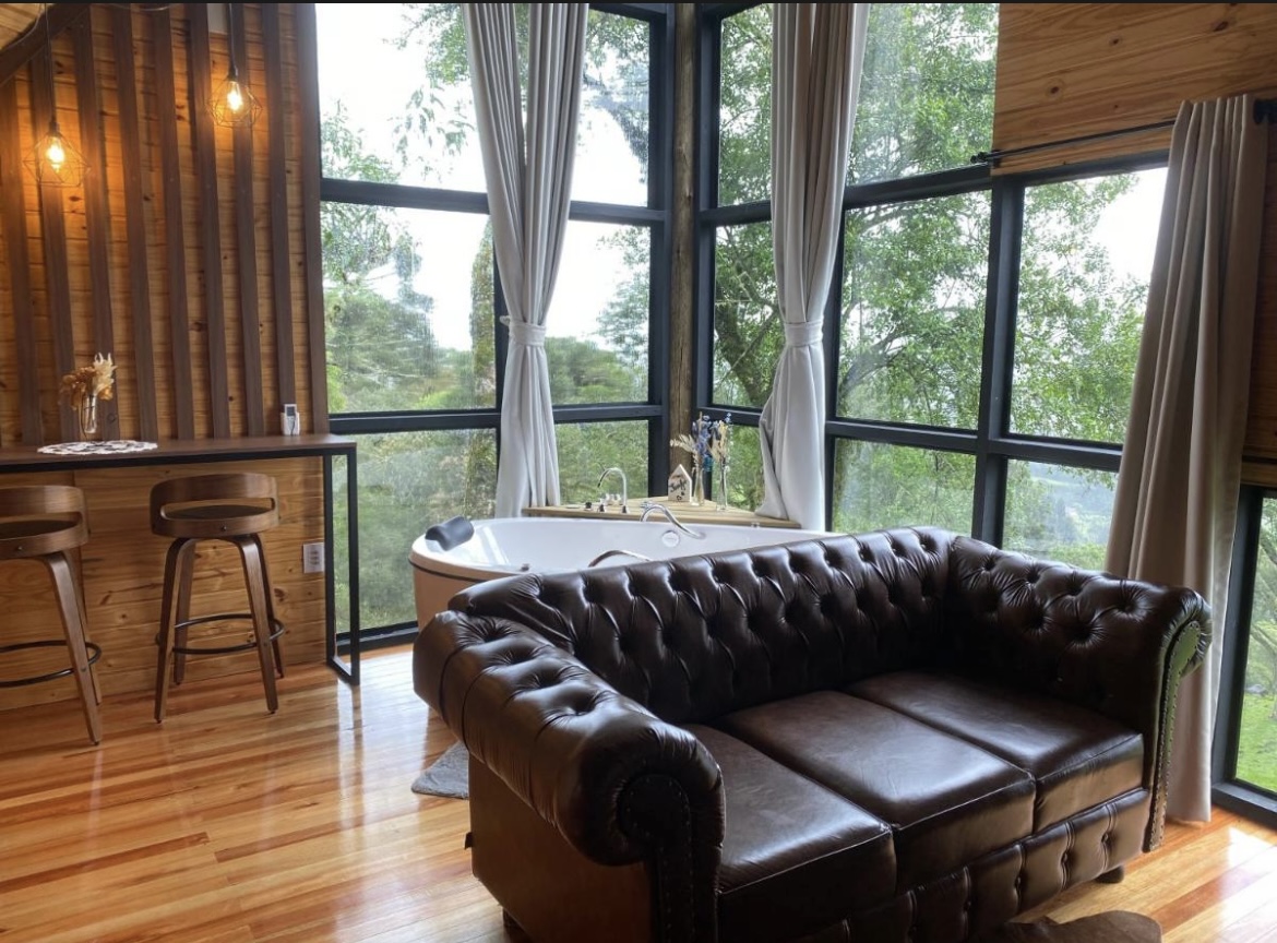 Uma cabana romântica para casal, com vista incrível do alto da montanha, com aquele “mar” de nuvens (dependendo do clima), bosque de araucárias em frente, banheira de hidromassagem para dois com vista pro nascer e por do sol, cama casal muito confortável no mezanino, cobertas quentinhas, cortinas em todas as janelas, roupões, chinelos, sofá gostoso pra relaxar, TV com Netflix,