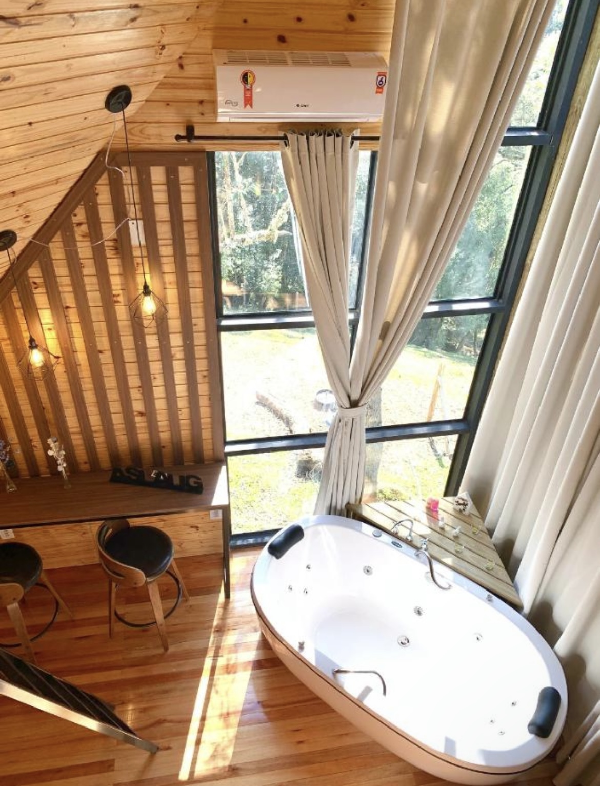 calefator à lenha (lareira fechada), ar condicionado (quente/frio), frigobar, mini cozinha completa e estacionamento à porta da cabana. No Aslaug Chalé o acesso é excelente (6km da cidade por asfalto) com portão eletrônico, estrada cascalhada e concretada. O anfitrião reside a 100m e está sempre à disposição dos hóspedes, online no whatsapp. Aceitam encomendas de: cestas de café da manhã, piquenique, tábua de frios e decorações românticas.