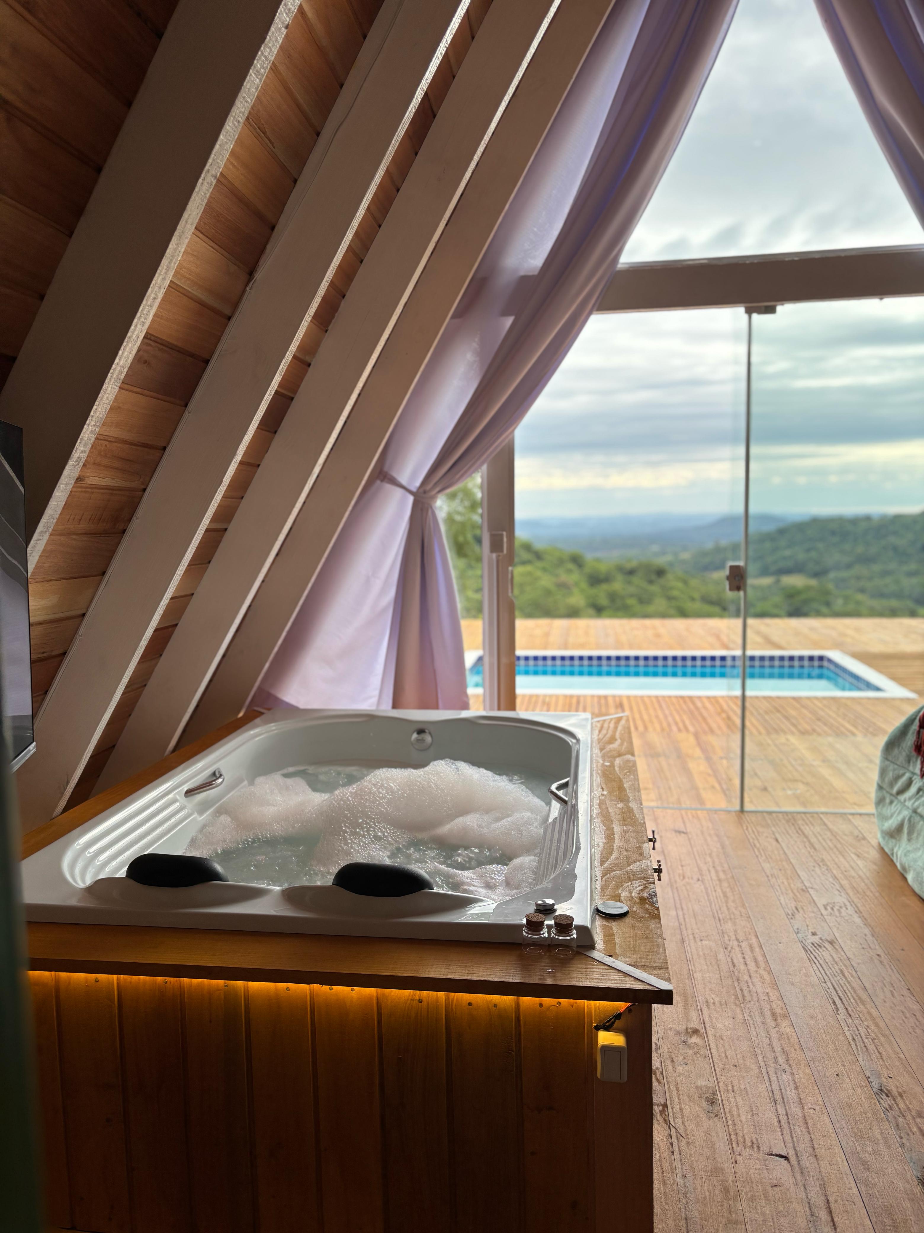 banheira de hidromassagem, churrasqueira e uma vista incrível para o vale. A cabana Refúgio acomoda até 6 pessoas, tem piscina sem aquecimento,