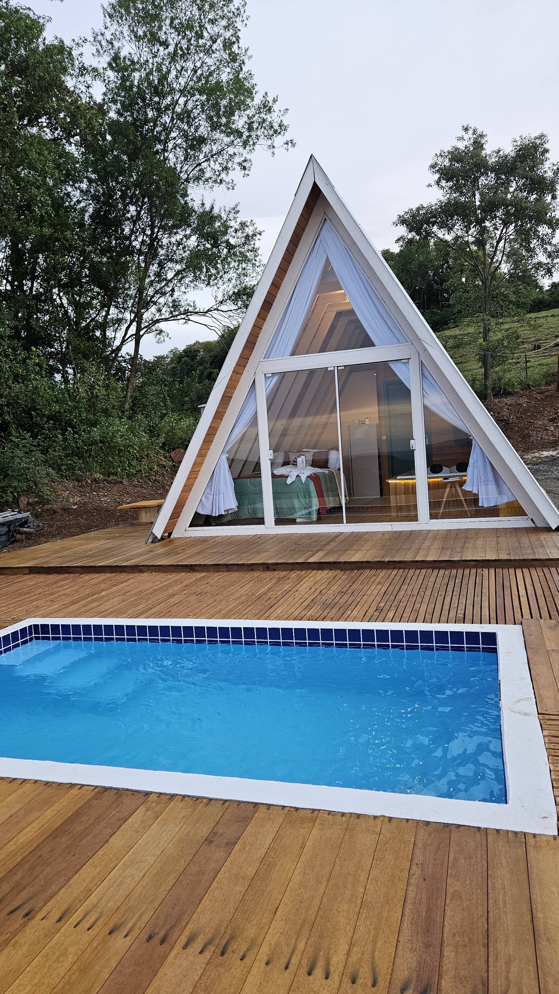 Sao duas cabanas estilo A-frame no espaço e as duas são inteiramente privativas. A cabana white acomoda duas pessoas, tem piscina aquecida,