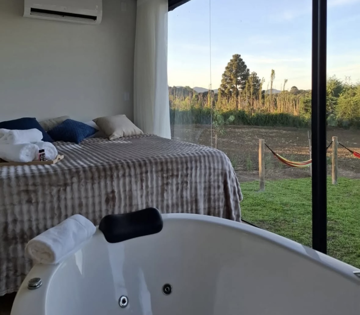 A Cabana Ninho do Quero-Quero é um refúgio que une charme, conforto e conexão com a natureza em um ambiente cuidadosamente pensado para proporcionar bem-estar. O espaço conta com suíte equipada com cama queen, lareira, banheira de hidromassagem, cozinha completa e varanda com vista para o jardim, criando um cenário perfeito para relaxar e viver momentos especiais.
