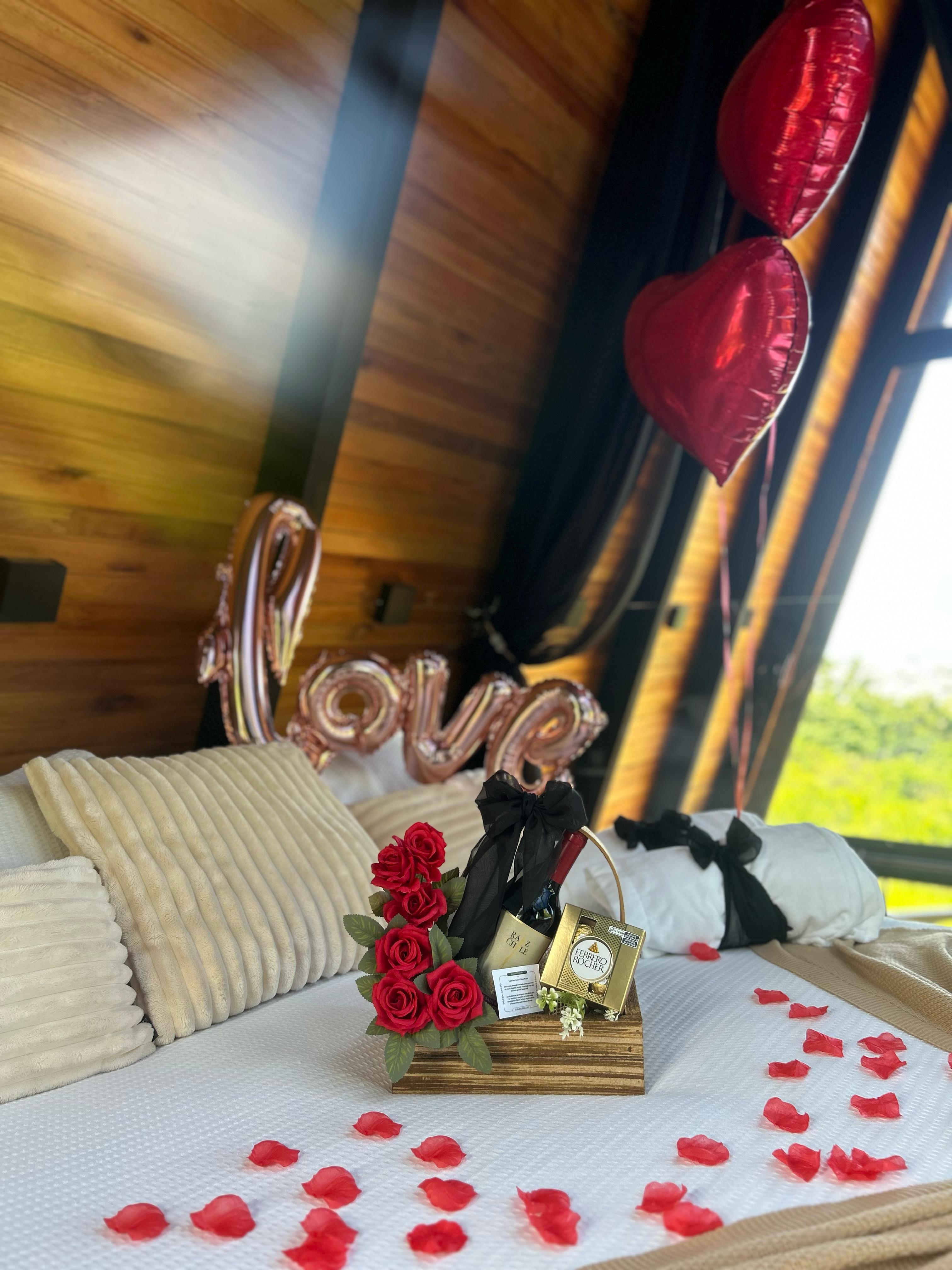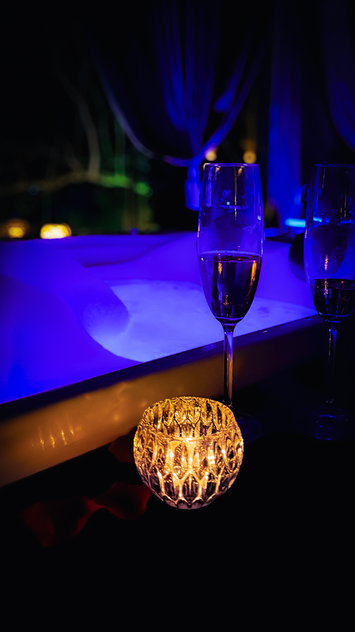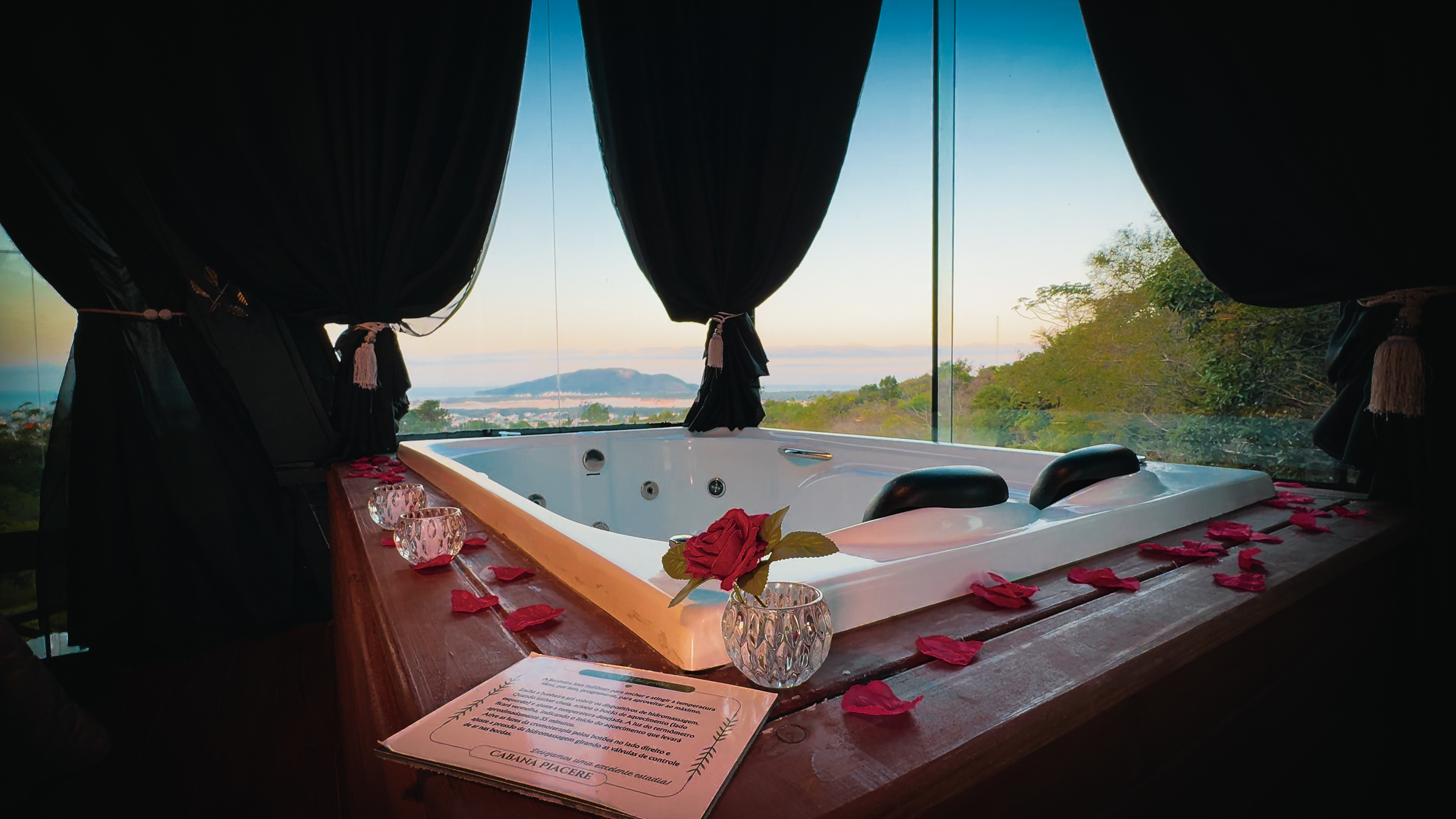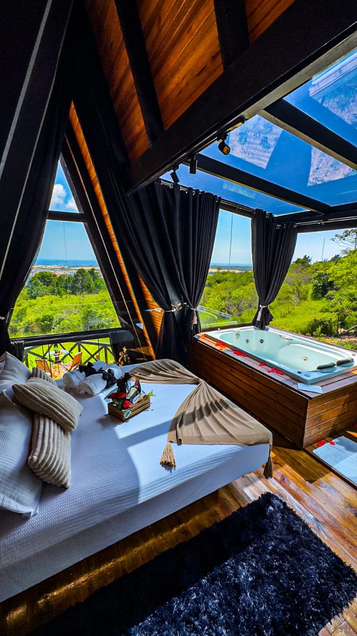 Hidromassagem com teto de vidro e vista para o mar e o céu, banheiro estilo SPA com duas duchas, e um jardim com praça de fogo cercado pela natureza e exuberantes montanhas, formam o cenário perfeito para celebrar o amor, criando memórias inesquecíveis!