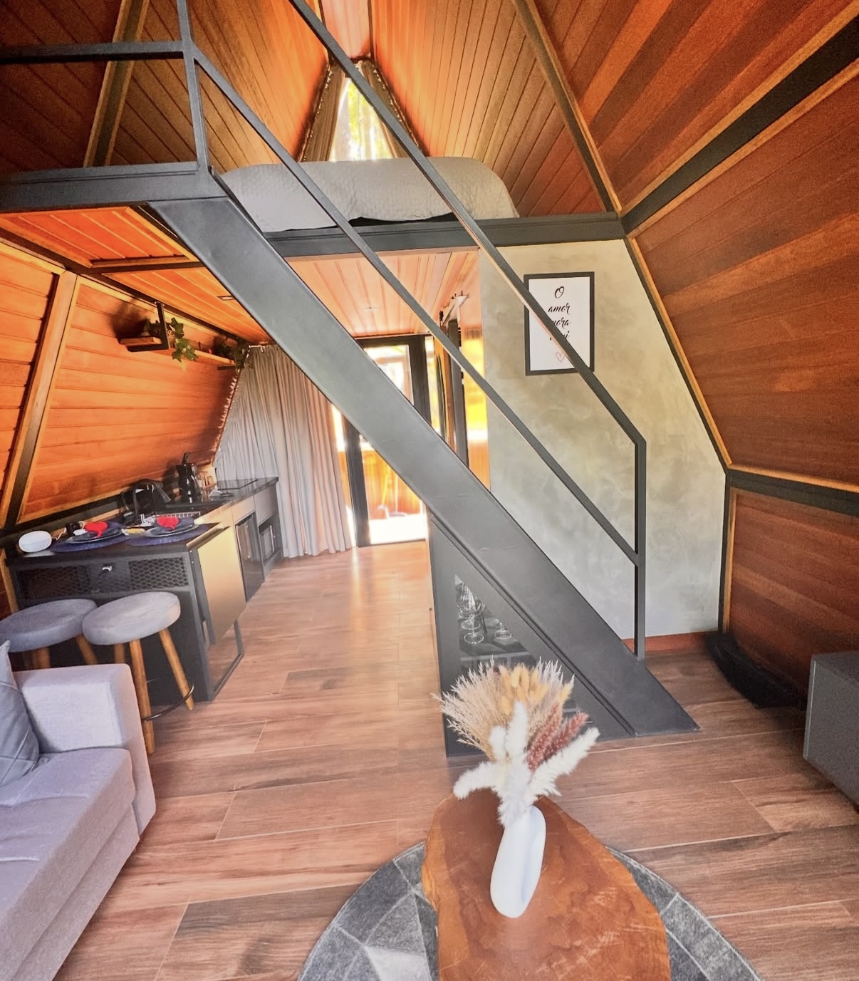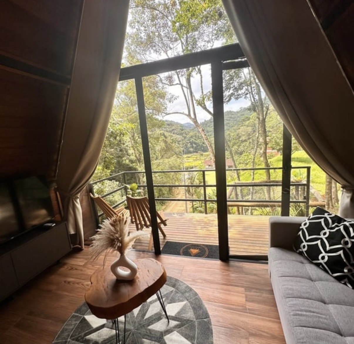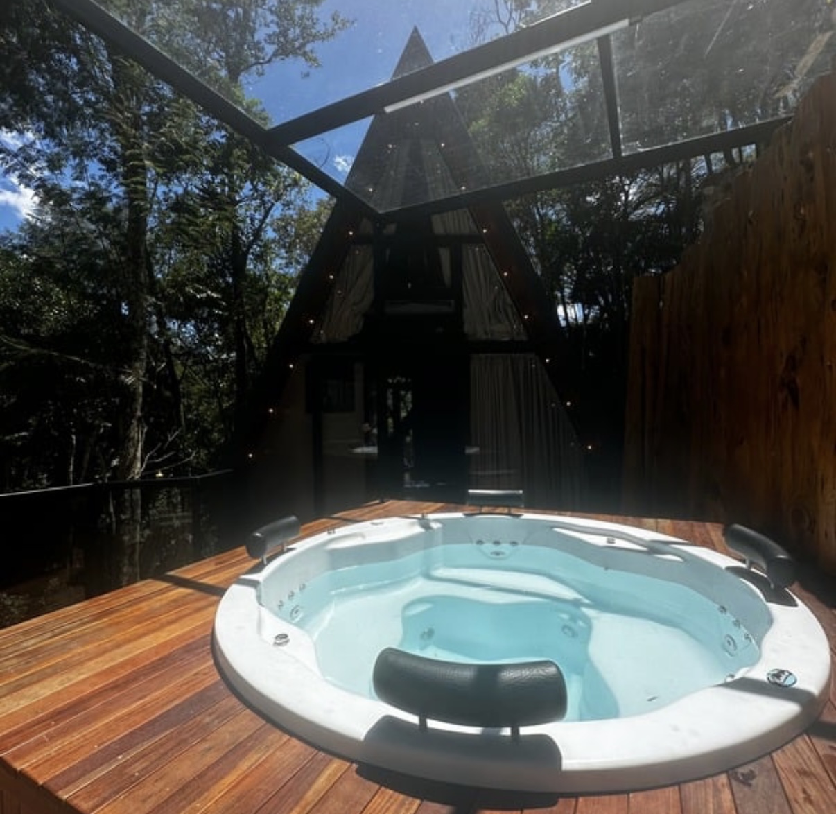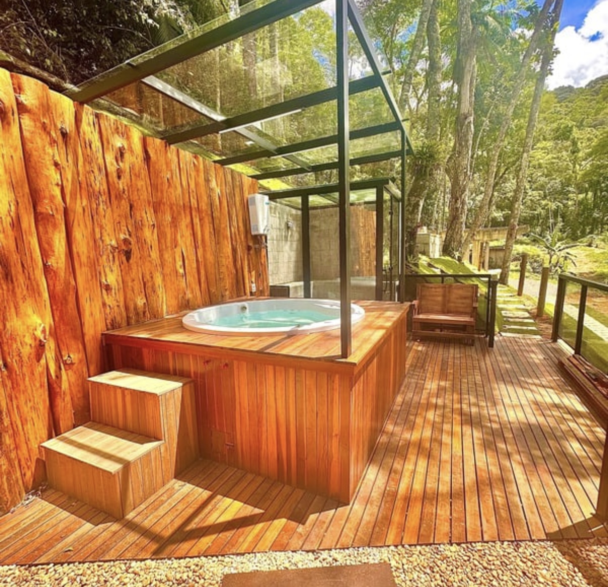 A cabana é composta por sauna, hidromassagem, rede suspensa, garagem, lareira interna e externa, Wi-Fi, churrasqueira, ar condicionado, tv com streaming e todos utensílios de cozinha como kit de founde, panelas, talheres, taças e copos.