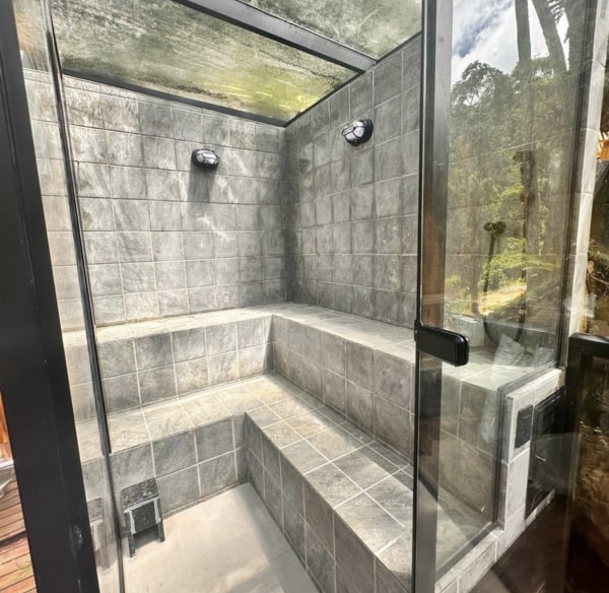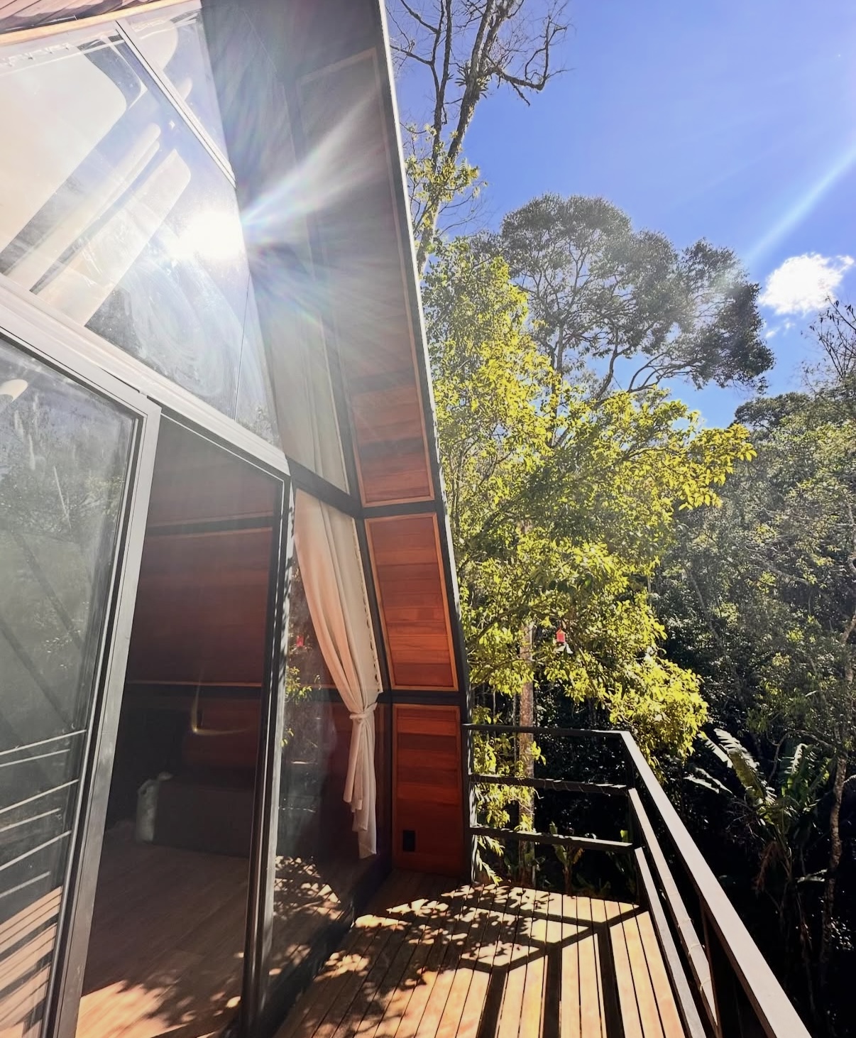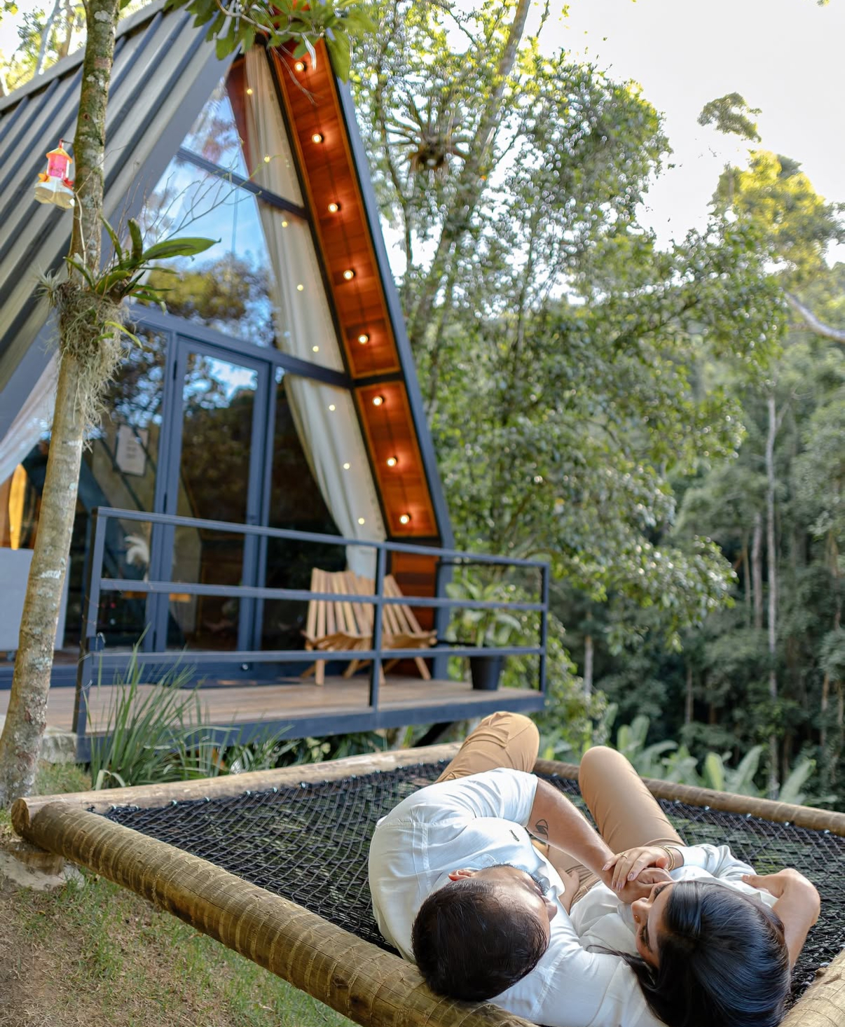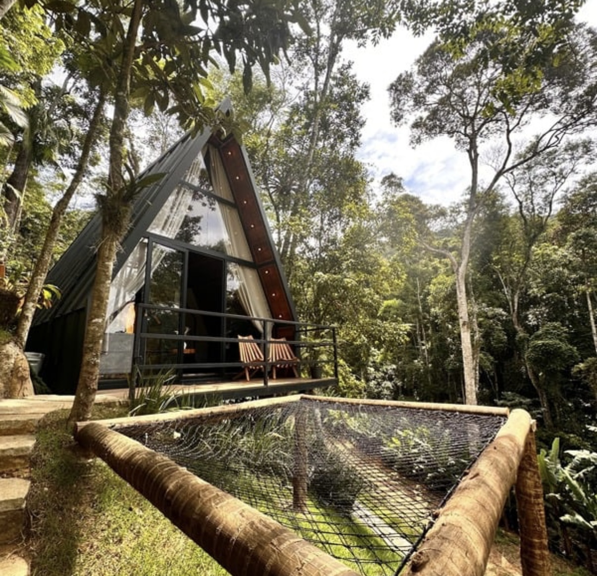 A cabana é composta por sauna, hidromassagem, rede suspensa, garagem, lareira interna e externa, Wi-Fi, churrasqueira, ar condicionado, tv com streaming e todos utensílios de cozinha como kit de founde, panelas, talheres, taças e copos.