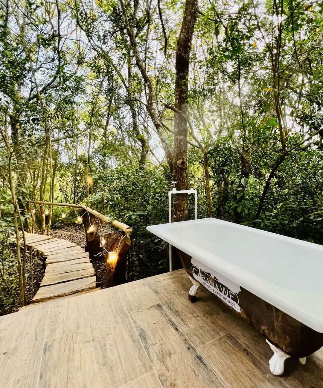 Viva a experiência de dormir olhando as estrelas, ande sobre uma rede horizontal posicionada em meio à copa das árvores, o banheiro tem paredes de vidro, a cortina automática se transforma em um cinema.