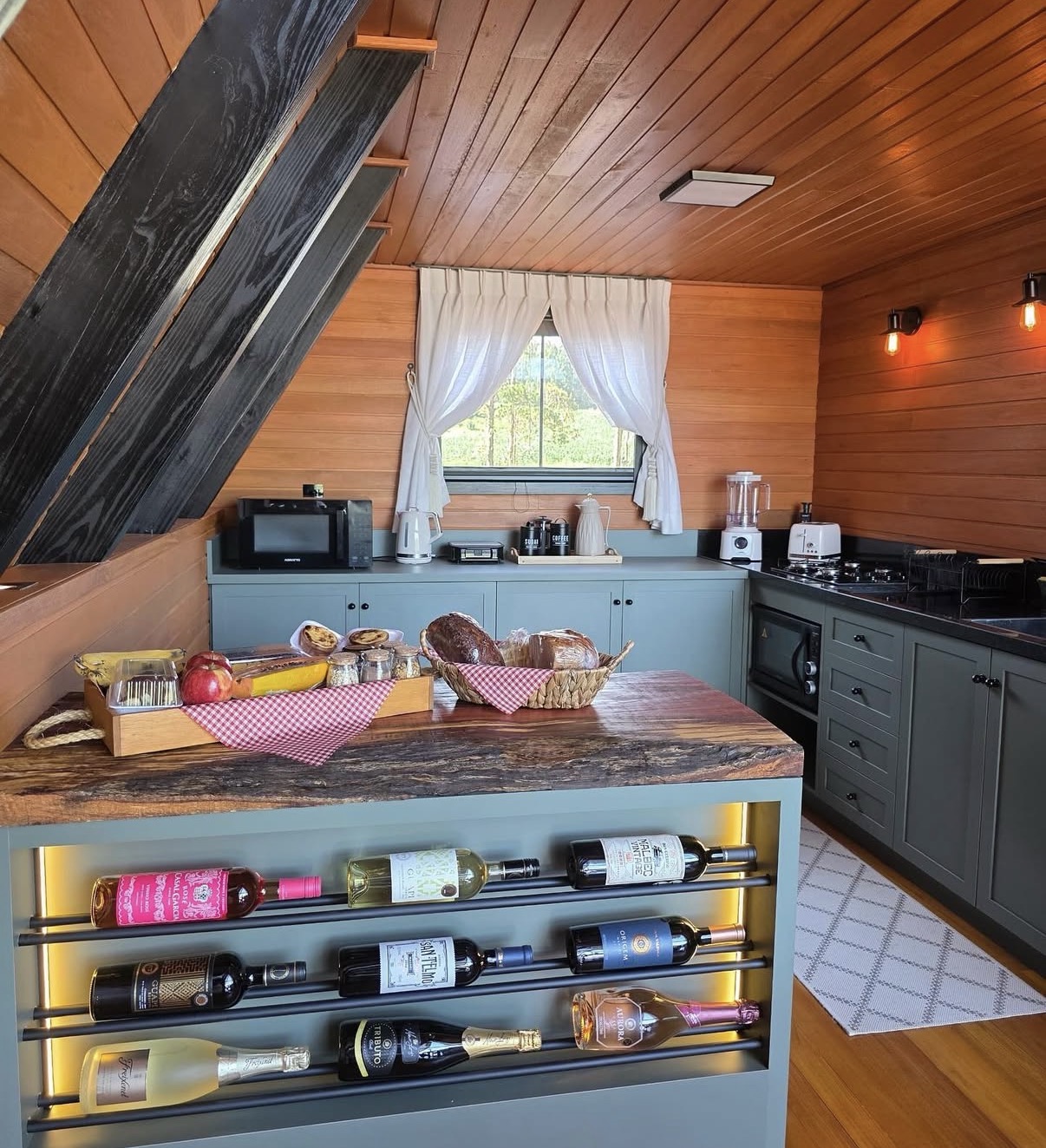 Conta com cozinha equipada, climatização, cama e sofá confortáveis, frigobar, adega, área gourmet externa com parrilla e cesta de boas-vindas com itens especiais para lanche da tarde e café da manhã. A experiência inclui kit de pesca esportiva, passeio de pedalinho e quadriciclo para explorar a propriedade.