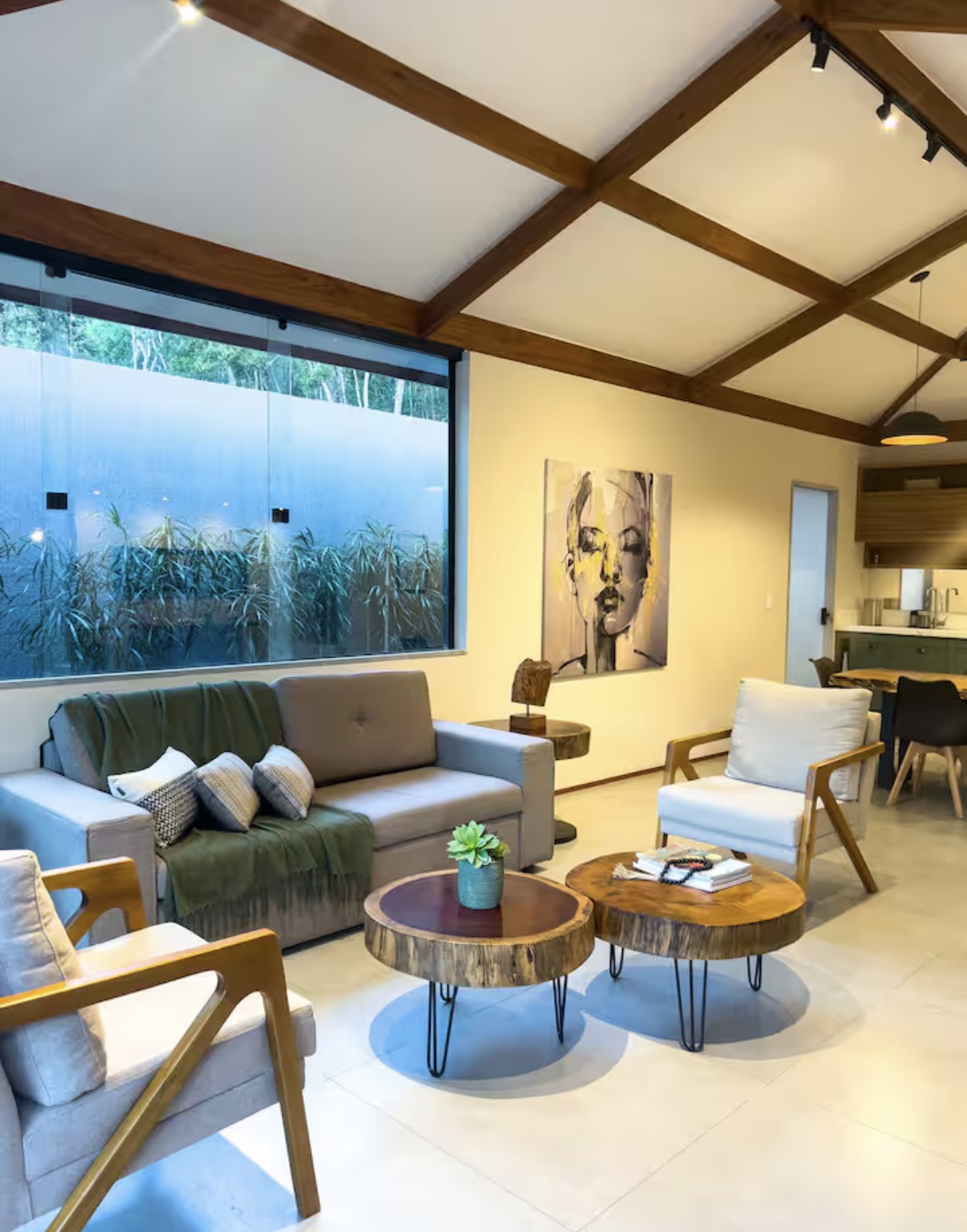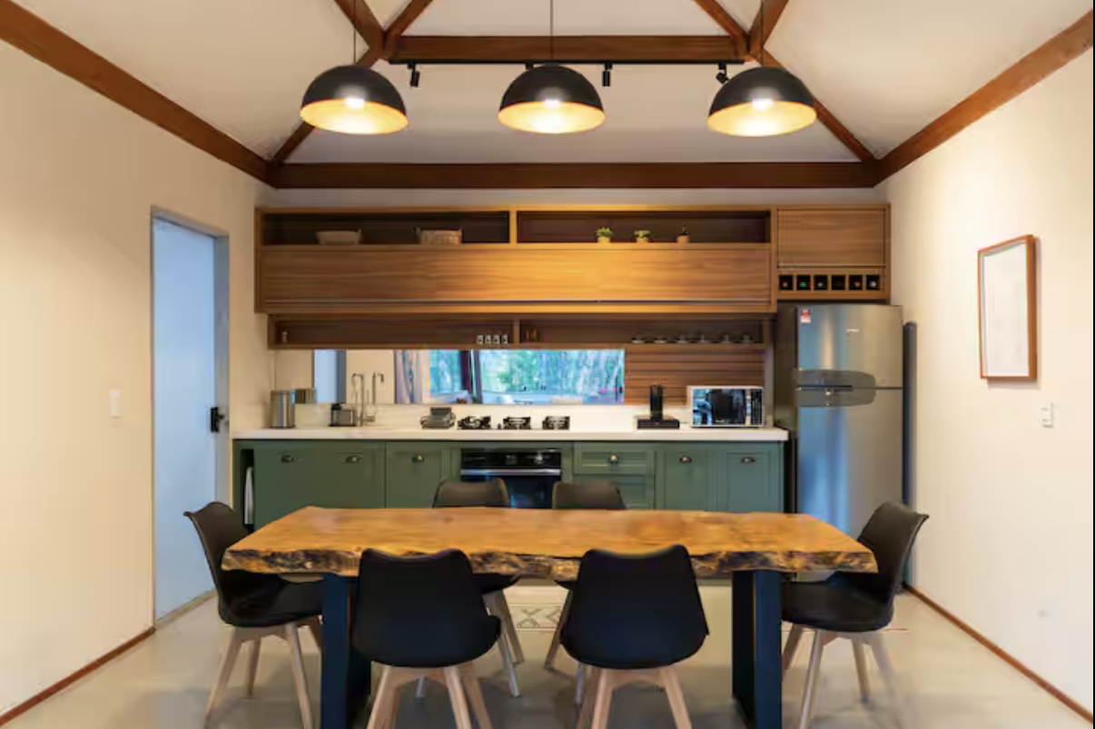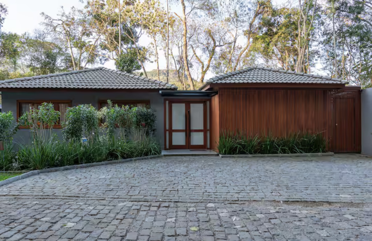 A Cabana da Serra é uma casa linear de alto padrão, construída no estilo rústico de cabana, ideal para quem busca conforto e contato com a natureza. Acomoda até 6 pessoas com tranquilidade e é composta por 3 quartos: uma suíte com cama de casal, um quarto com cama de casal e outro com duas camas de solteiro.
