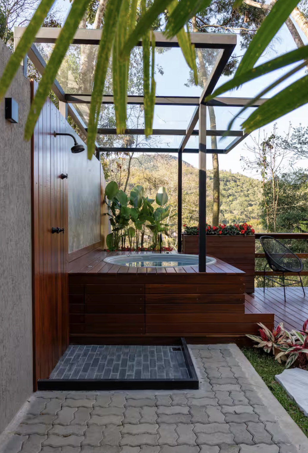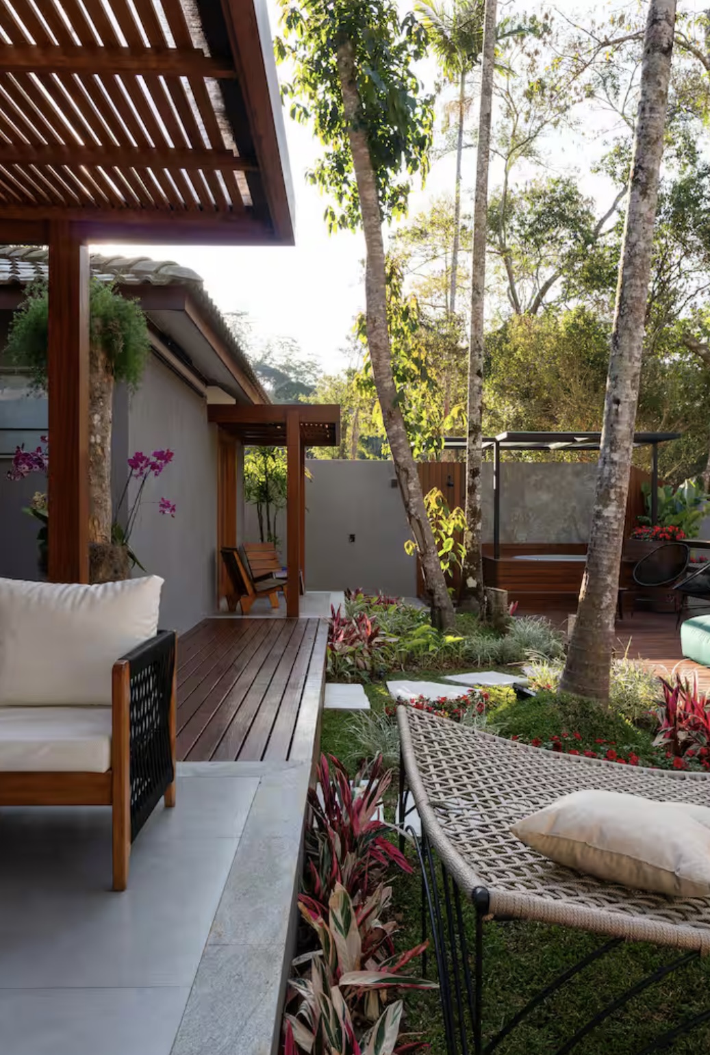 Um dos grandes diferenciais da casa é o cinema ao ar livre, localizado na área externa privativa, que também conta com um belo jardim, rede para contemplar o céu estrelado, hidromassagem e churrasqueira — o espaço perfeito para relaxar e curtir momentos especiais.