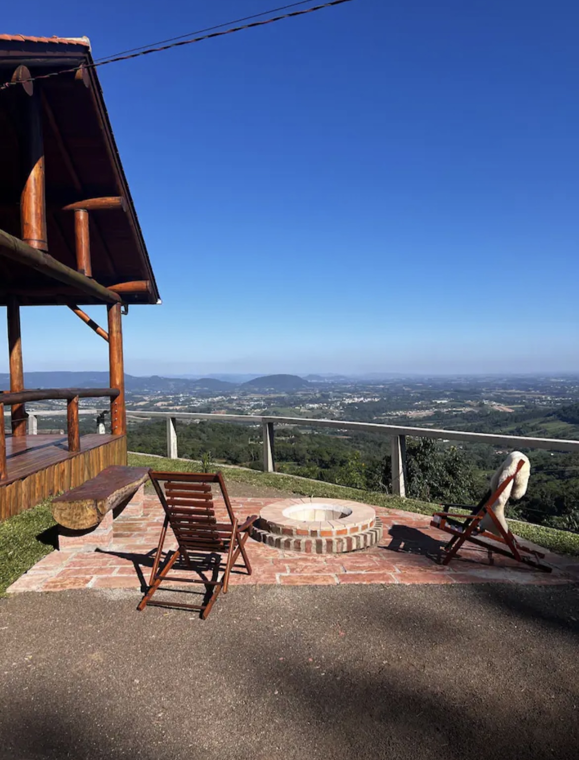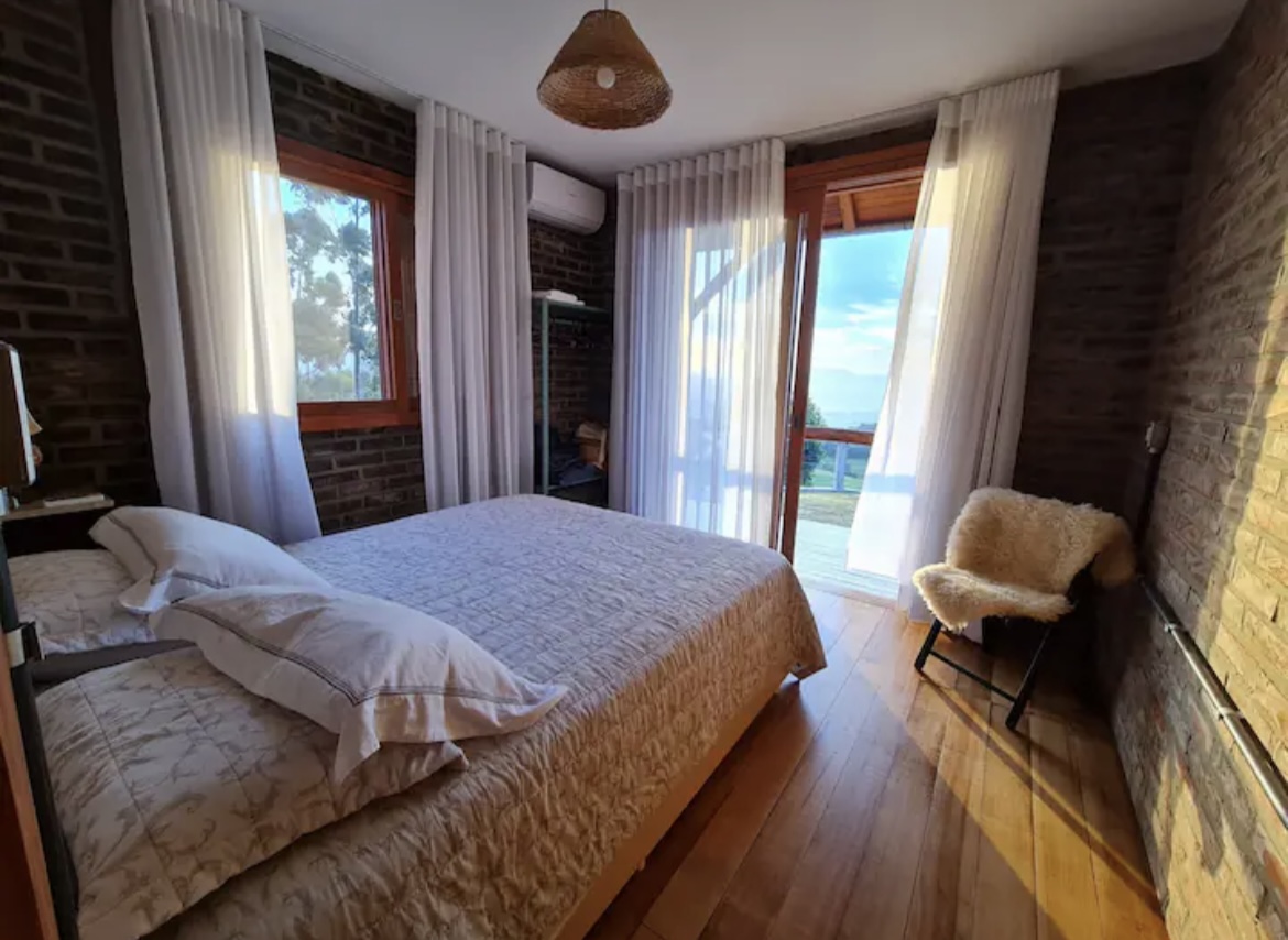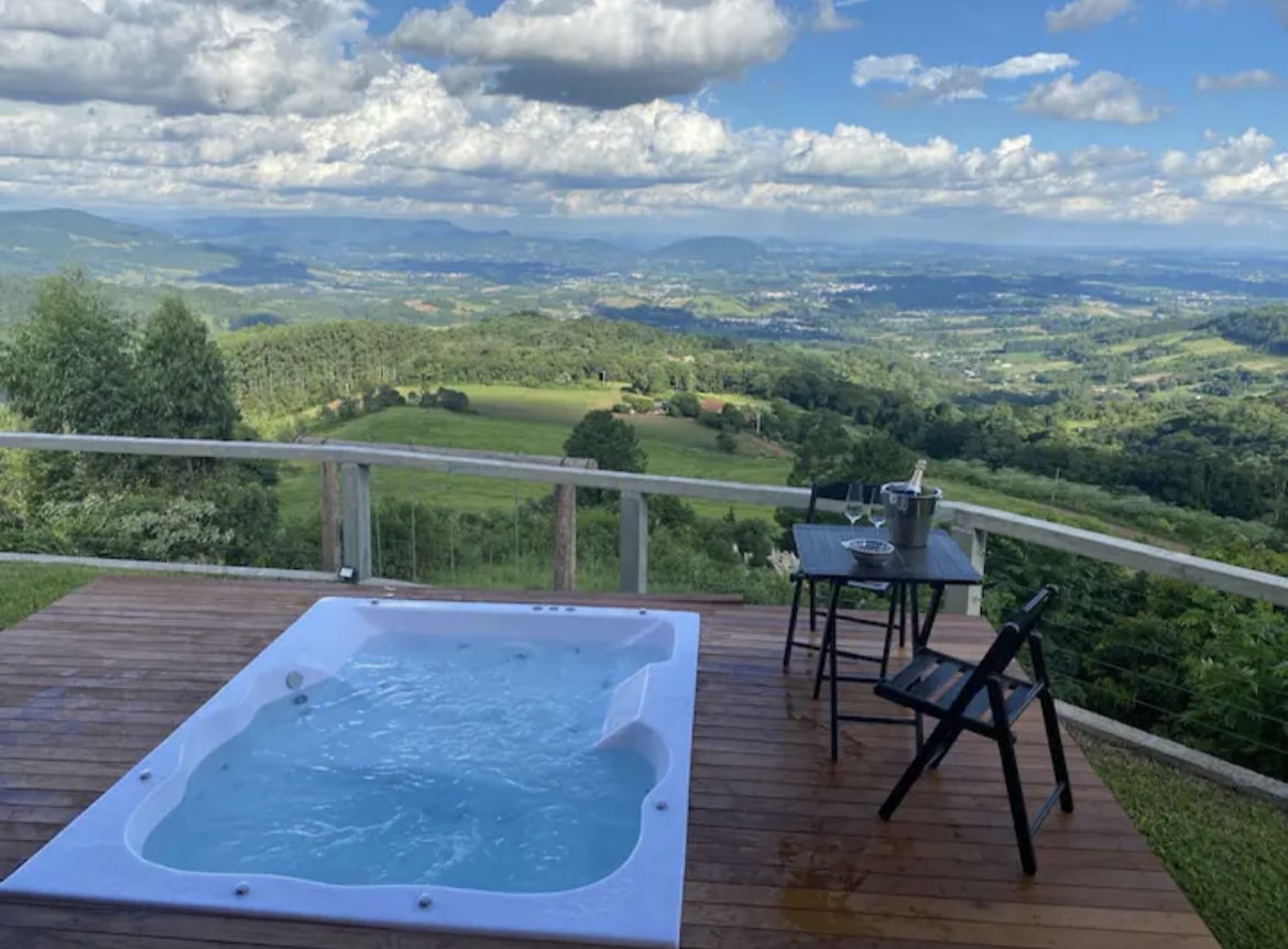 Entre os destaques, estão a banheira de hidromassagem externa posicionada em frente à cabana, cozinha equipada com fogão a lenha e a gás, além de churrasqueira. Conta também com smart TV, chuveiro elétrico, área externa ampla e vista panorâmica para o Vale do Taquari e cidades vizinhas, proporcionando momentos únicos de descanso e contemplação.