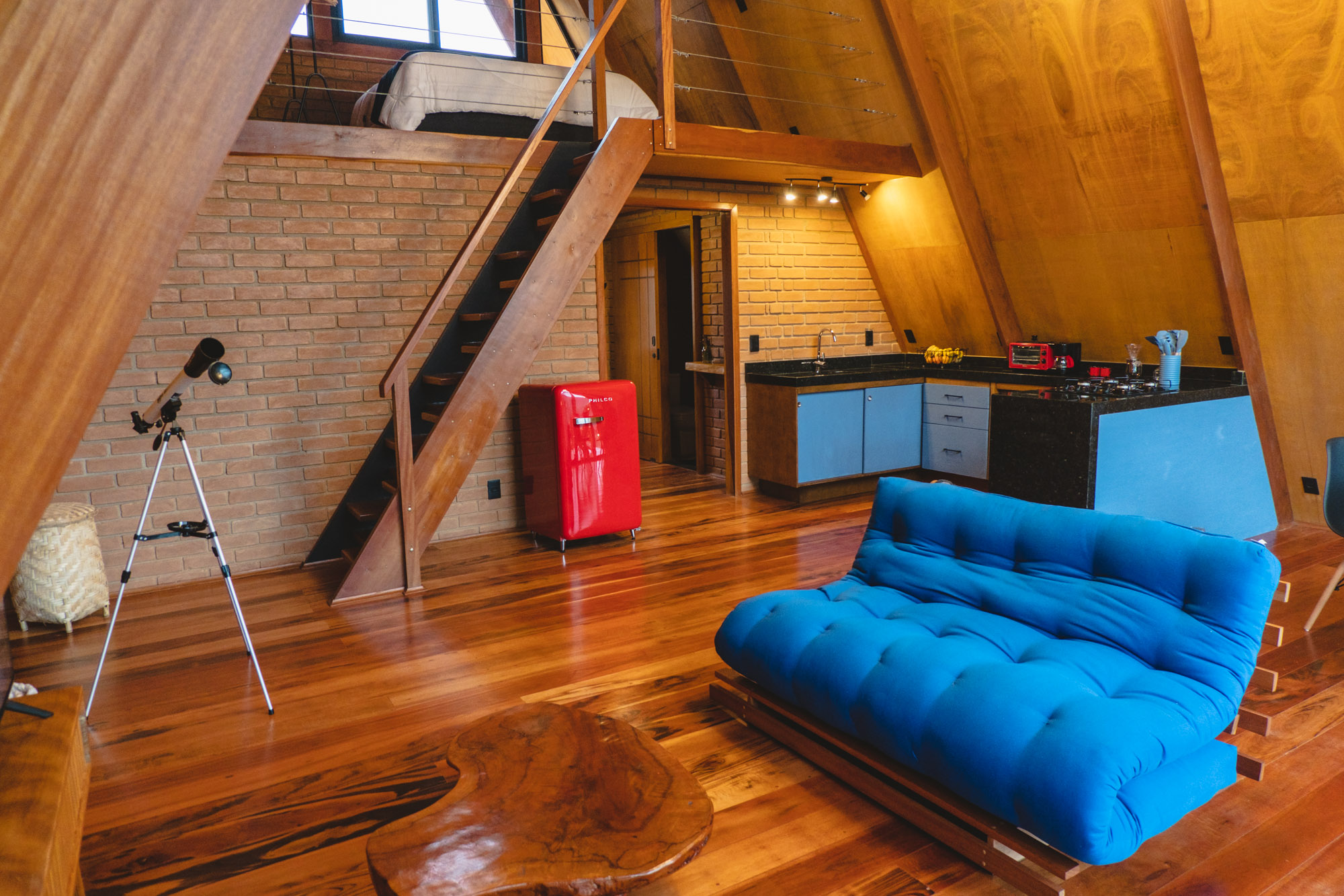 A cabana possui uma sala de banho exclusiva com banheira de hidromassagem com vista e chuveiro a gás quentinho, lareira, cozinha completa, roupa de cama e banho padrão hotel, mezanino com cama queen e colchão Emma Original, área externa com gramado e fogo de chão (para churrasco campeiro) e um deck suspenso para curtir a brisa da montanha. A cabana também dispõe de pipoqueira e TV 43' 4k com Netflix para assistir filmes no futon Tsuruya. É a única cabana da região que inclui um telescópio para apreciar as noites estreladas.