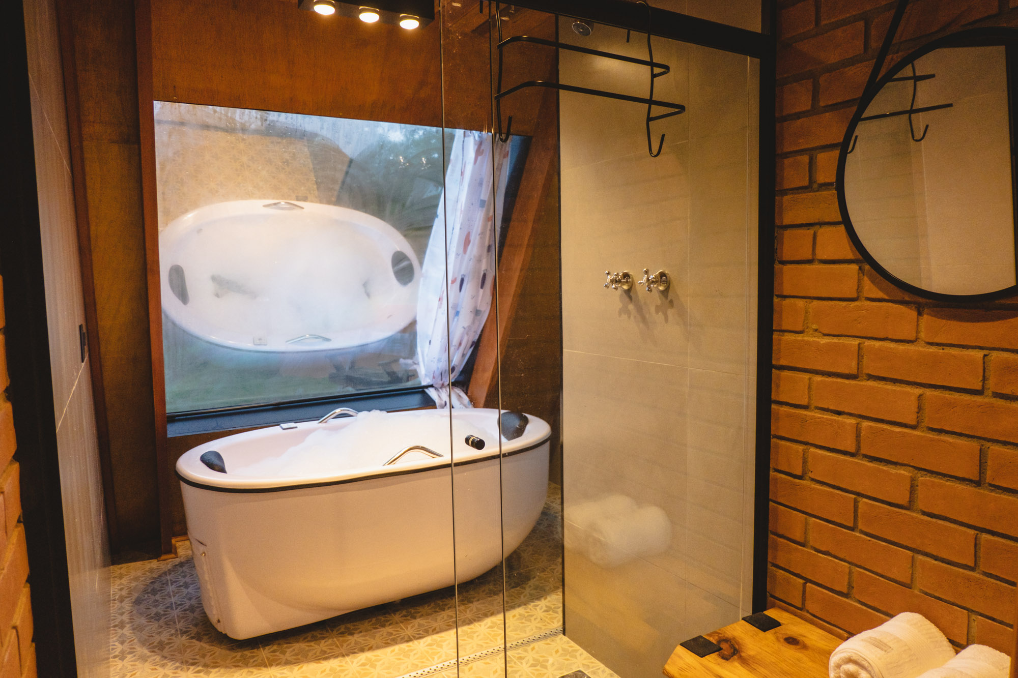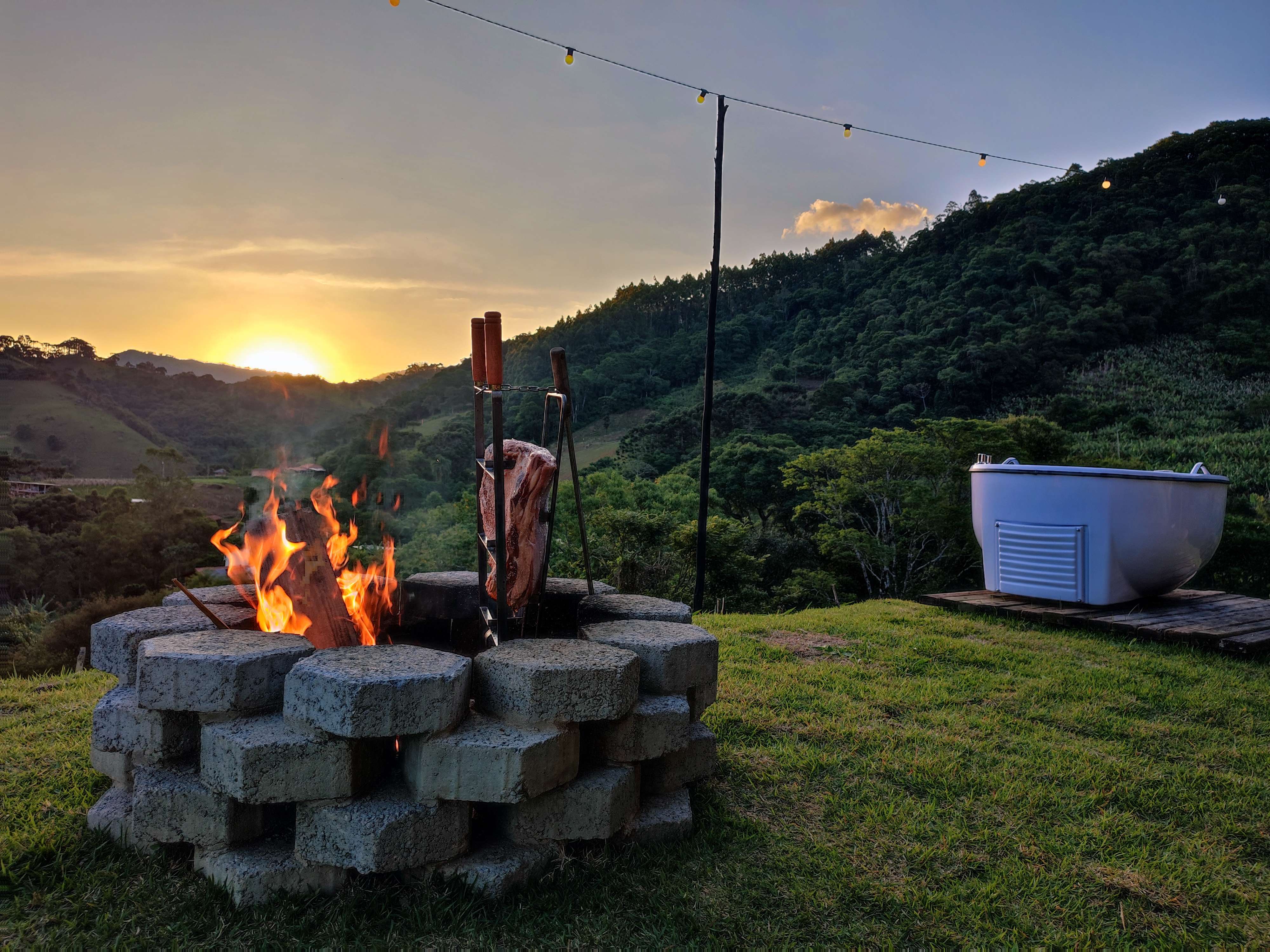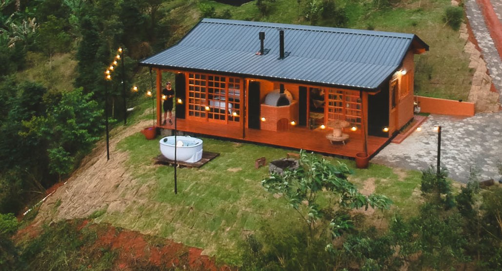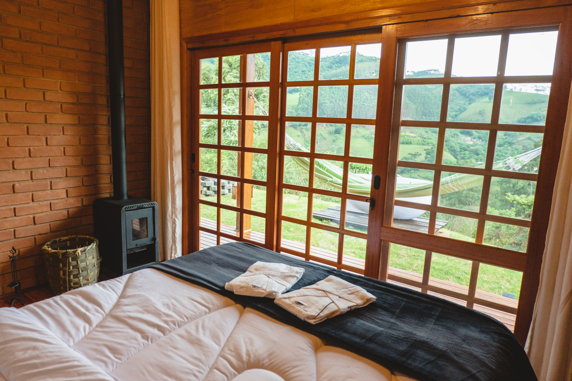 A cabana é do tipo Americana (50m2) com banheira externa com vista 360 graus de tirar o fôlego. A varanda possui rede e forno de pizza, mesa e cadeiras para fazer refeições apreciando pássaros e a paisagem das montanhas. A área externa é toda gramada e equipada com um fogo de chão para fazer churrasco campeiro. A cozinha é completa e a sala é integrada com TV 4k de 43' com Netflix (+ pipoqueira) e sofá-cama. A suíte possui cama queen e colchão Emma Original, roupa de cama e banho padrão hotel, banheiro espaçoso com ducha quentinha de alta pressão a gás.