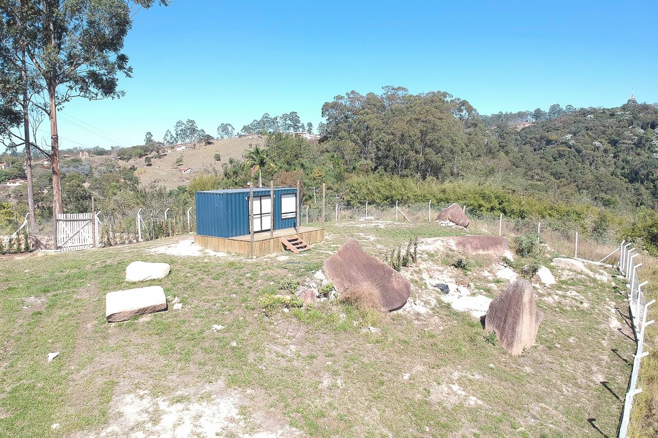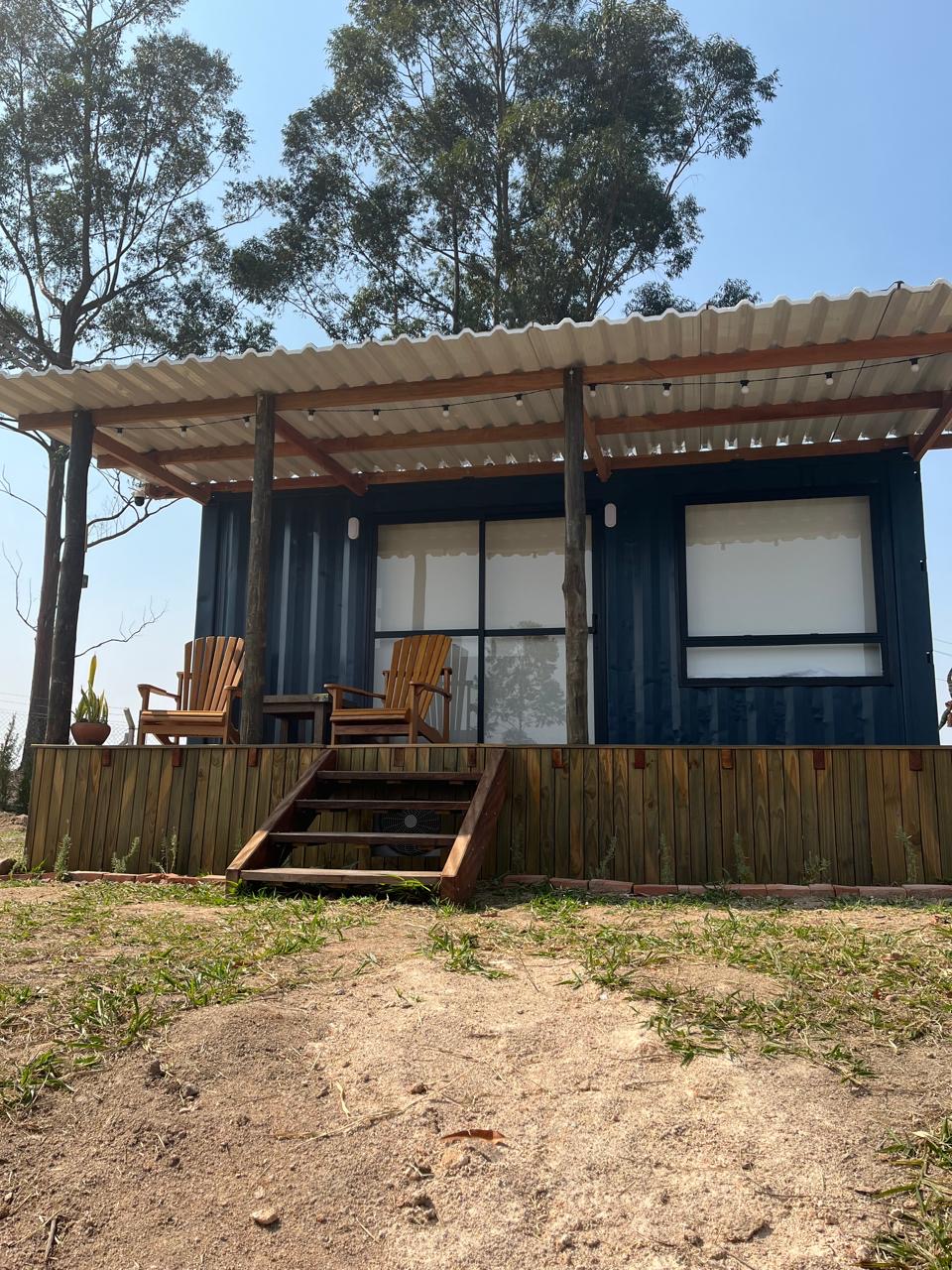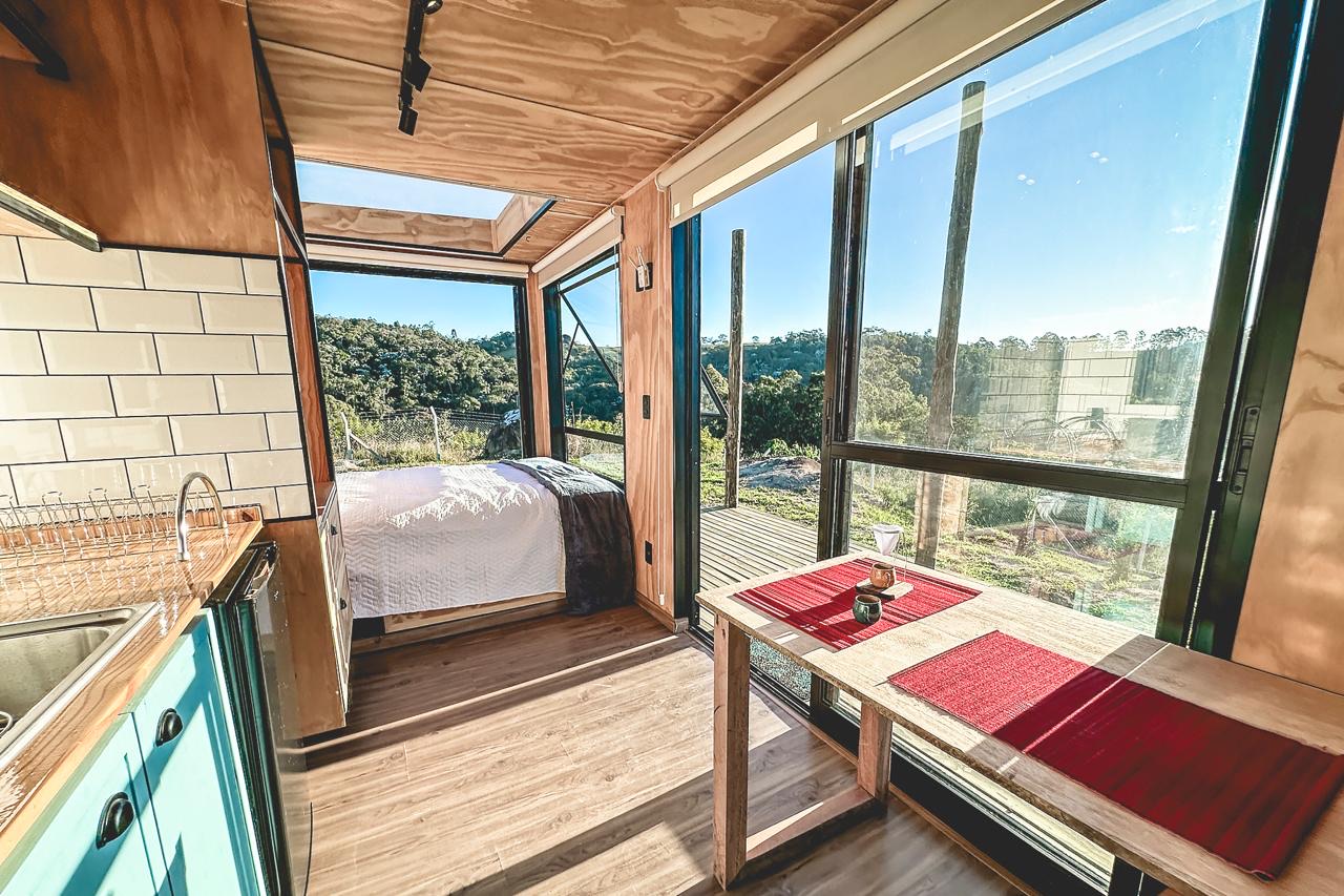 A vista da cabana é para uma floresta e rodeada de montanhas em um local muito seguro.