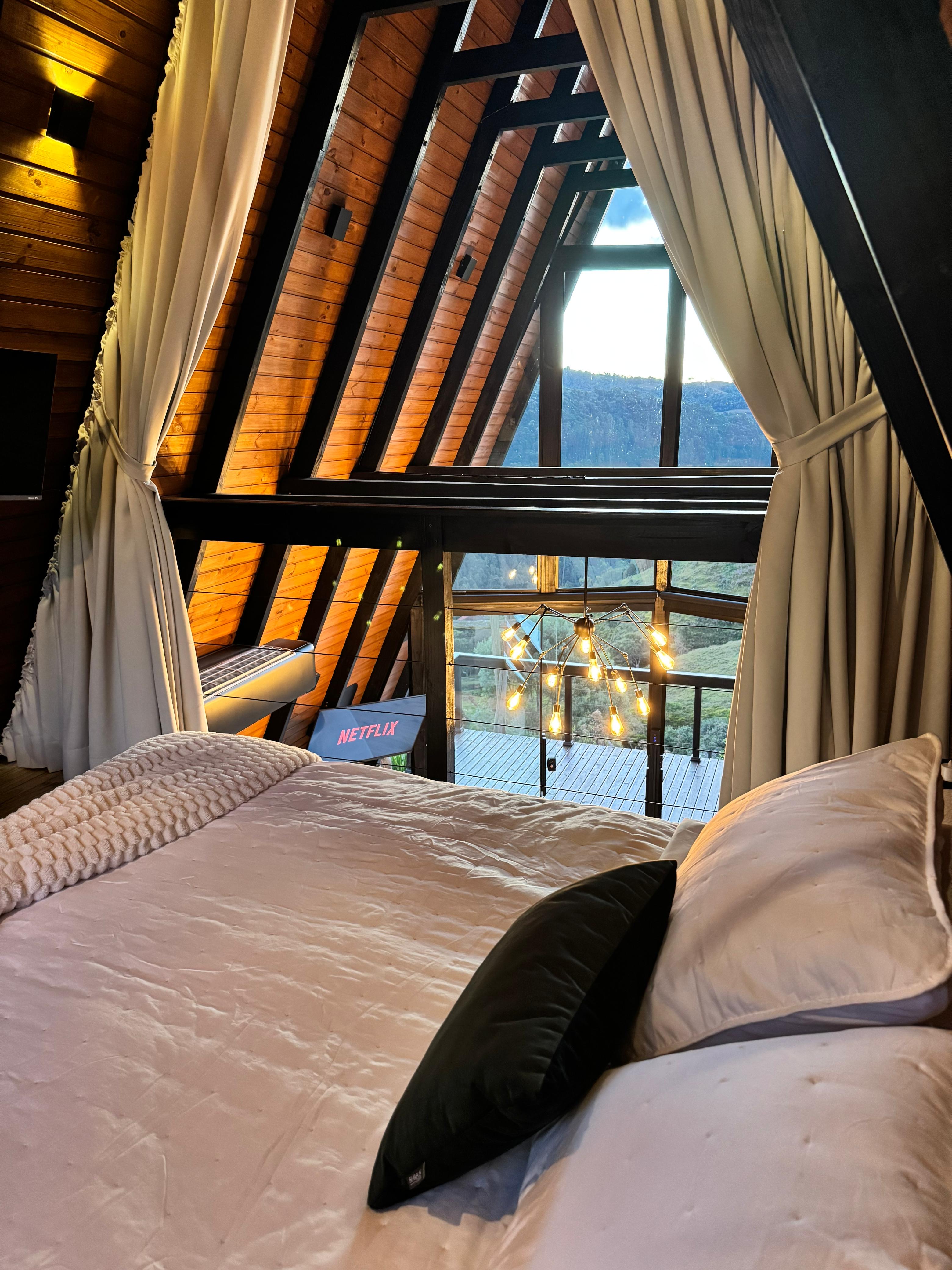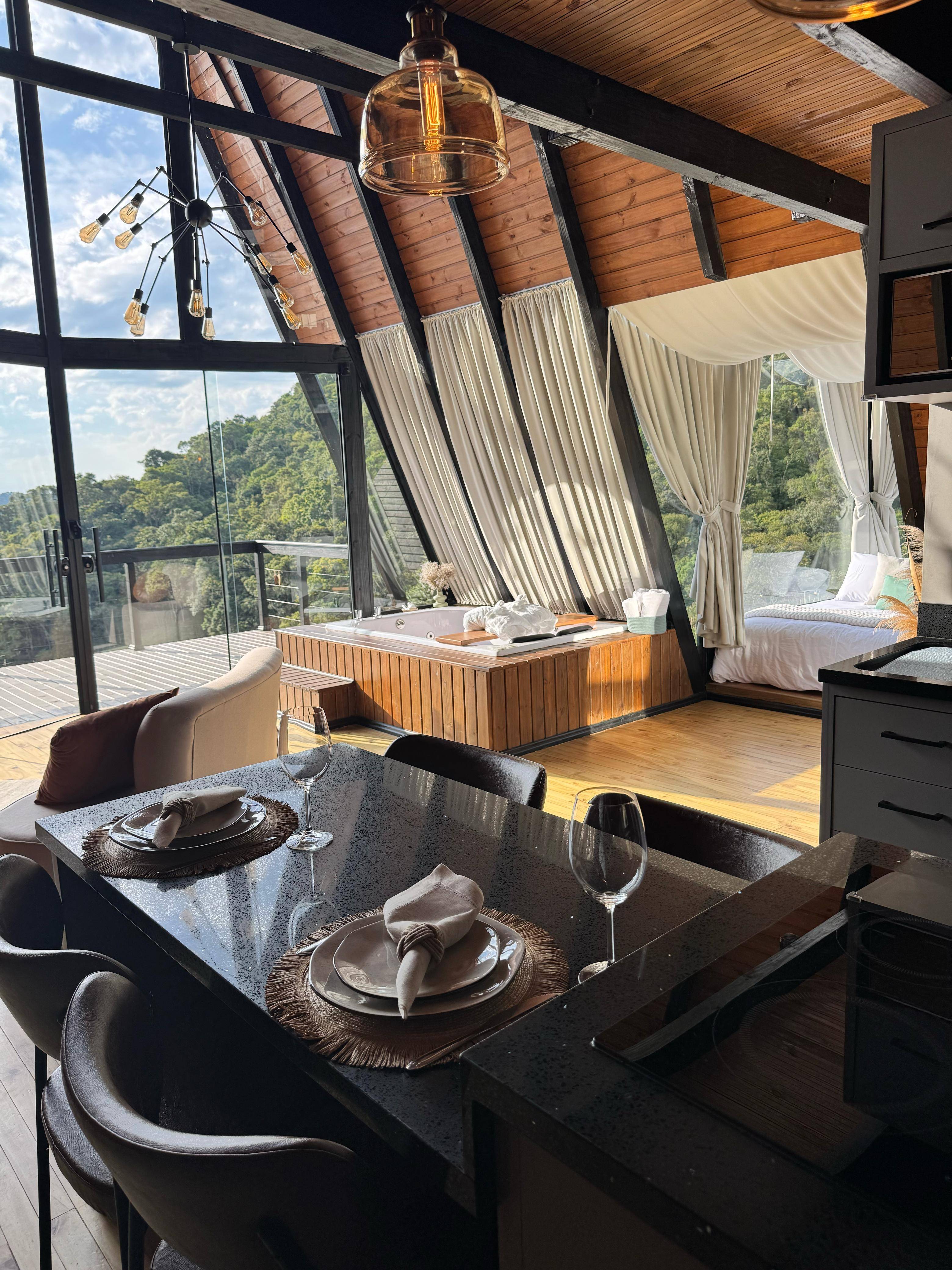 • Quarto de vidro: durma sob as estrelas e acorde cercado pela natureza. O ambiente é equipado com cortinas blackout, garantindo privacidade e conforto.