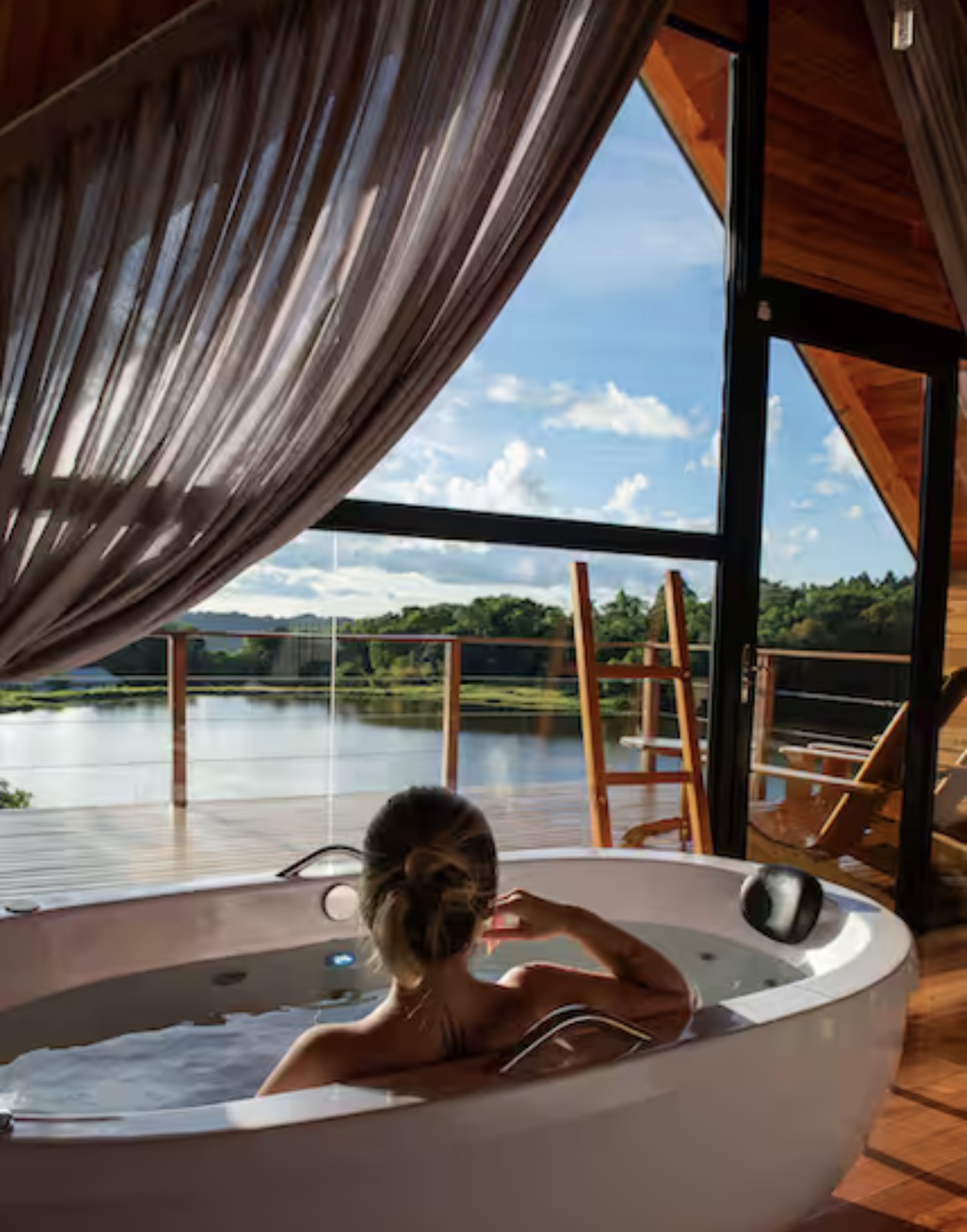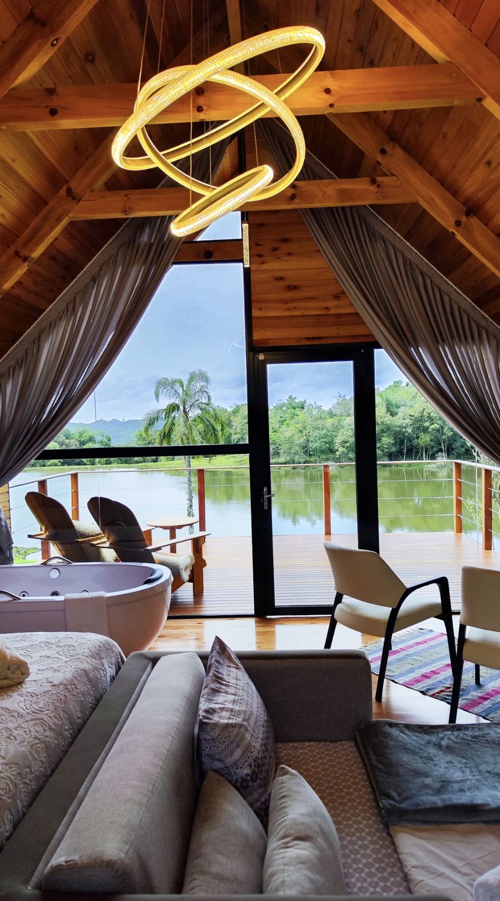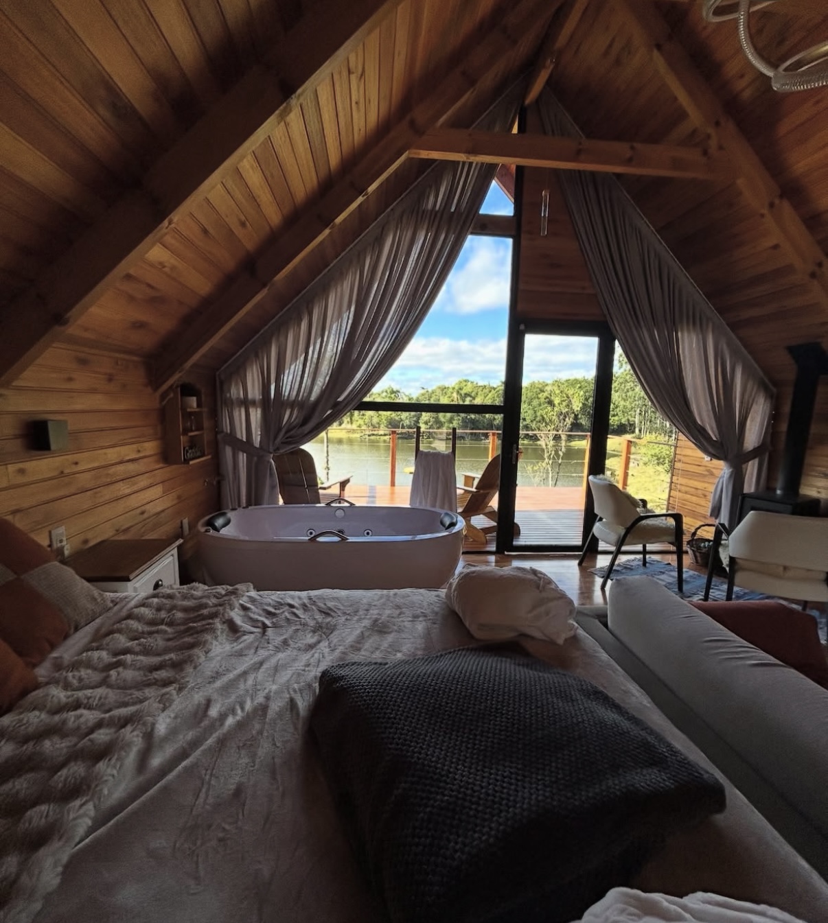 A suíte dispõe de cama queen, ar-condicionado e uma banheira de hidromassagem com cromoterapia, perfeita para relaxar enquanto aprecia a paisagem. O banheiro é equipado com chuveiro a gás, secador de cabelo, roupões e enxoval de cama e banho de alta qualidade. O deck externo, mobiliado com cadeiras confortáveis, oferece uma vista deslumbrante para o lago e para a vegetação ao redor, tornando cada momento ainda mais especial e memorável.