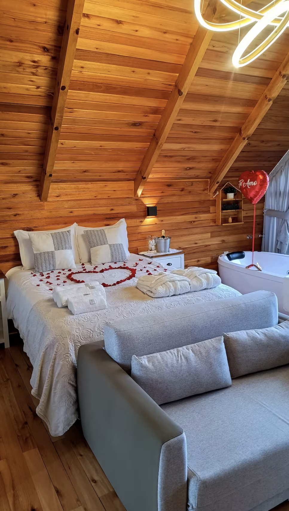 A cabana oferece o equilíbrio perfeito entre o charme rústico e o conforto do moderno, criando um refúgio acolhedor em meio à natureza da Serra Gaúcha. O espaço conta com cozinha completa, equipada com fogão por indução, micro-ondas, forno elétrico, geladeira, cafeteira, chaleira elétrica, torradeira e utensílios diversos, além de taças para vinho, espumante e cerveja. A sala ampla e aconchegante possui smart TV, calefator chileno e um ambiente que convida a momentos românticos e de descanso.