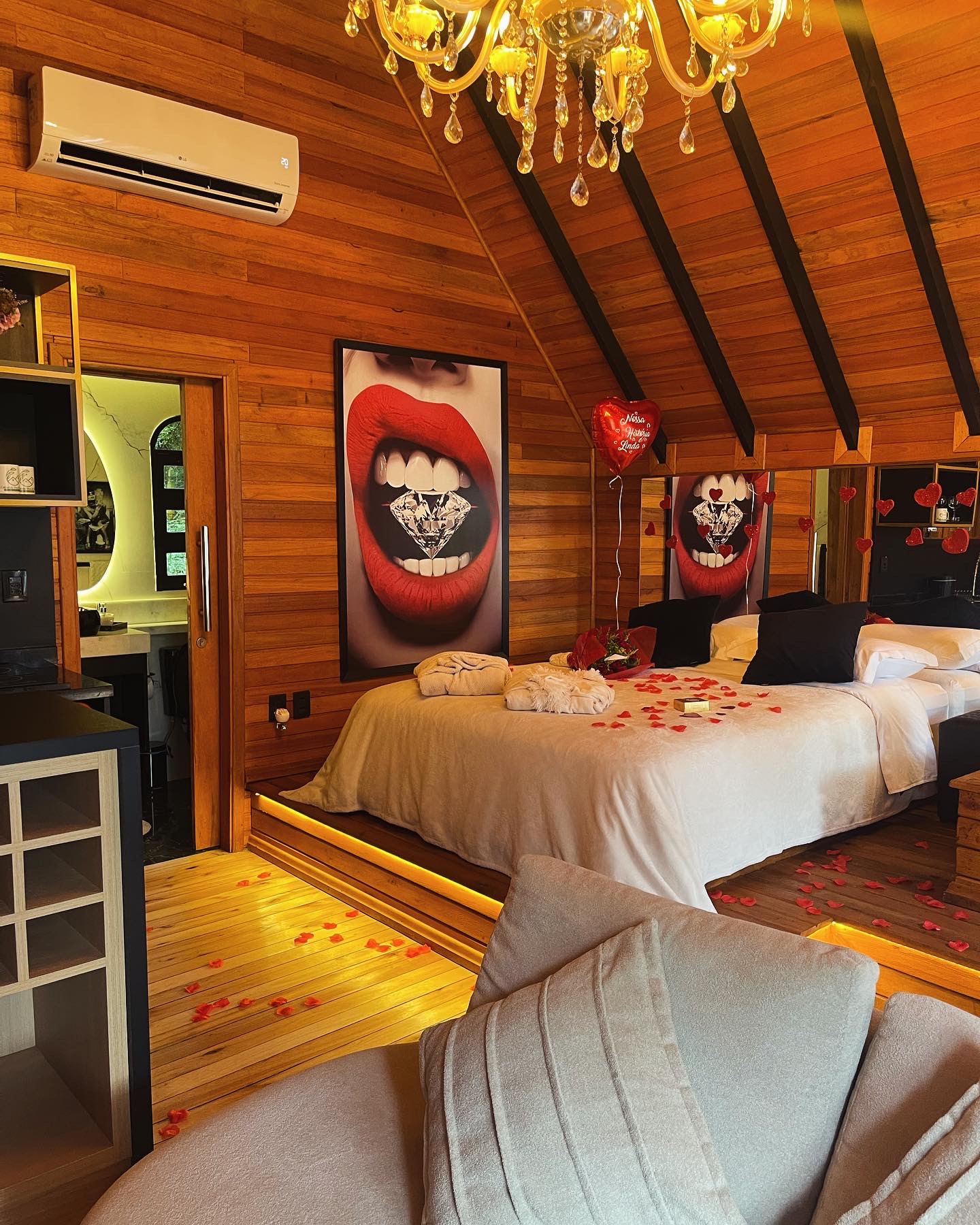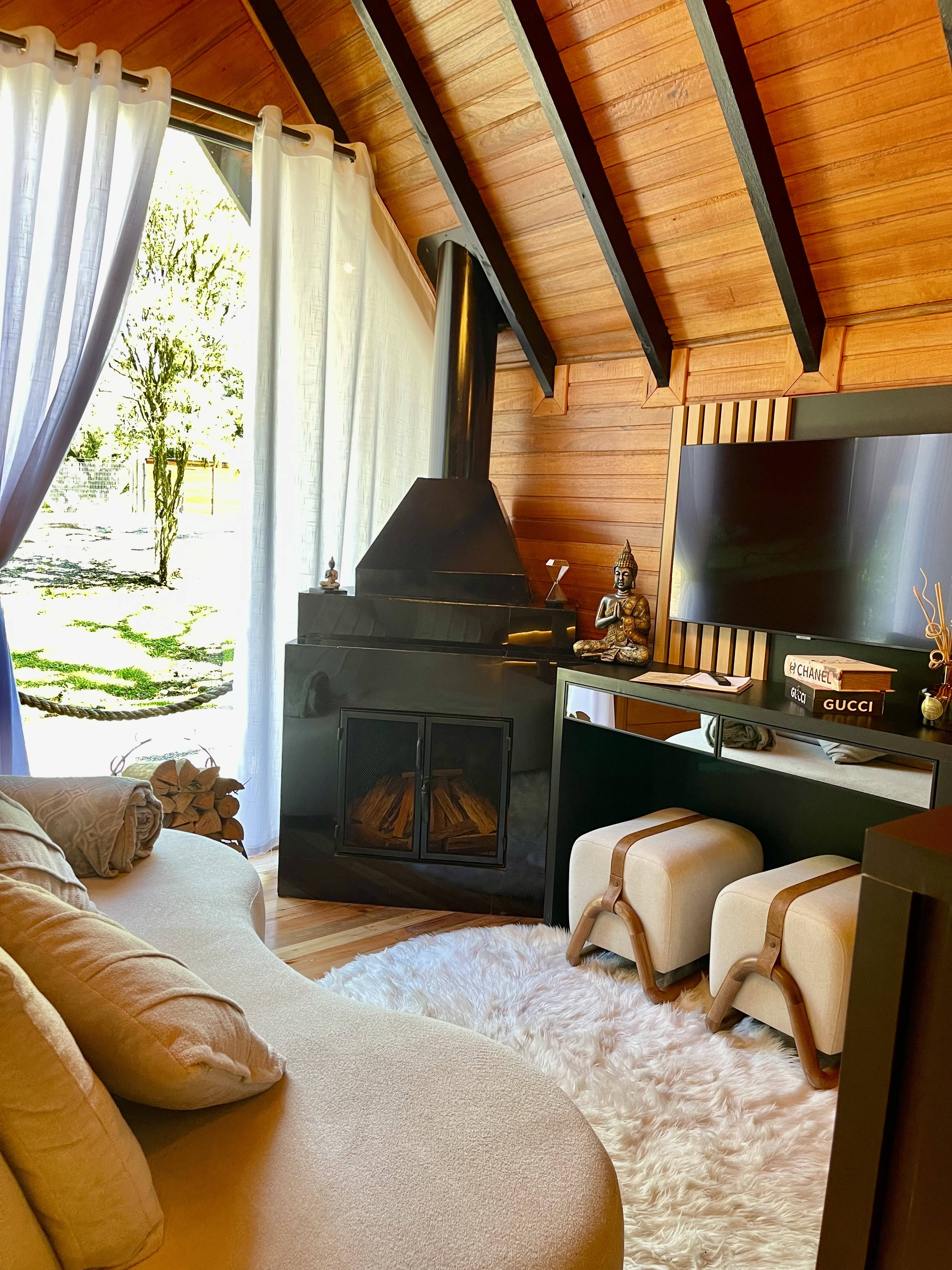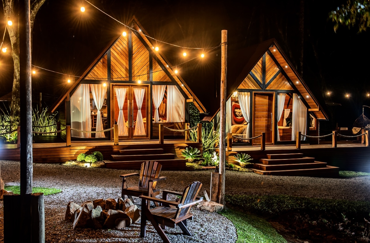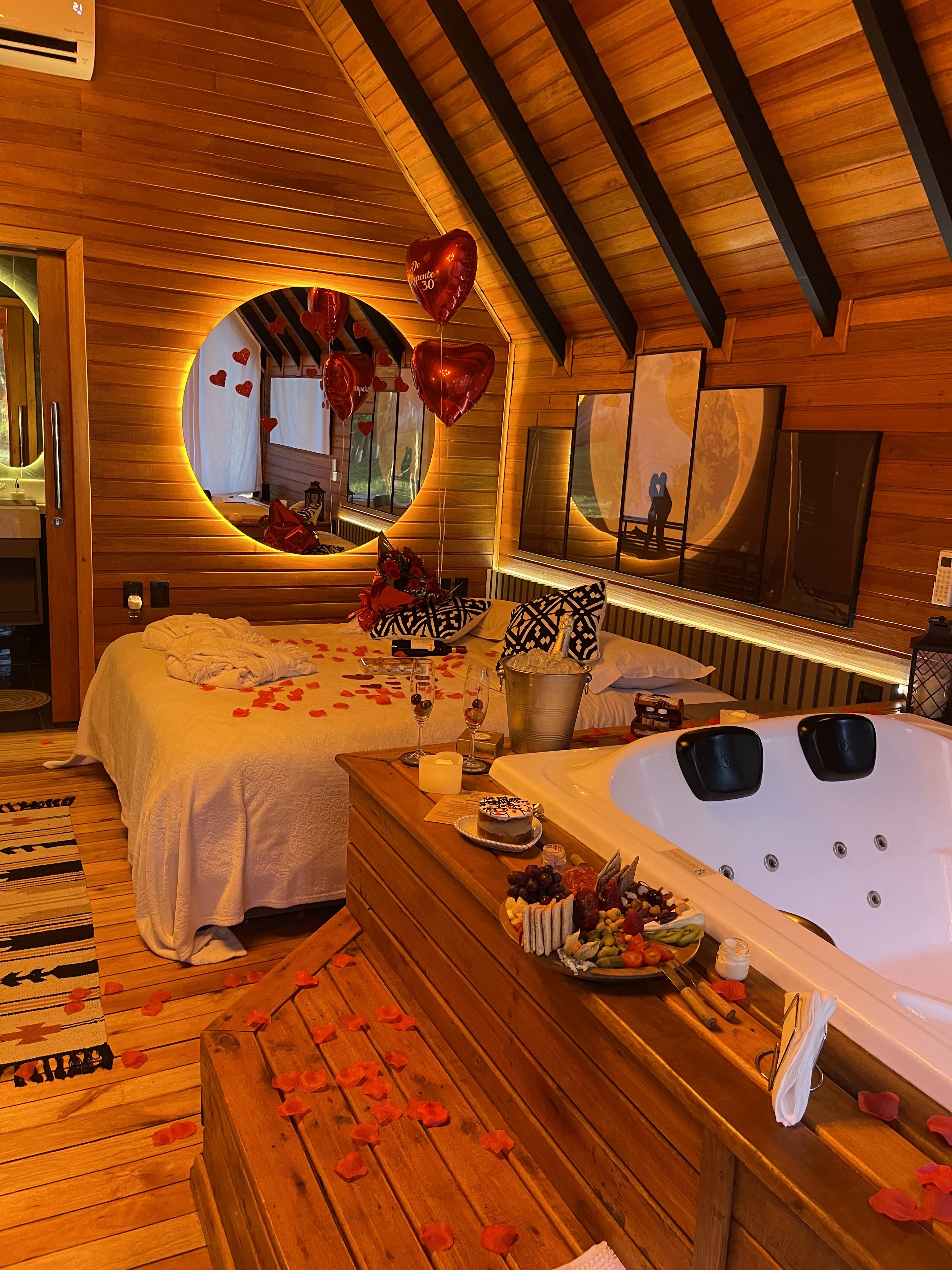 As cabanas da Serra Gaúcha oferecem uma experiência romântica e luxuosa, pensada com cuidado e carinho. Ao chegar, o casal é recebido com uma tábua de frios e uma espumante Chandon na temperatura ideal, acompanhada de frutas da estação e Ferrero Rocher. Cada cabana conta com banheira de hidromassagem com cromoterapia, lareira a lenha, cama Queen Size e chuveiro a gás com cromoterapia, criando um ambiente perfeito para o relaxamento. Pela manhã, uma cesta de café da manhã é entregue na porta, podendo ser desfrutada tanto no interior quanto no deck, com vista para o bosque, em um espaço aconchegante e luxuoso. Uma experiência única em meio à natureza, com atendimento de excelência.