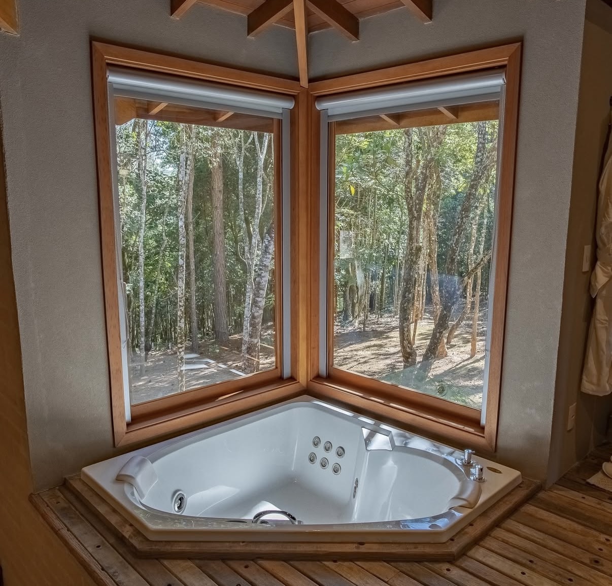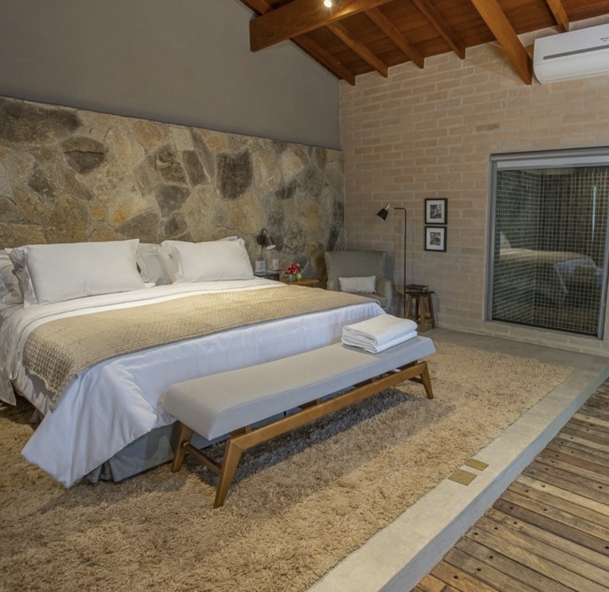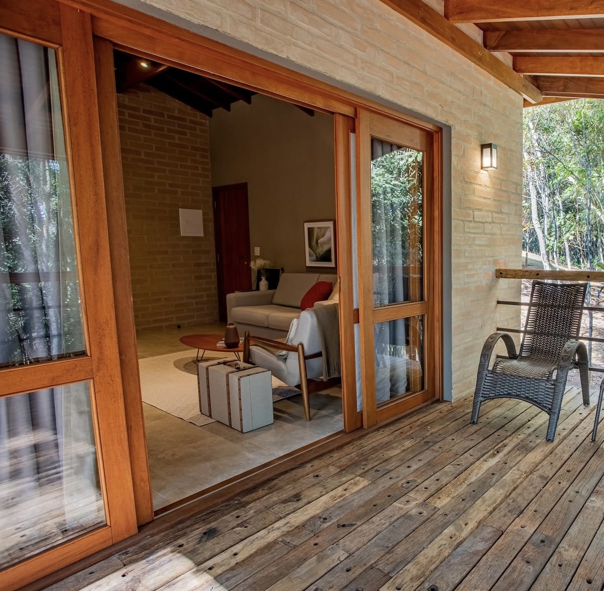 São oito chalés entre 80 m² e 110 m², projetados no conceito open-space e equipados com cama king-size, sofá-cama de casal, lareira, banheira de hidromassagem, sala de banho, varanda, frigobar e TV de 43'. Cada unidade acomoda até três pessoas com máximo conforto e privacidade. O ambiente proporciona uma experiência de hospedagem diferenciada, unindo elegância, charme e total integração com a natureza.