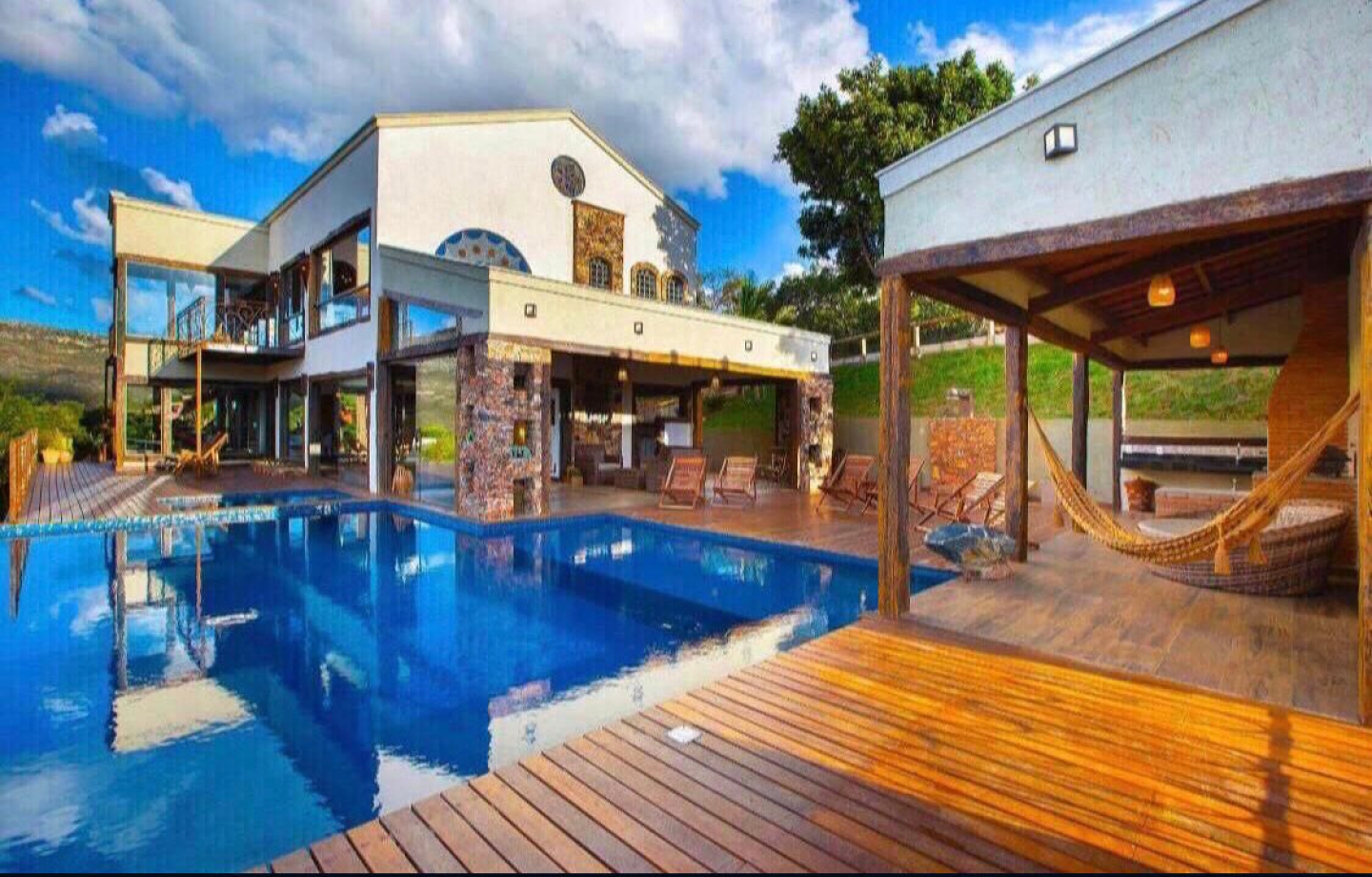 A Casa Jatobá combina elegância e exclusividade em uma localização privilegiada, a apenas 10 minutos a pé da vila de Lapinha da Serra. Situada no Sítio Jatobá, oferece uma estrutura sofisticada com dois andares, 6 suítes e capacidade para até 12 pessoas. O andar superior conta com 4 suítes, sendo 2 com hidromassagem, além de uma sala espaçosa. No térreo, encontram-se 2 suítes, sala ampla integrada à cozinha completa, deck, área de churrasco, piscina e ofurô. Acomodações incluem roupas de cama, toalhas e vistas deslumbrantes, além de acesso direto à lagoa.