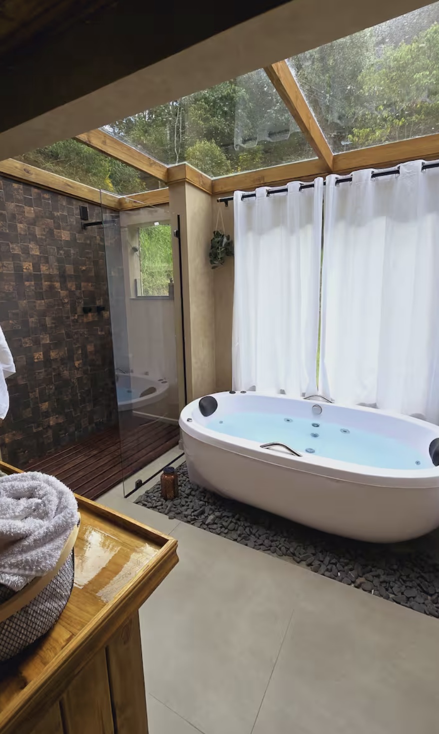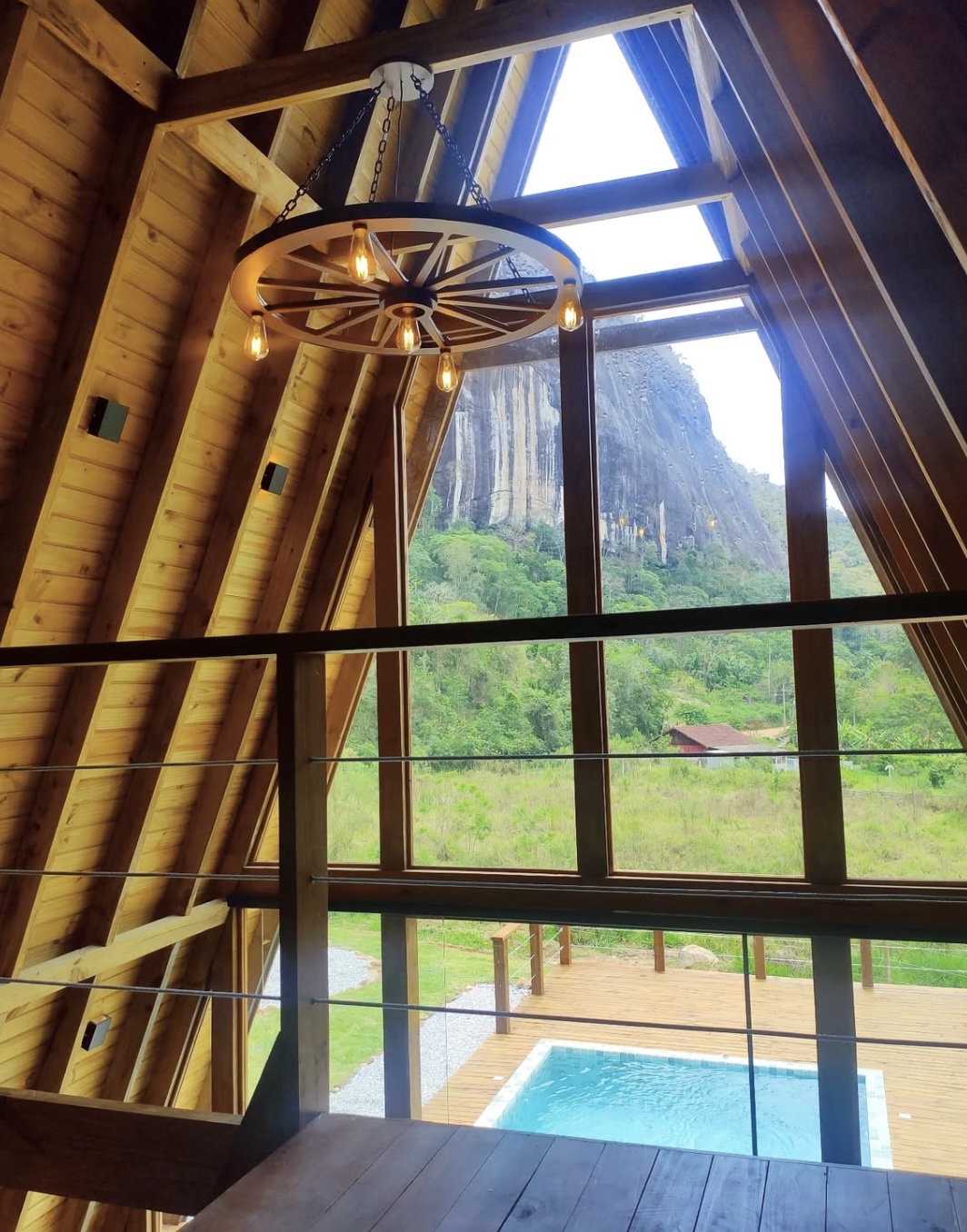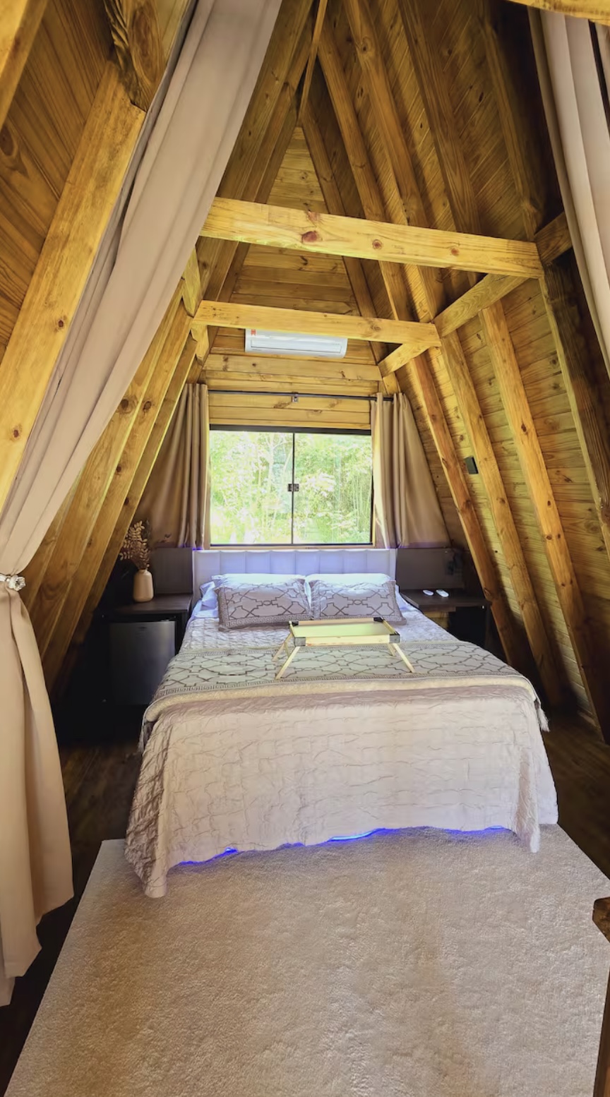 Com arquitetura A-frame e rodeado pelas montanhas, este chalé exclusivo proporciona uma experiência acolhedora e tranquila em meio à natureza. Ideal para casais, o espaço foi projetado para oferecer conforto em cada detalhe, com lareira, cama aconchegante e vista deslumbrante que convida à contemplação. A atmosfera serena e o design sofisticado tornam a estadia envolvente e memorável.