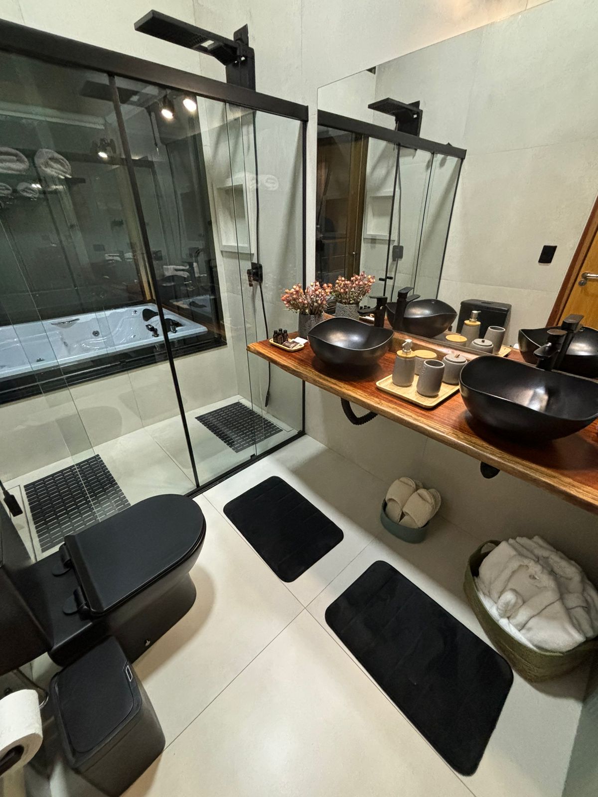 ● Banheiro privativo com chuveiros e lavatórios com água quente e fria, ducha higiênica, roupões, toalhas, amenities inclusos (shampoo, condicionador, sabonete, mouse e sais de banho) e secador de cabelo disponível;