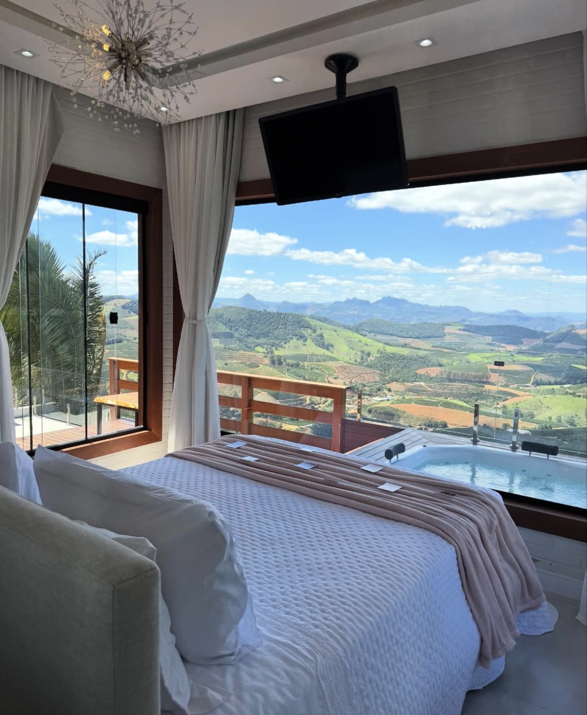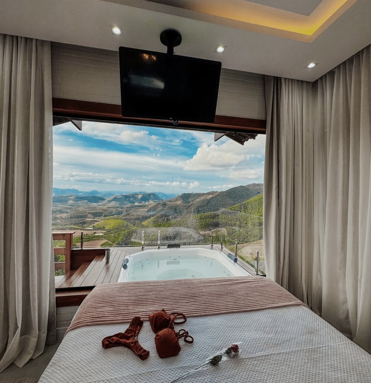 Ar condicionado Secador de cabelo TV a cabo / Smart TV Jacuzzi / Ofurô / Banheira Coberta Frigobar Lareira Máquina de Café Enxoval de Luxo (+ Roupão e Pantufa) Sauna Cozinha Estação de trabalho (mesa e cadeira) Piscina Aquecida ou climatizada Borda Infinita Coberta