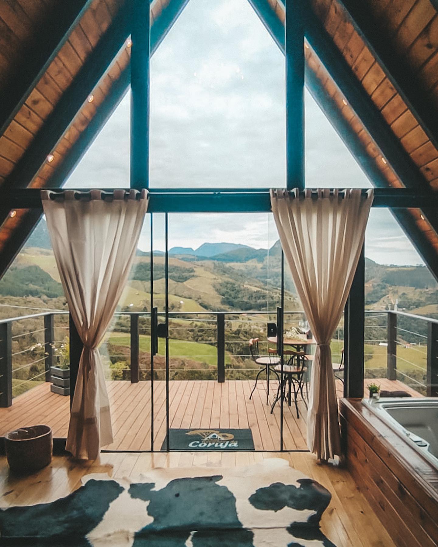 O espaço dispõe de piscina aquecida com tratamento de sal, banheira interna, lareira, churrasqueira a carvão integrada à área externa, cozinha completa, fogo de chão, adega privativa e sistema automatizado com assistente virtual, reunindo comodidade e bem-estar para uma estadia relaxante e especial.