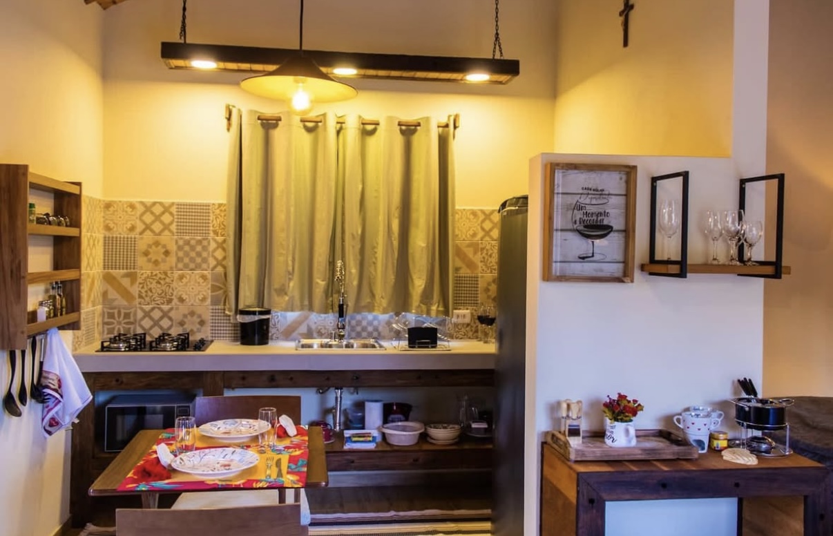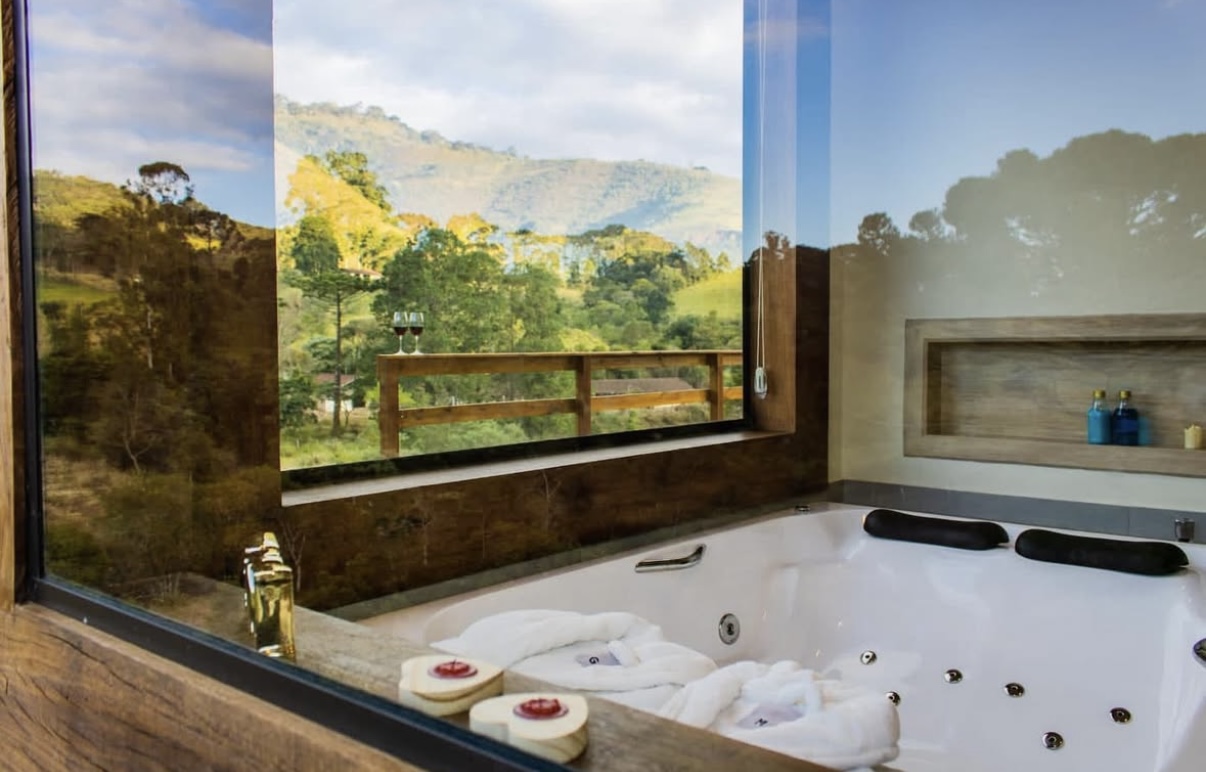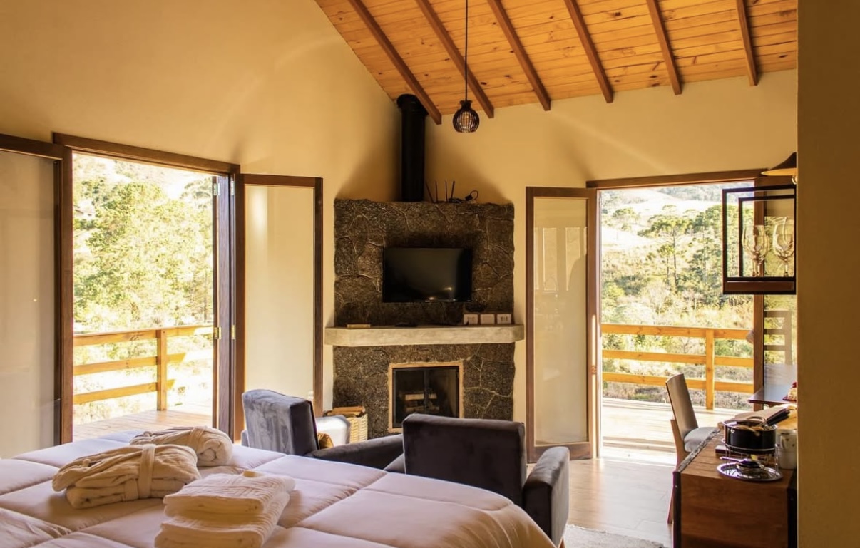 Chalé com Banheira de hidromassagem Piso aquecido Ar condicionado, Q/FCama king Roupa de cama e banho completo Cozinha equipada Secador de cabelo O espaço é todo cercado e preparado pra receber pets