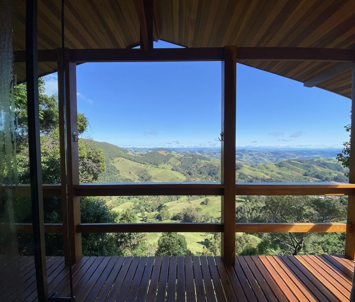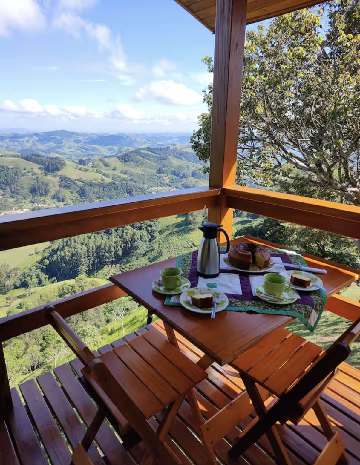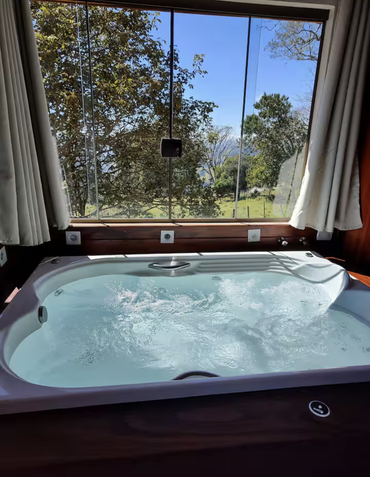 Trata-se de um chalé completo, com cozinha equipada, quarto com cama Queen, uma smartv, lareira, uma banheira de hidromassagem com água quentinha e o mais interessante: uma vista incrível, de tirar o fôlego! Todos que já passaram pelo chalé se encantaram com a beleza da natureza à sua volta. O local é visitado sempre por várias espécies de aves como seriema, tucanos, canário da terra, pica pau, entre outros.