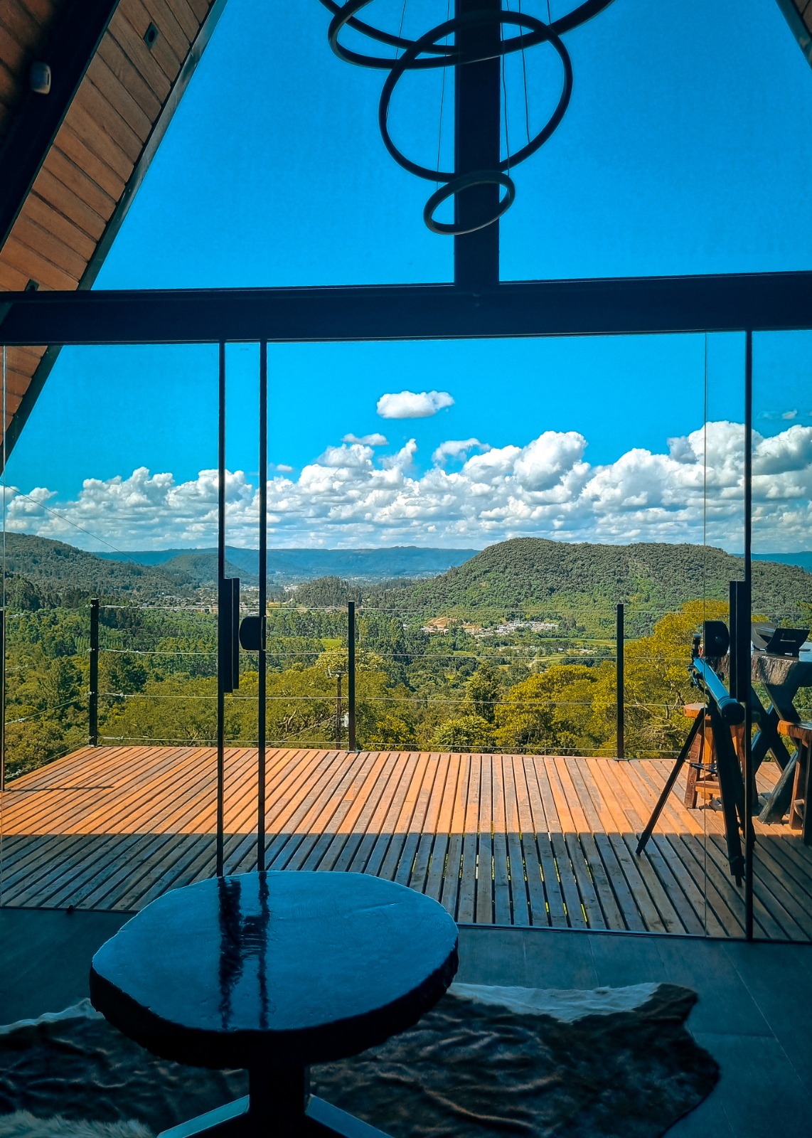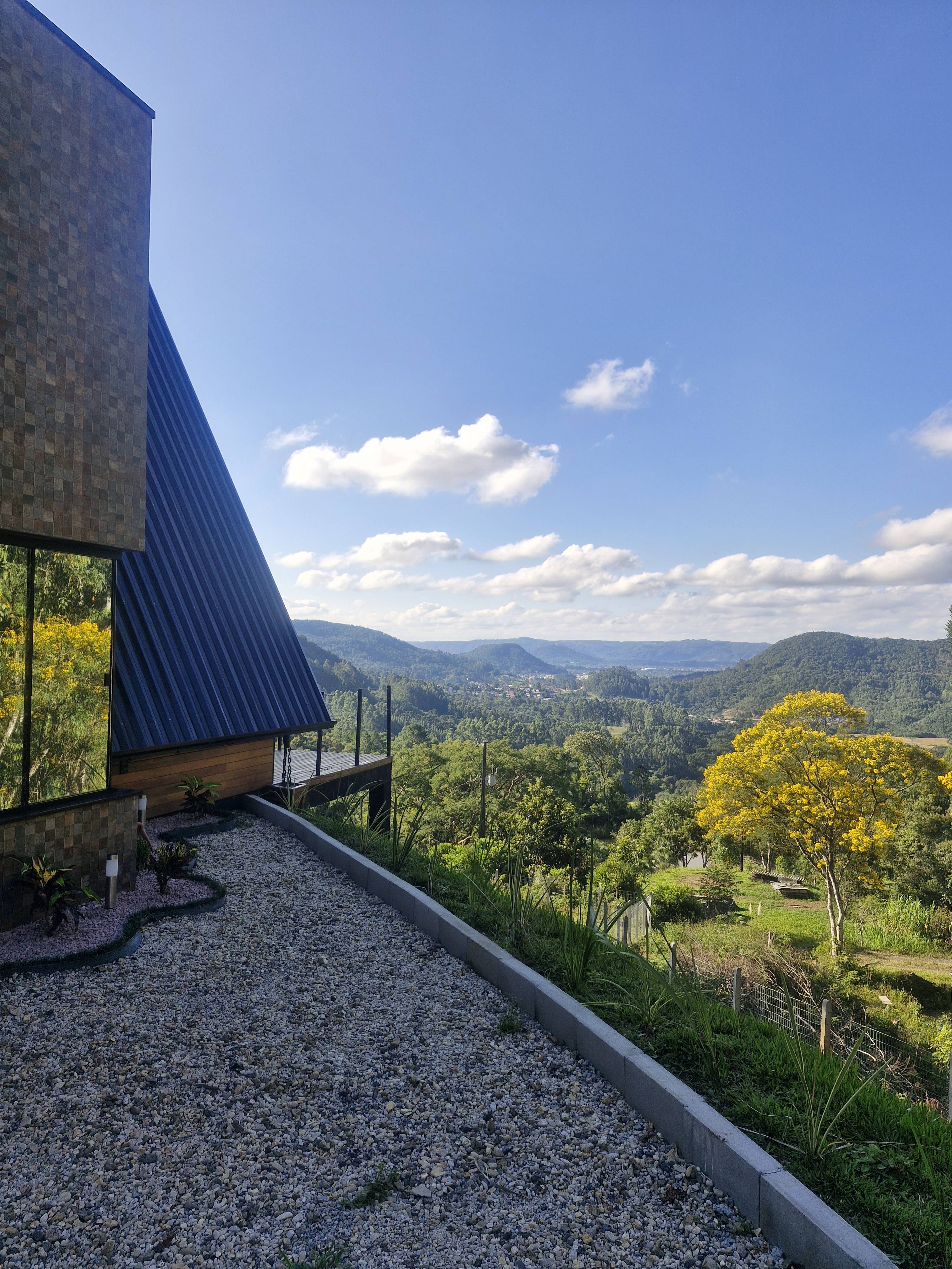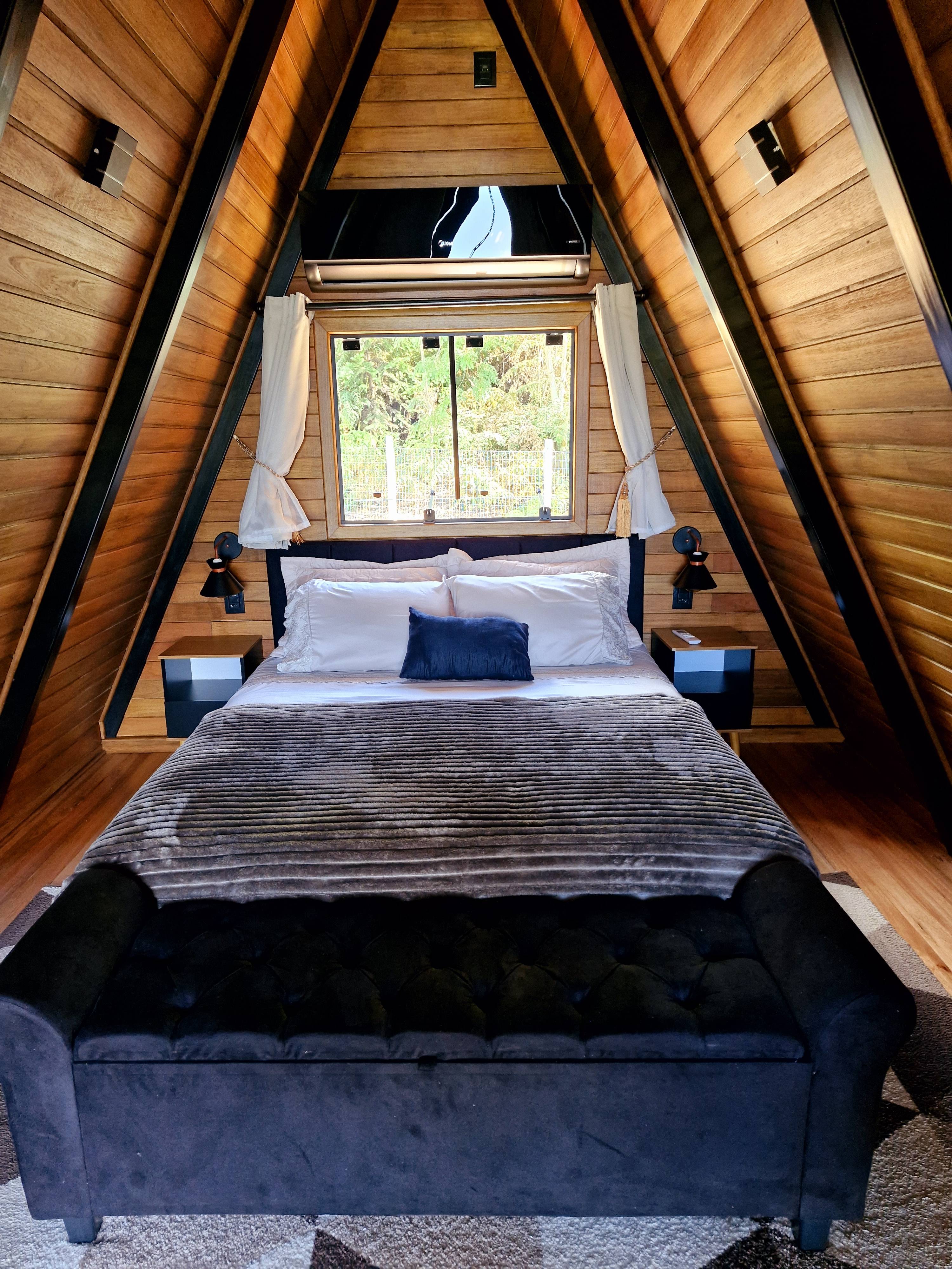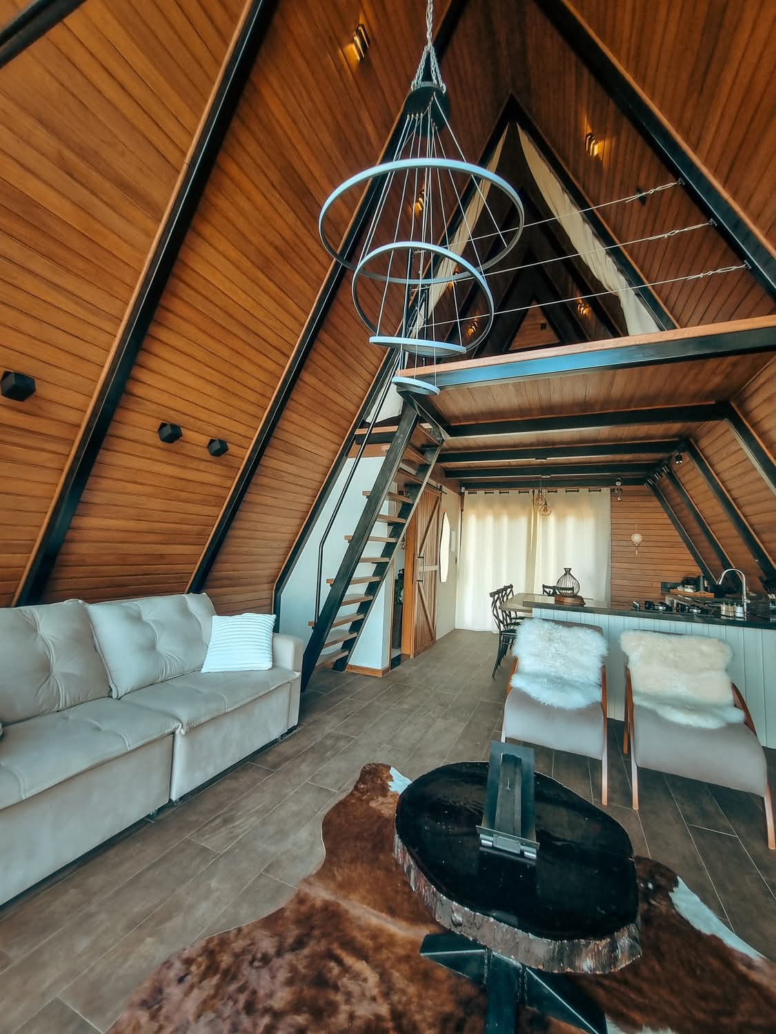 Chalé romântico de Altitude para casais. Banheiro completo com Hidromassagem, toalhas, roupões, chinelos e amenities. Cozinha completa e equipada com louças e eletroportáteis. Sala ampla com pé direito duplo, TV smart 50', sofá cama, calefator e uma vista espetacular. Quarto no mesanino com cama queen, ar condicionado, roupas de cama e cobertas. Deck frontal com vista panorâmica. Área externa conta com: gazebo, mesa, cadeiras, churrasqueira gourmet, balanço duplo e um lago de carpas ornamentais com cascata.