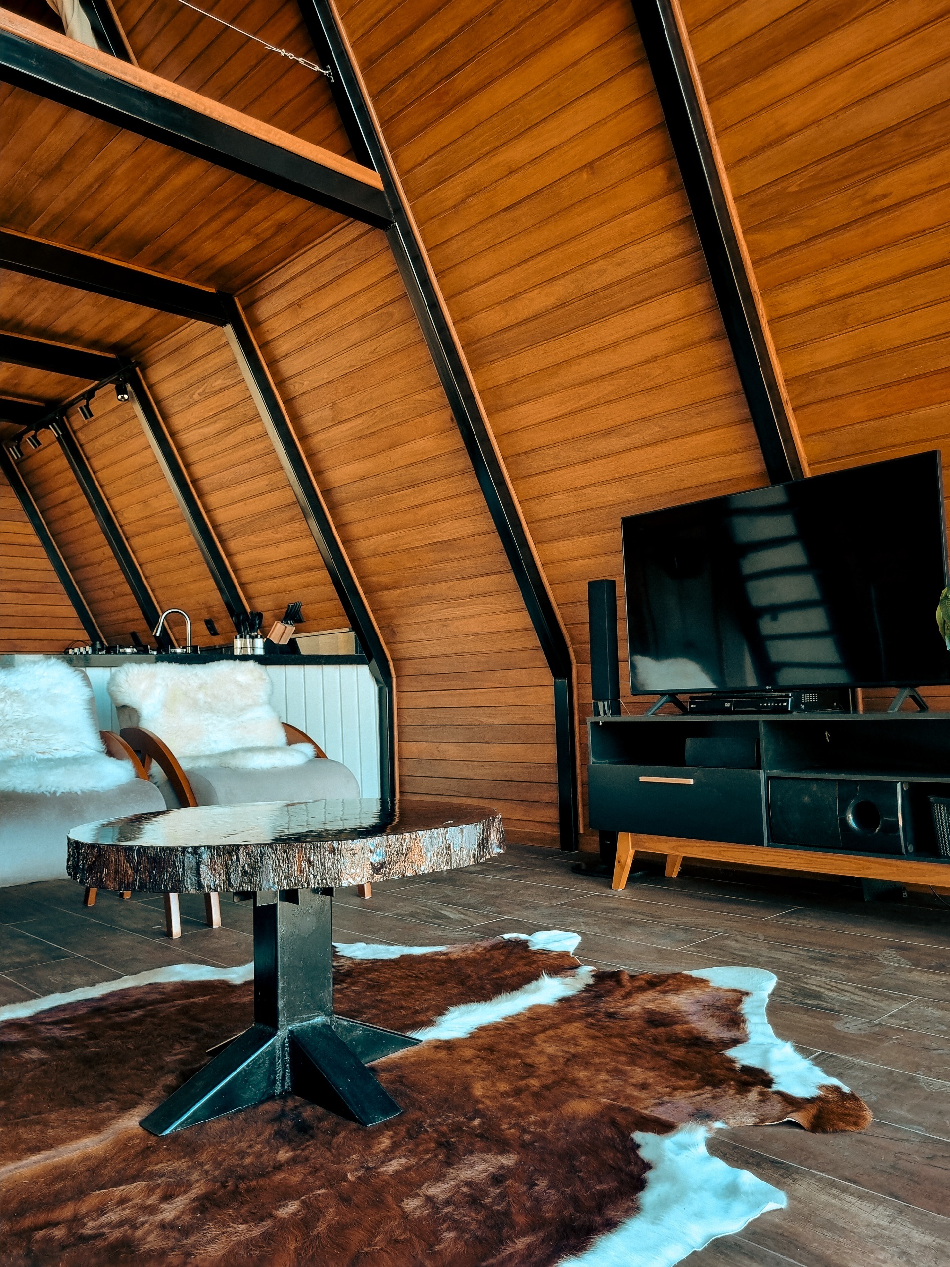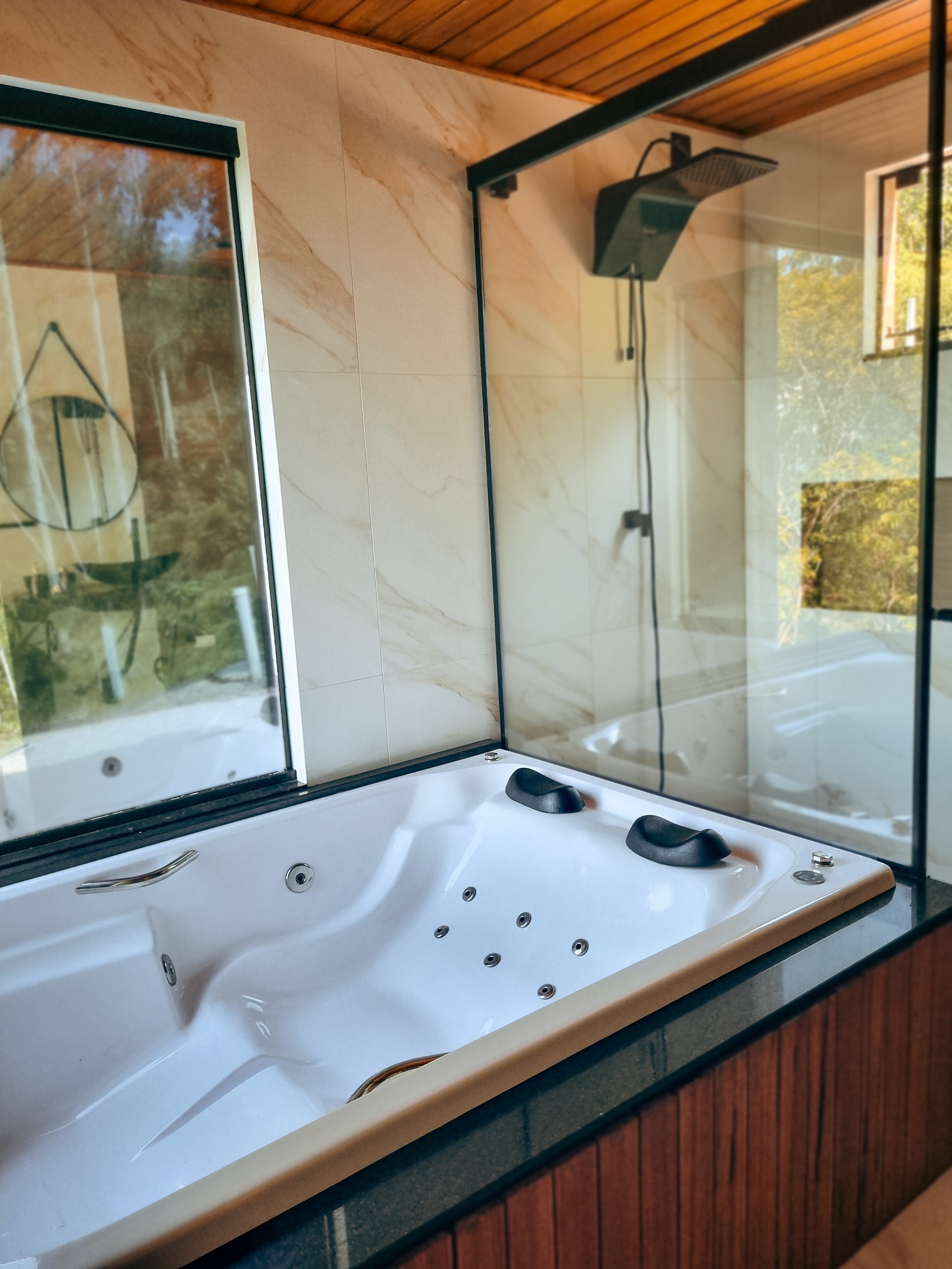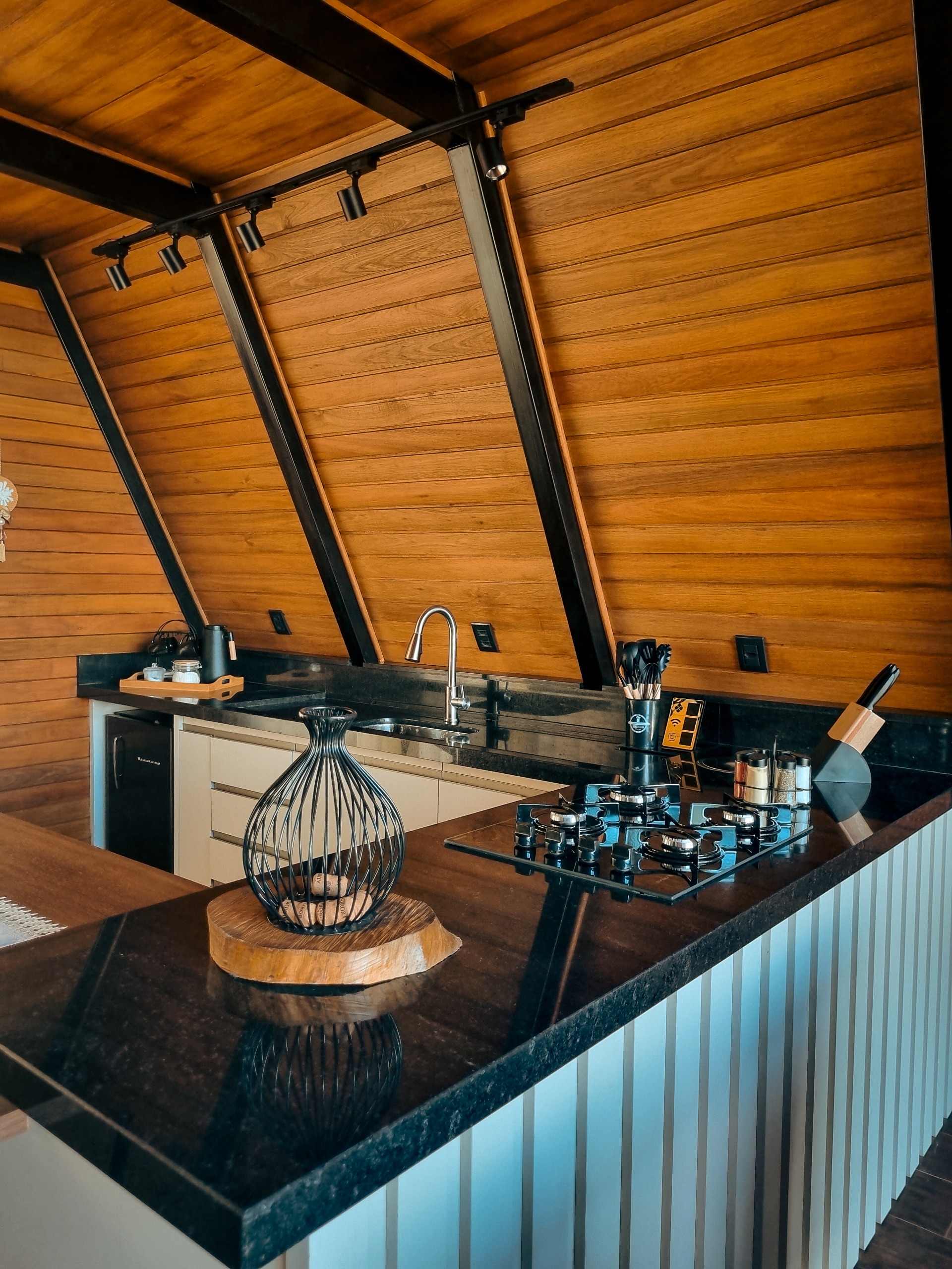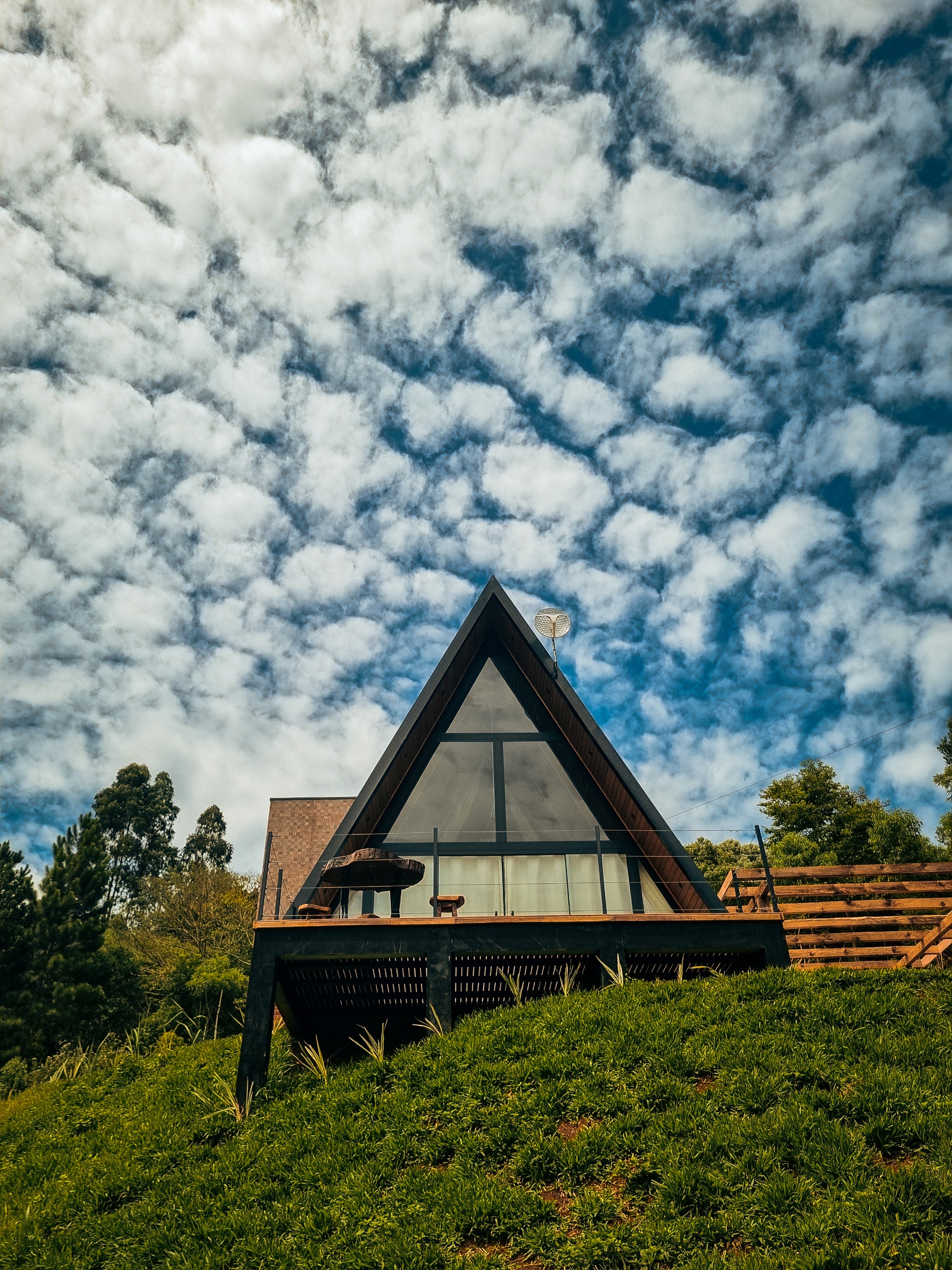 Chalé romântico de Altitude para casais. Banheiro completo com Hidromassagem, toalhas, roupões, chinelos e amenities. Cozinha completa e equipada com louças e eletroportáteis. Sala ampla com pé direito duplo, TV smart 50', sofá cama, calefator e uma vista espetacular. Quarto no mesanino com cama queen, ar condicionado, roupas de cama e cobertas. Deck frontal com vista panorâmica. Área externa conta com: gazebo, mesa, cadeiras, churrasqueira gourmet, balanço duplo e um lago de carpas ornamentais com cascata.