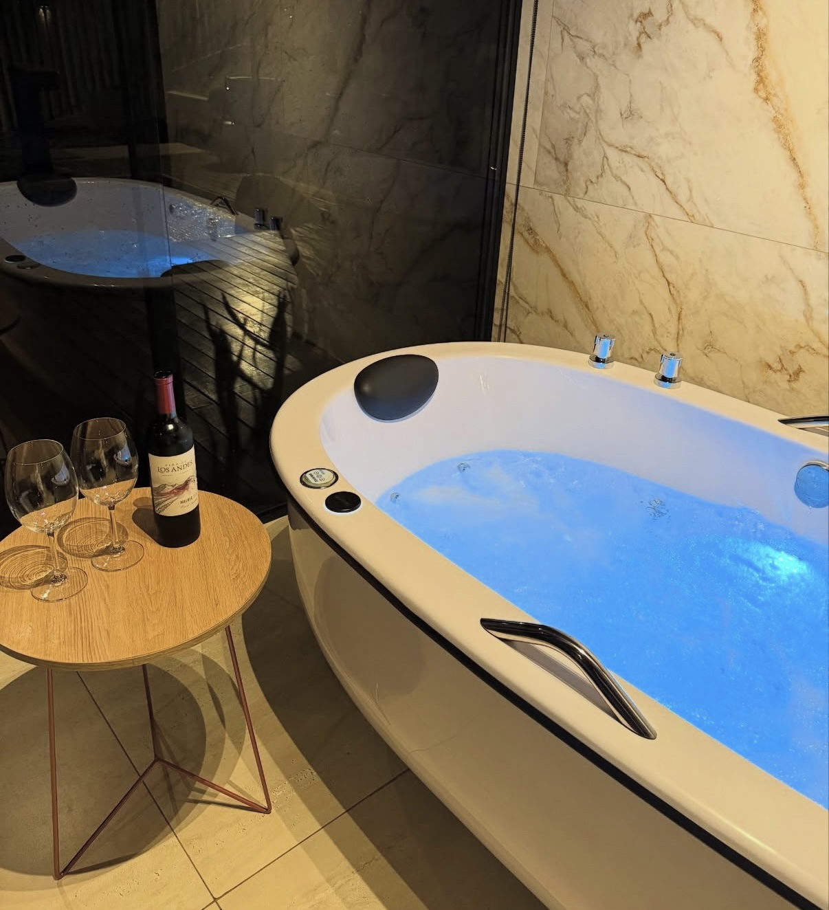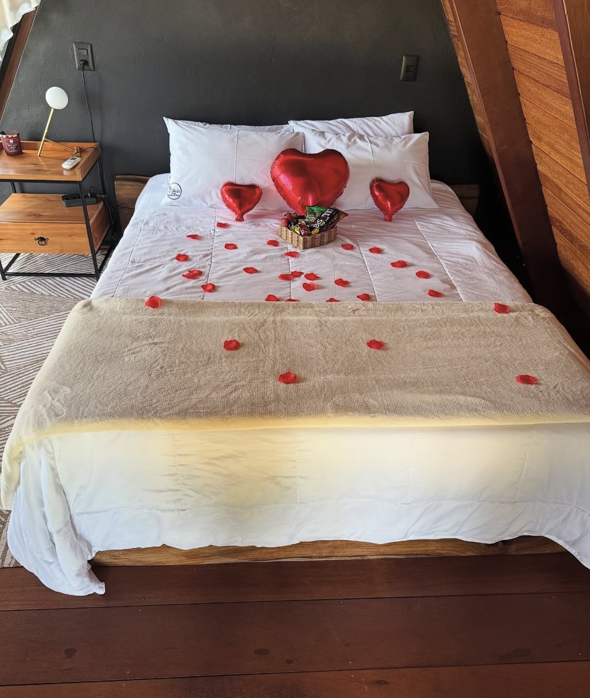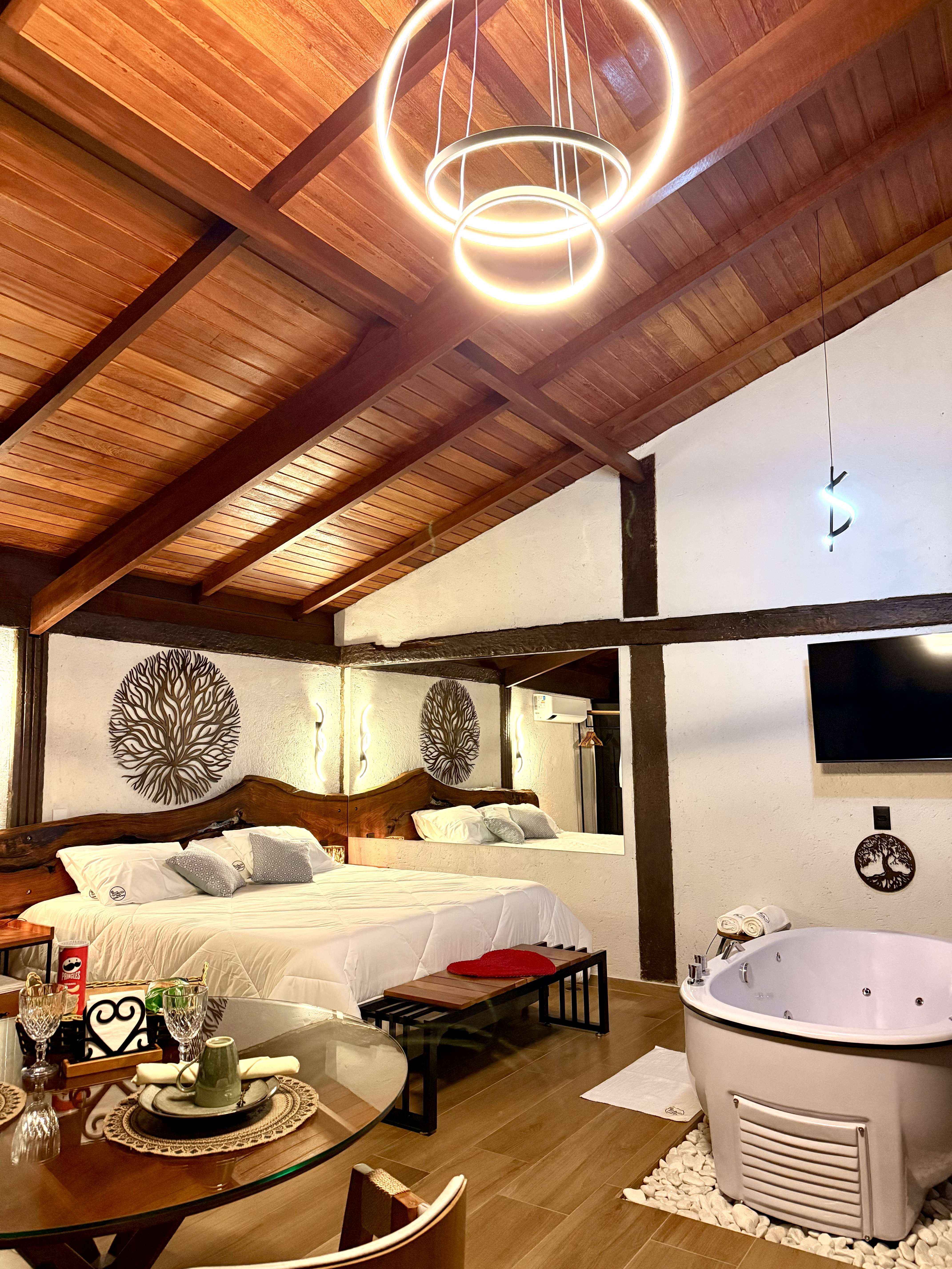 A estrutura conta com cozinha completa, banheira de hidromassagem, cama queen, televisão, conexão à internet, banho duplo a gás, ar-condicionado, rede e piscina com cascata. Um ambiente calmo, elegante e acolhedor, perfeito para desacelerar e viver momentos especiais.