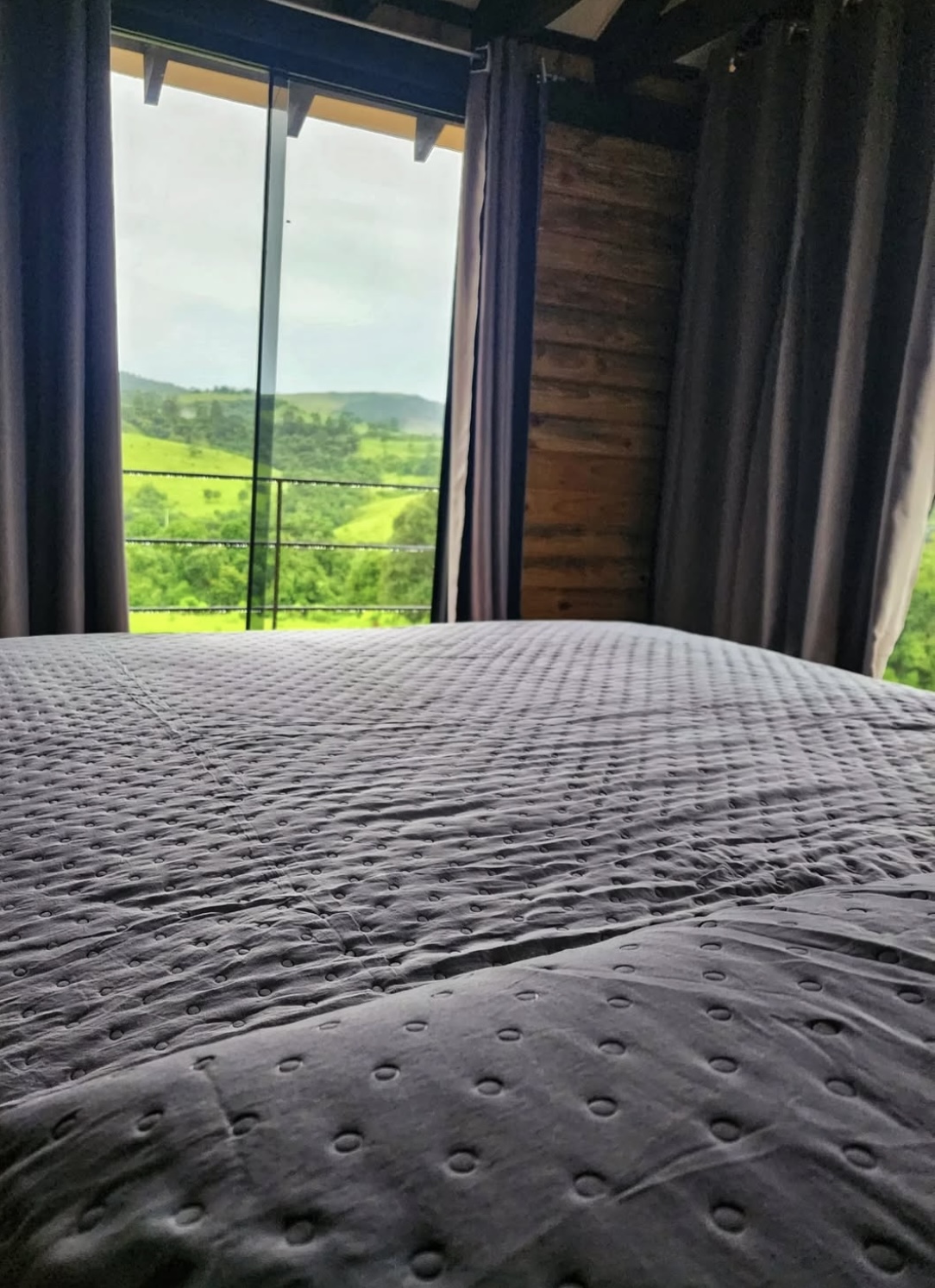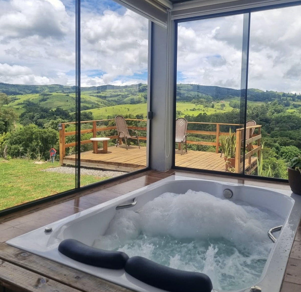 Nosso chalé combina conforto, tranquilidade e natureza para uma estadia inesquecível. Totalmente equipado, dispõe de banheira de hidromassagem, ar-condicionado split, cozinha completa (cooktop, air fryer, geladeira e utensílios), cama queen com roupas de cama e banho, sofá-cama queen, TV de 50' e Wi-Fi. A área externa oferece churrasqueira, fogo de chão e um deck privativo com vista deslumbrante. Ideal para relaxar e aproveitar momentos especiais em meio à natureza!