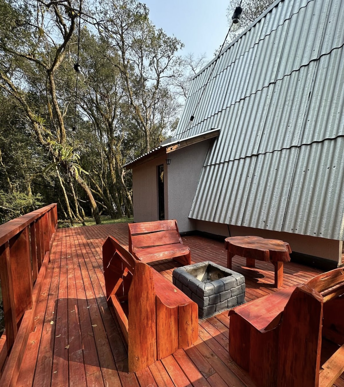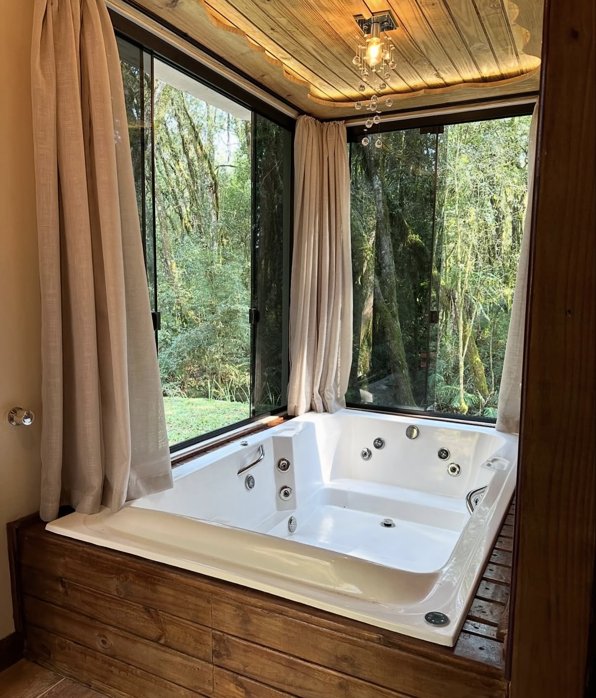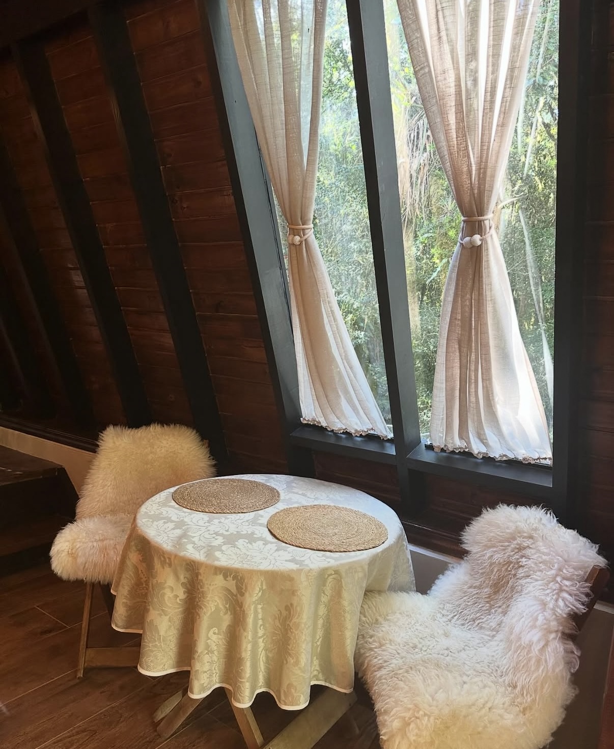 Atualmente contamos com dois Chalés da Mata: o Chalé Refúgio e o Chalé Sossego, ambos muito aconchegantes com banheira de hidromassagem e um espaço cercado pela natureza, ideal para quem busca tranquilidade e contato com o verde. Totalmente equipado e possuindo privacidade, oferece uma experiência única em meio a mata, perfeito para relaxar e renovar as energias.