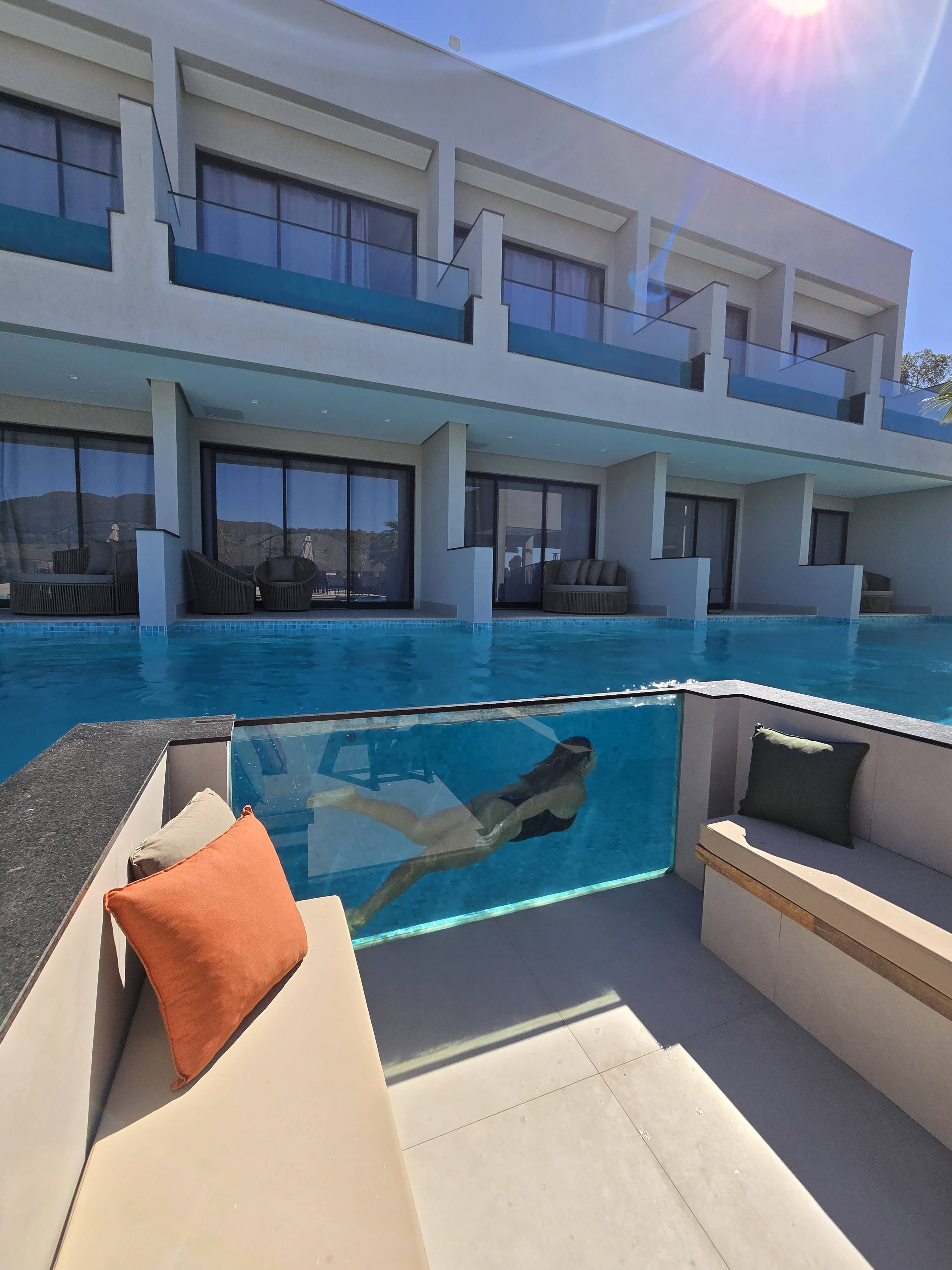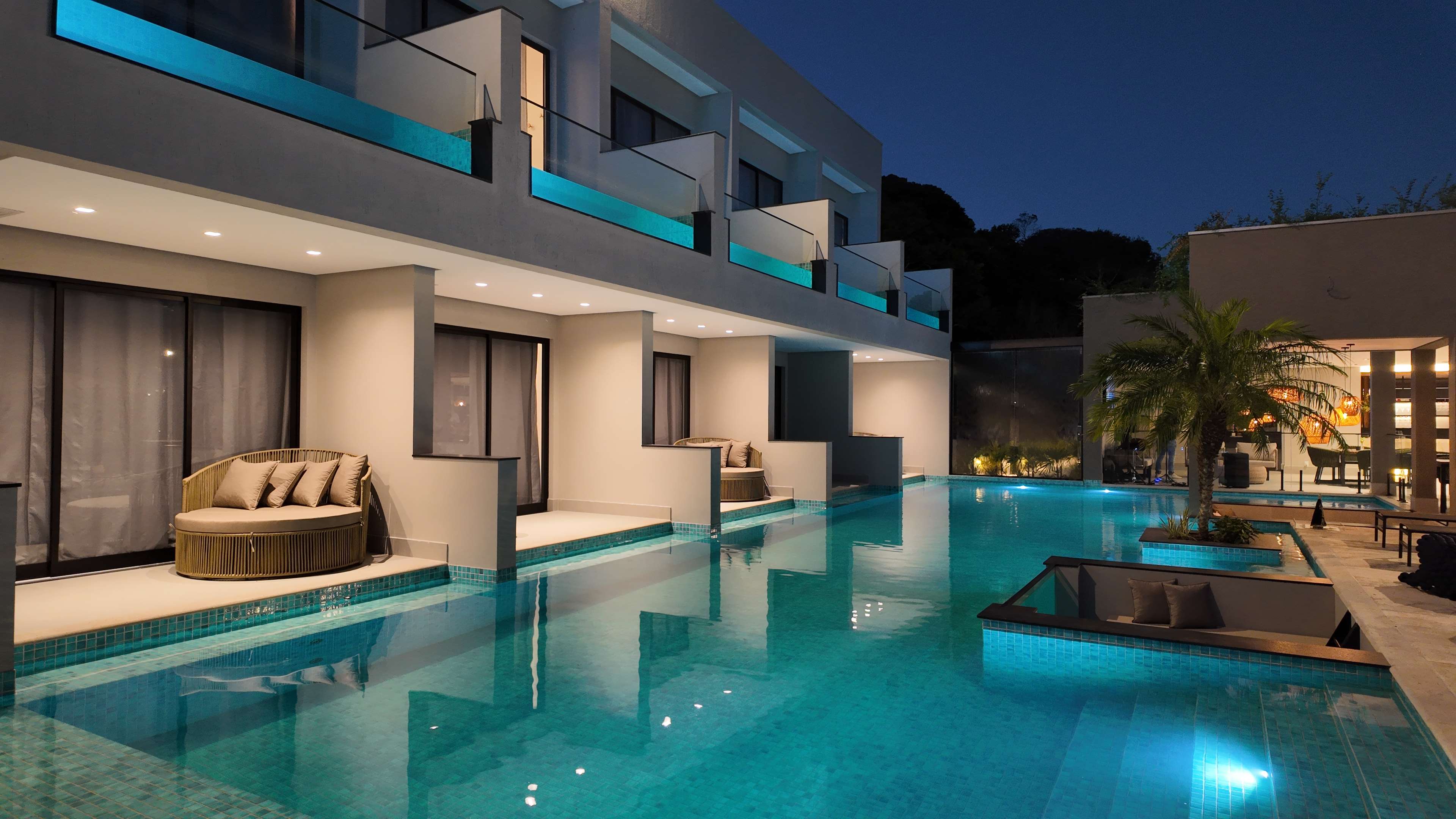 Suíte Exclusive com acesso à piscina (40 m²): conta com jardim de inverno e varanda encantadora com prainha particular, oferecendo acesso direto à piscina principal de 300 m² — uma experiência única de mergulho direto a partir da suíte.