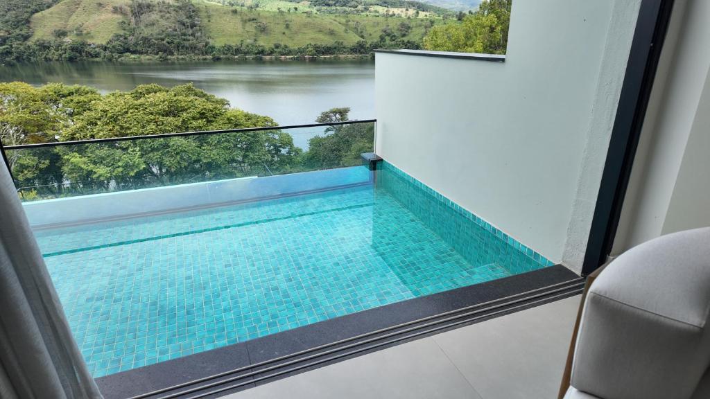 Suíte Superior com piscina privativa (40 m²): proporciona uma experiência de banho singular, com chuveiro que remete a uma cachoeira e claraboia que revela o céu. Ao abrir as cortinas, um cenário deslumbrante: piscina privativa, montanhas imponentes e o lago emoldurando a paisagem.