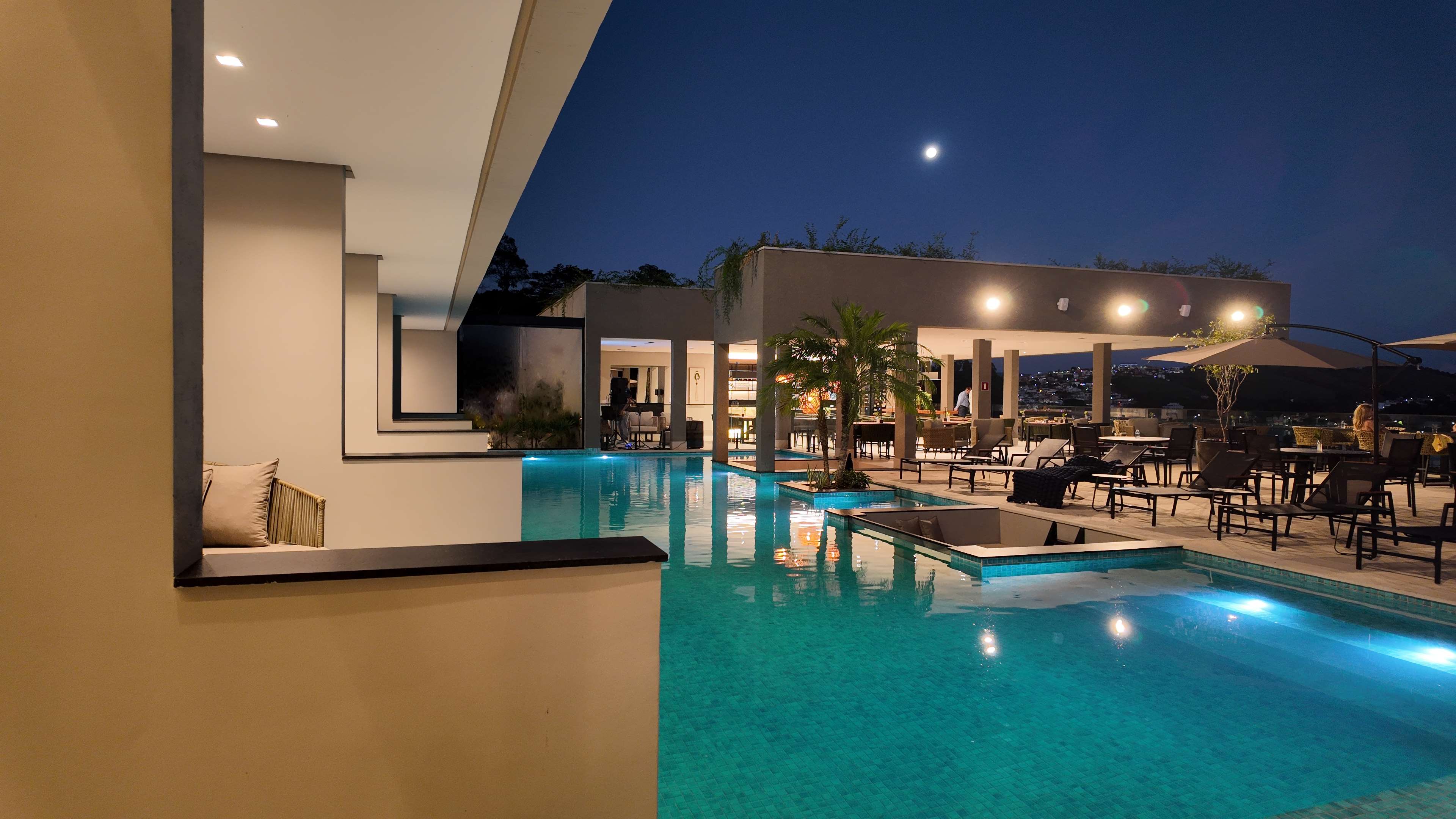Piscinas com borda infinita integradas à paisagem, lounge externo rebaixado, lareira e sofás que inspiram tranquilidade.