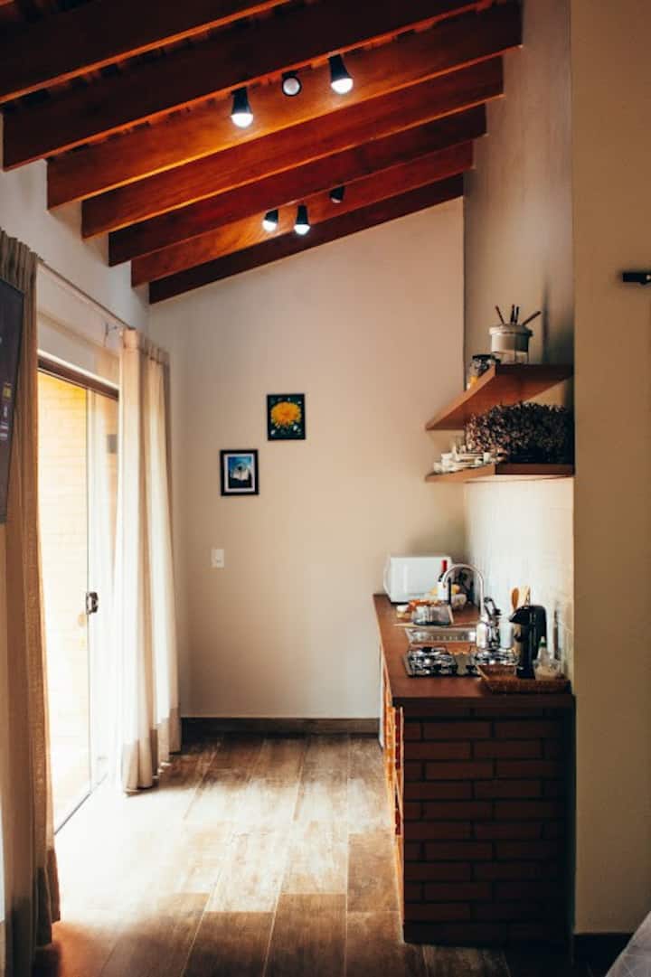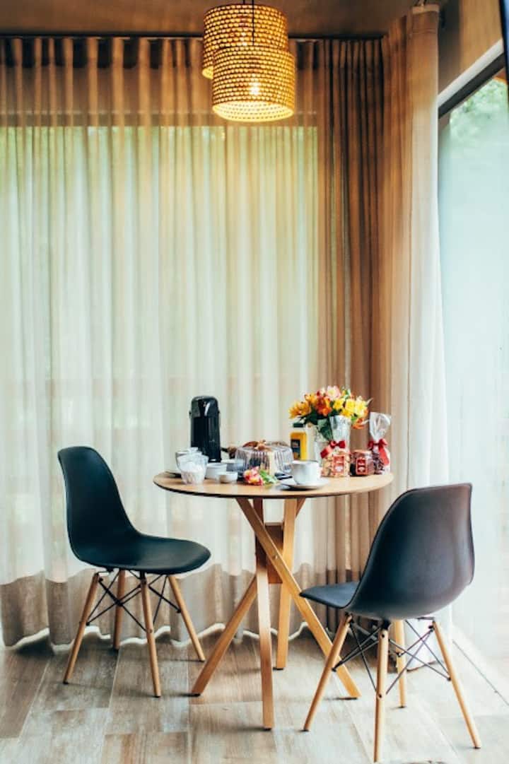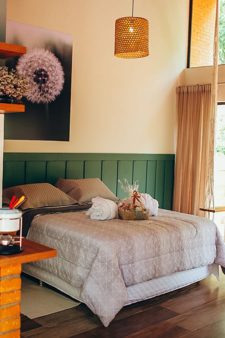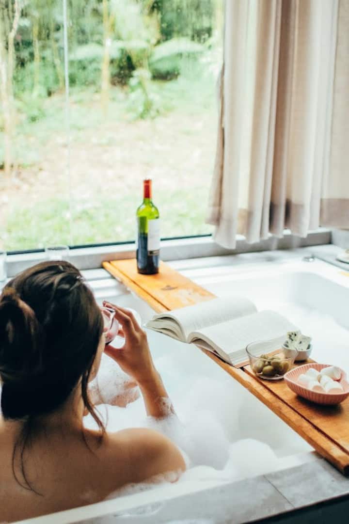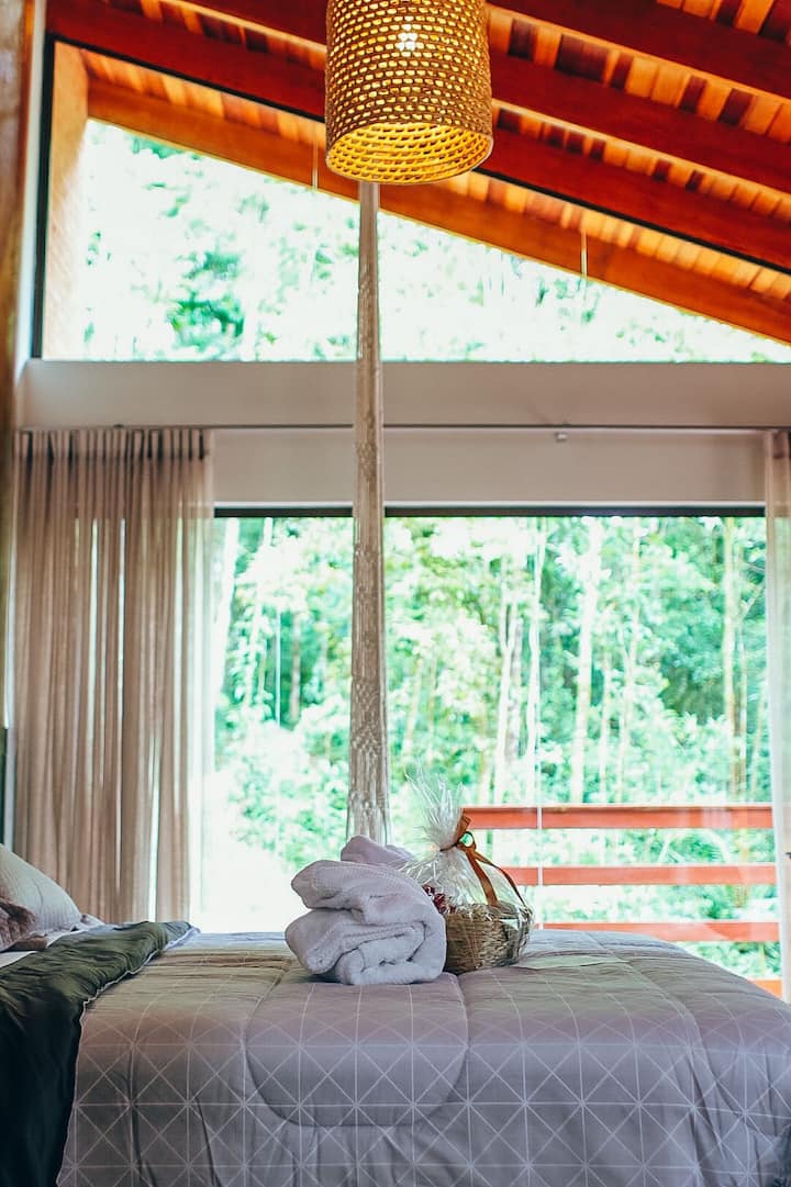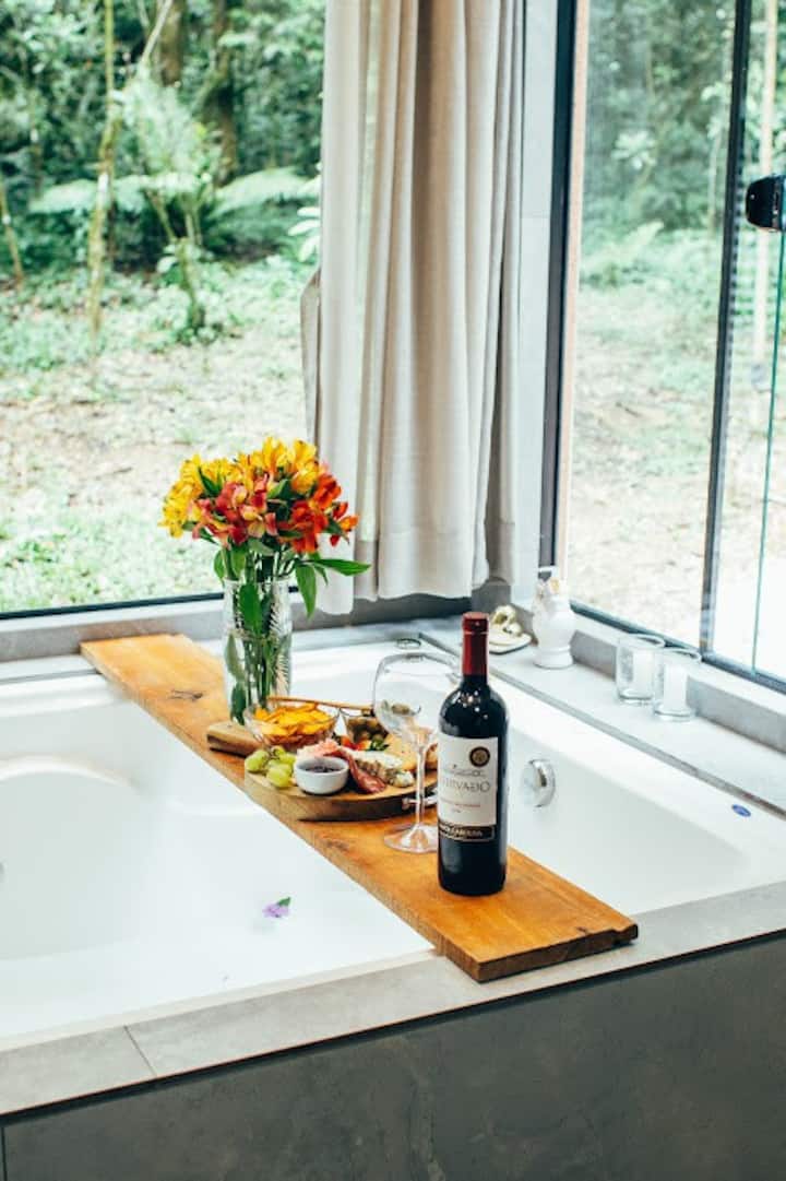 A cabana foi idealizada para aqueles que buscam o contato com a natureza, sossego e conforto. Situada na região rural de São José dos Pinhais, em um local de acesso exclusivo, as acomodações oferecem banheira de hidromassagem, ar-condicionado, TV, cozinha equipada e varanda privativa com vista deslumbrante. Cada detalhe foi planejado para garantir uma estadia inesquecível, em meio à tranquilidade e beleza do ambiente natural.