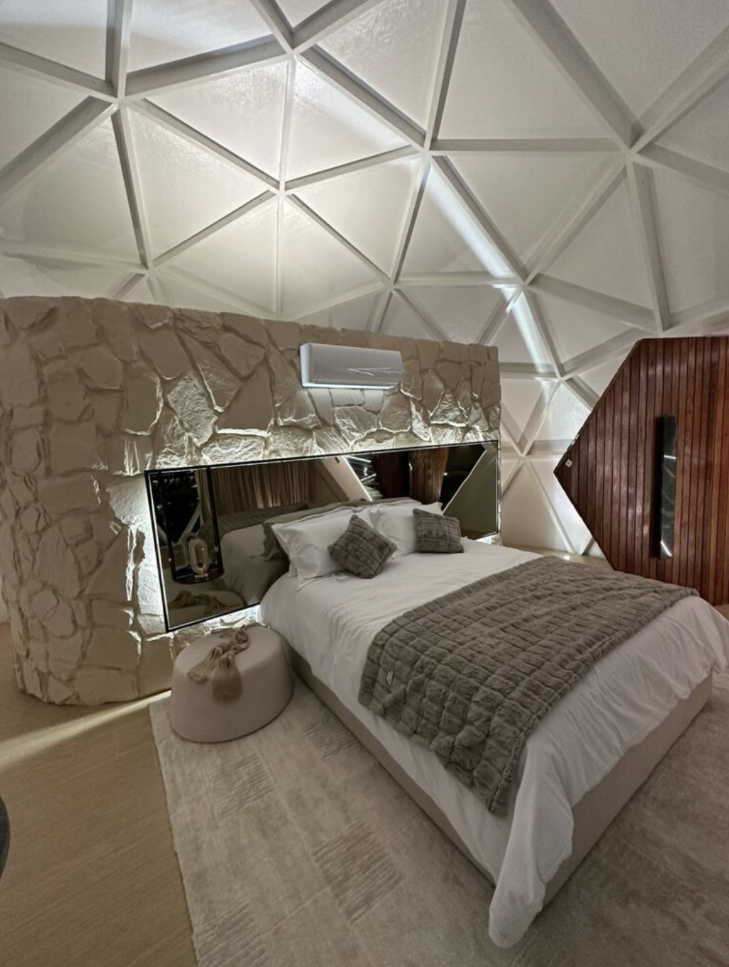 O Domo Bananeiras tem uma linda vista panorâmica do pôr do sol. Dentro, há um banheiro luxuoso, cama, mesa, cozinha completa e, na área externa, uma piscina aquecida, iluminada e com hidromassagem esperando pelos hóspedes. Há também uma lareira para assar marshmallows ou se aquecer tomando um vinho. Além disso, uma rede suspensa para contemplar o céu e uma churrasqueira para preparar um churrasco. Surpreendentemente, uma passagem secreta dá acesso ao cinema privativo, sala de jogos e uma suíte master integrada. Nesse segundo pavimento, podem ser acomodados mais três hóspedes. Uma cesta romântica servida no Domo leva o café da manhã dos sonhos, que está incluso na estadia.