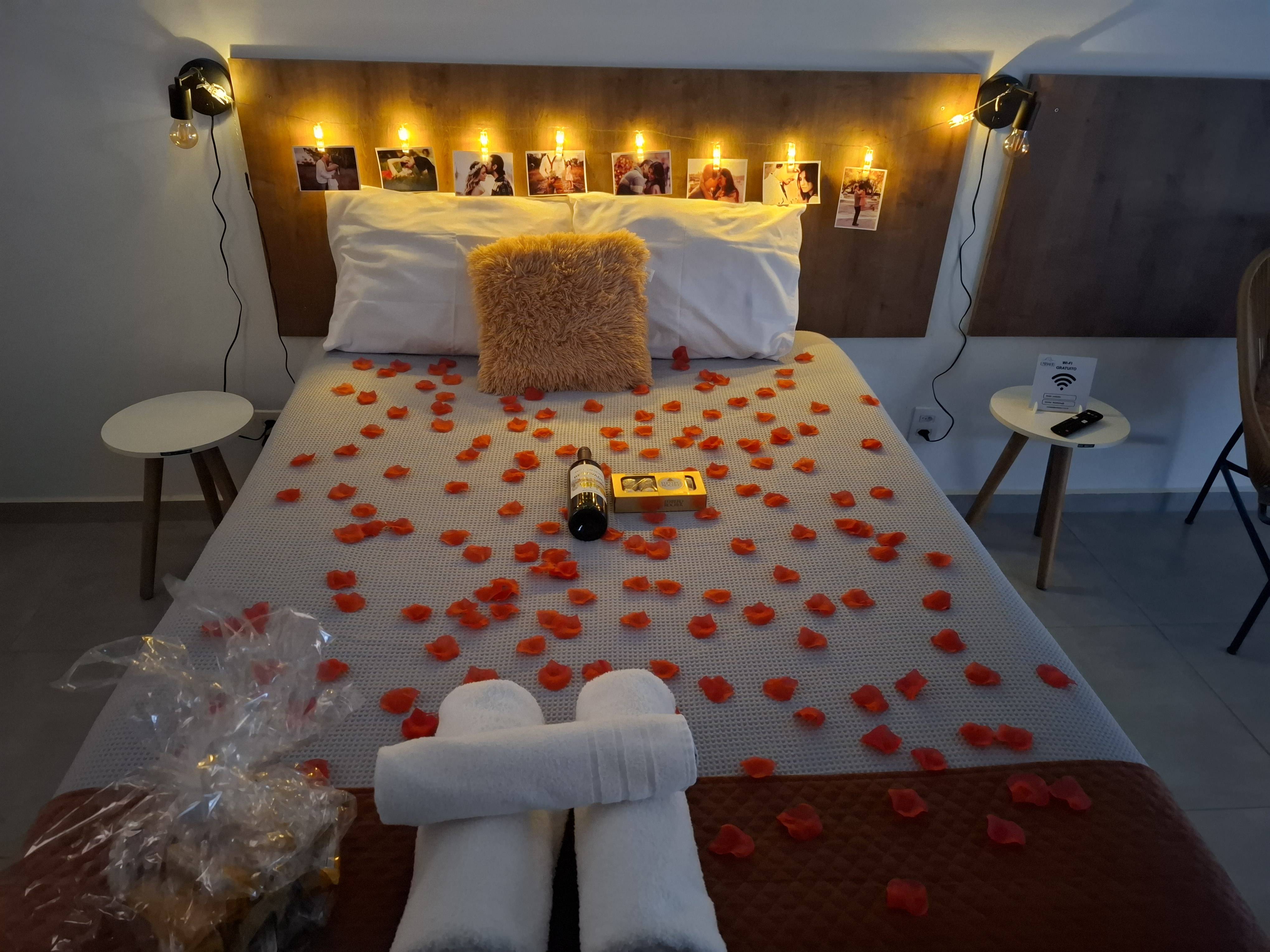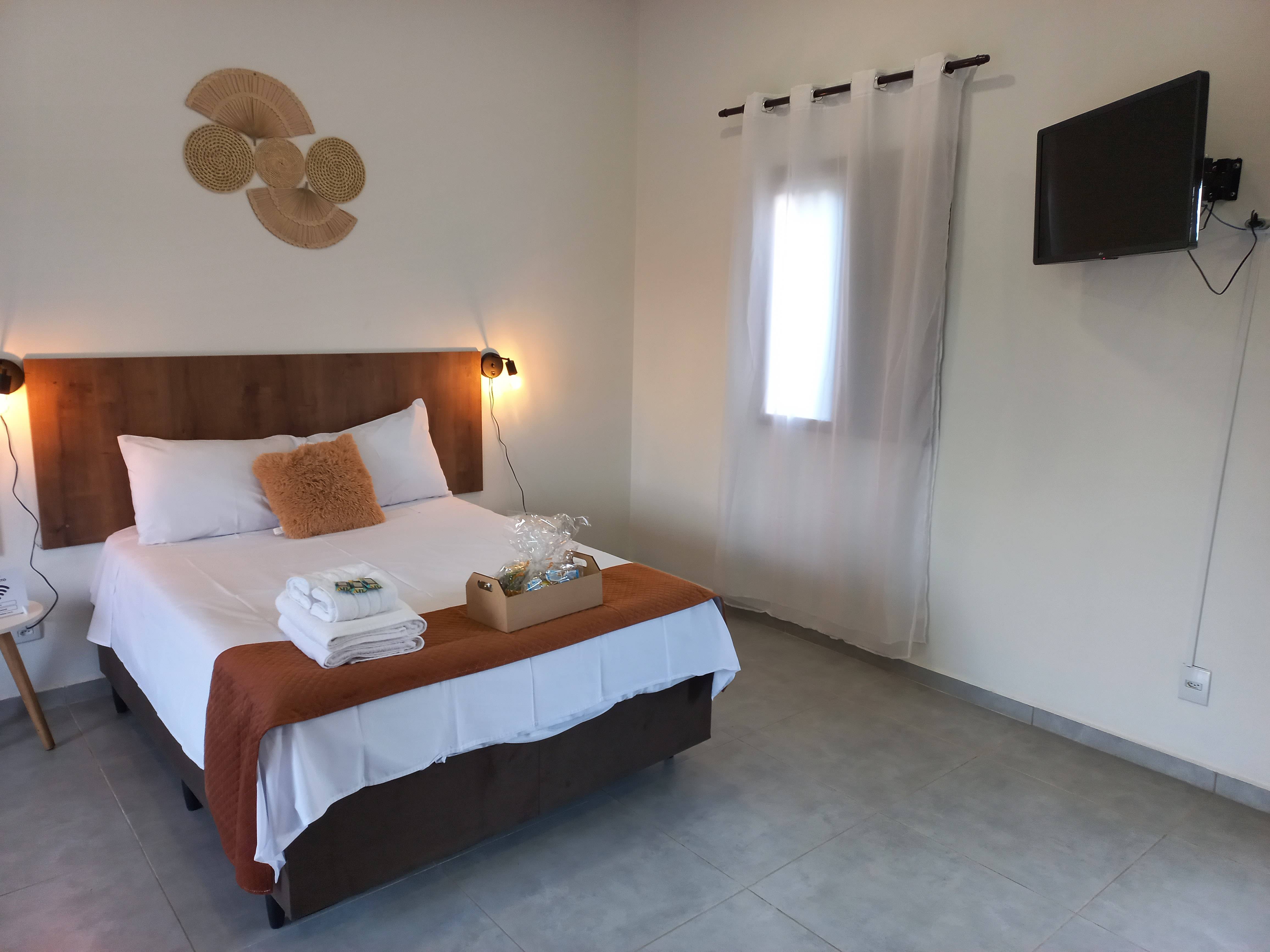 As suítes tem 30 m2 com cama box de casal, roupa de cama e banho 100% algodão, TV 32', frigobar, microondas e cafeteira.