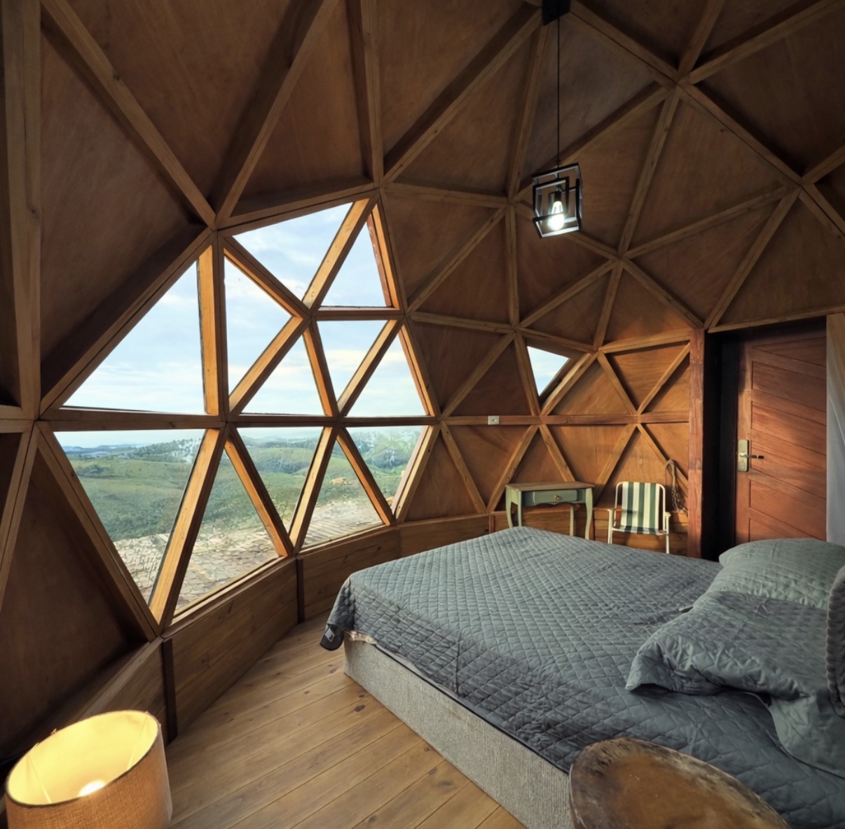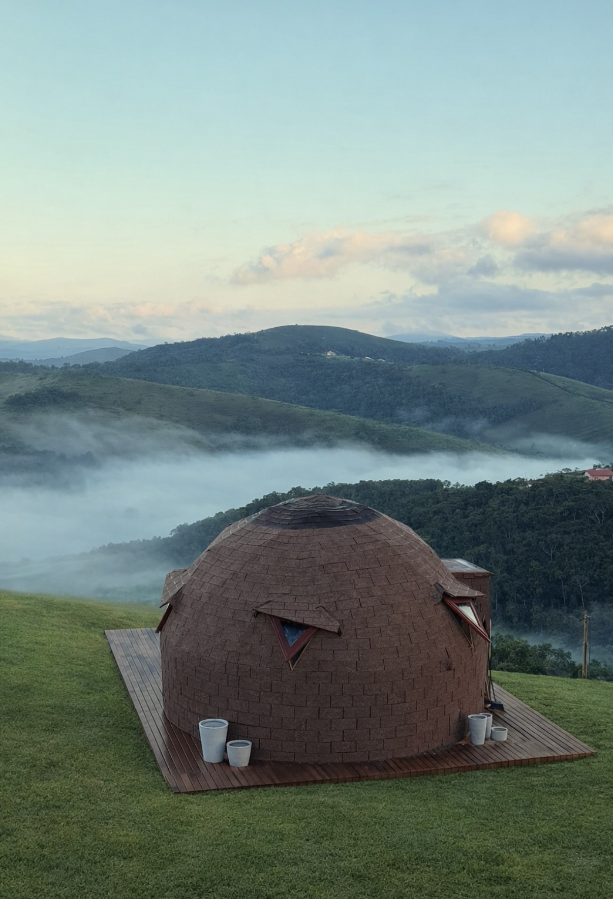 Uma obra de arte na serra, um domo arquitetura geodésica feito em madeira com uma vista espetacular para o por do sol e mirante de estrelas a noite.