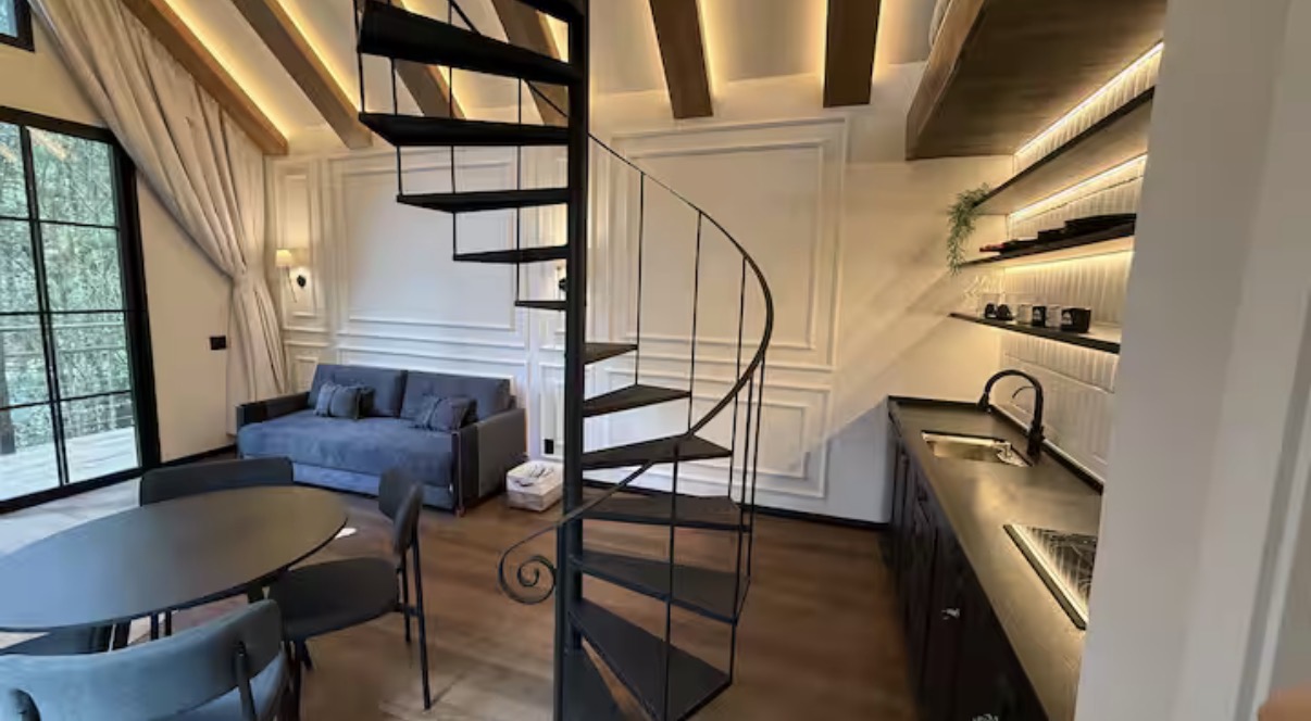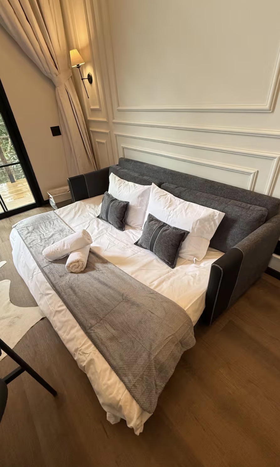 A hospedagem conta com suíte com cama king no pavimento superior e ambientes integrados no nível inferior, incluindo estar, jantar, dormitório adicional, banheiro e espaço de apoio. O deck externo com lareira suíça complementa a experiência, tornando a cabana ideal para casais e famílias que buscam conforto, tranquilidade e conexão com a natureza em Campos do Jordão.