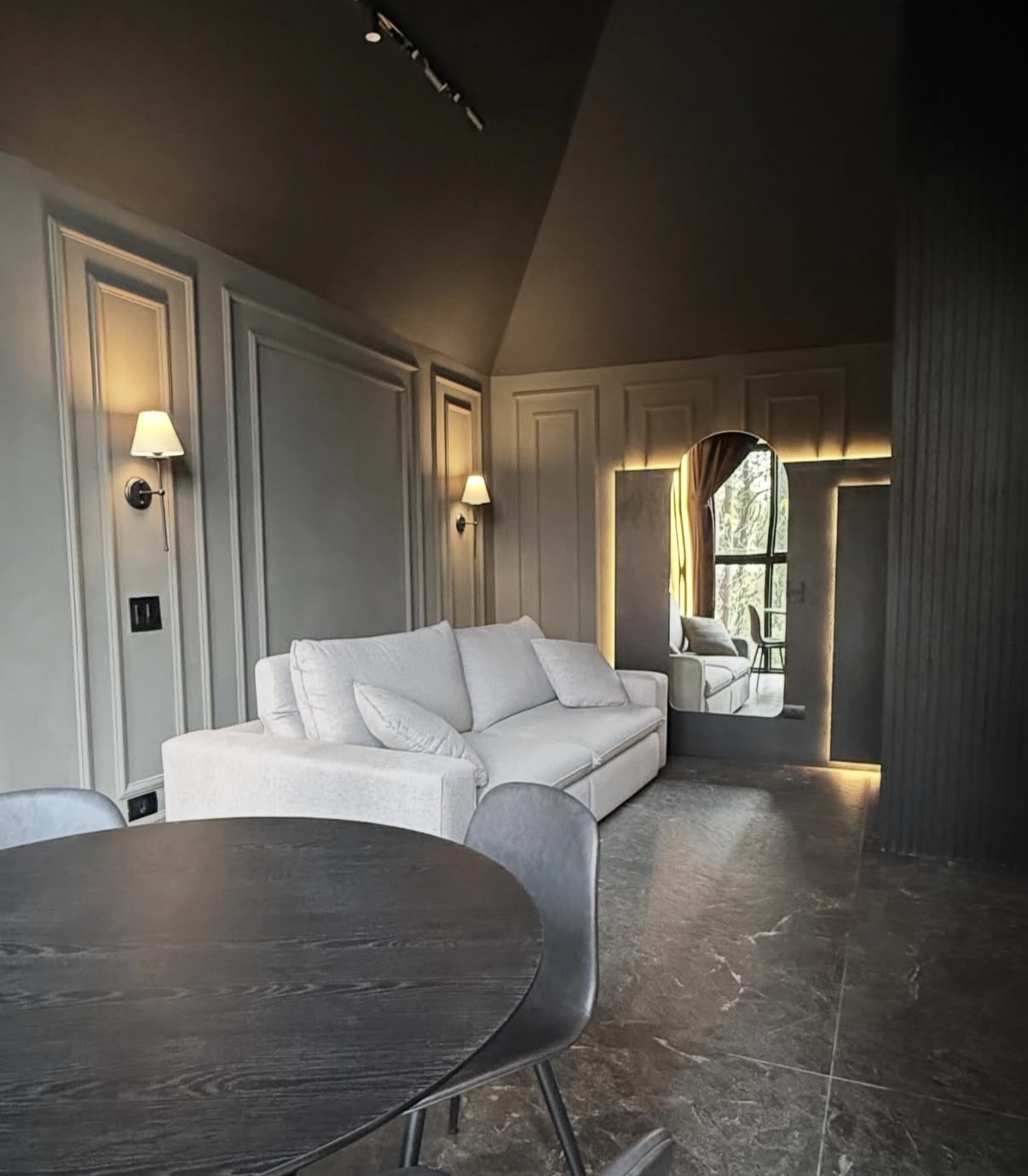 A Cabana Hill integra o complexo In the Woods e destaca-se pela vista elevada e pela sensação de privacidade proporcionada pelo entorno natural. A arquitetura valoriza a integração com o bosque, com pé-direito alto, ampla janela frontal e ambientes que permitem contemplar a copa das árvores, criando uma experiência imersiva e acolhedora.
