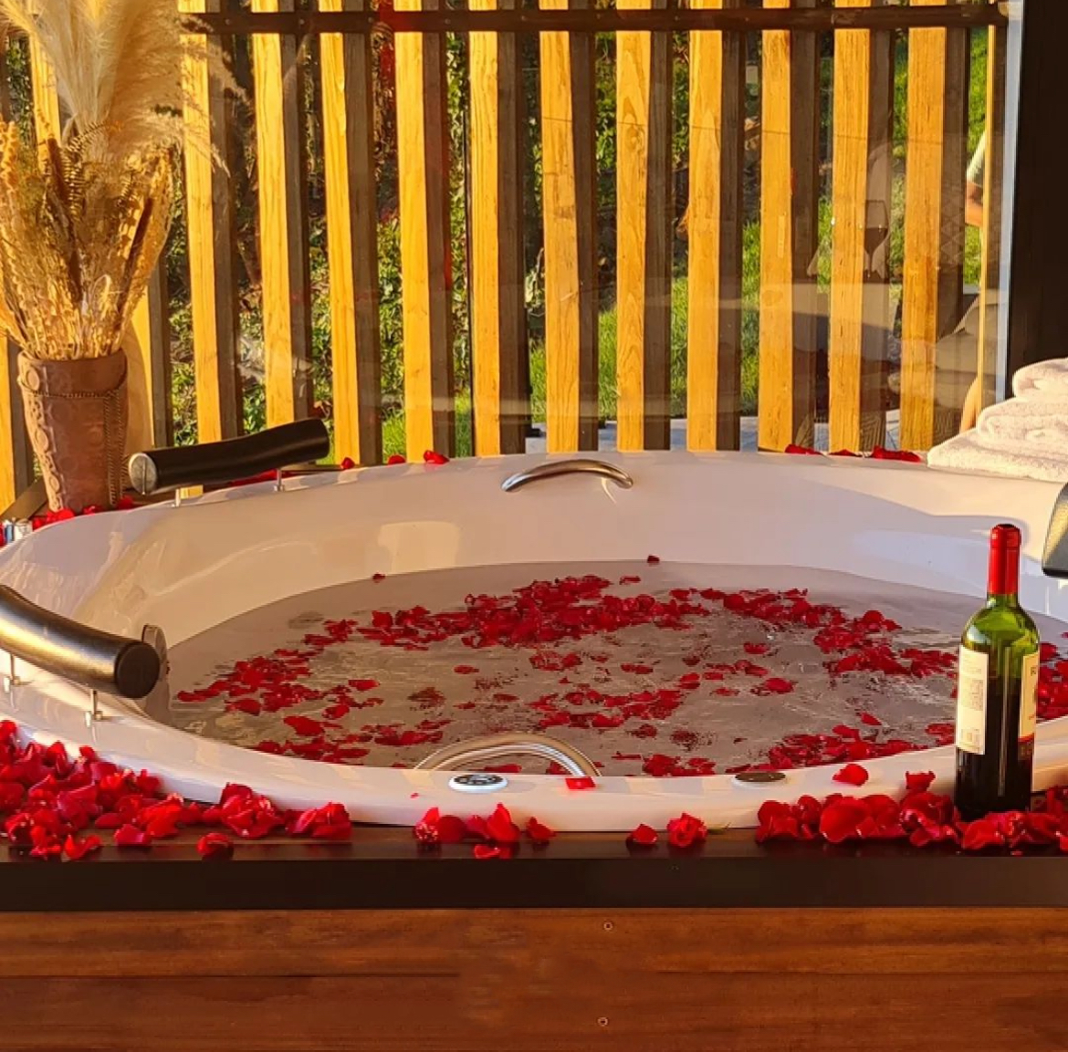 Cada cabana está equipada com uma cozinha completa, uma cama king size para um descanso luxuoso, e uma hidromassagem para momentos de relaxamento. Desfrute de uma noite aconchegante ao redor da lareira, ou aproveite a piscina para um mergulho refrescante. A televisão garante entretenimento e conectividade, enquanto o ar condicionado mantém o ambiente agradável.