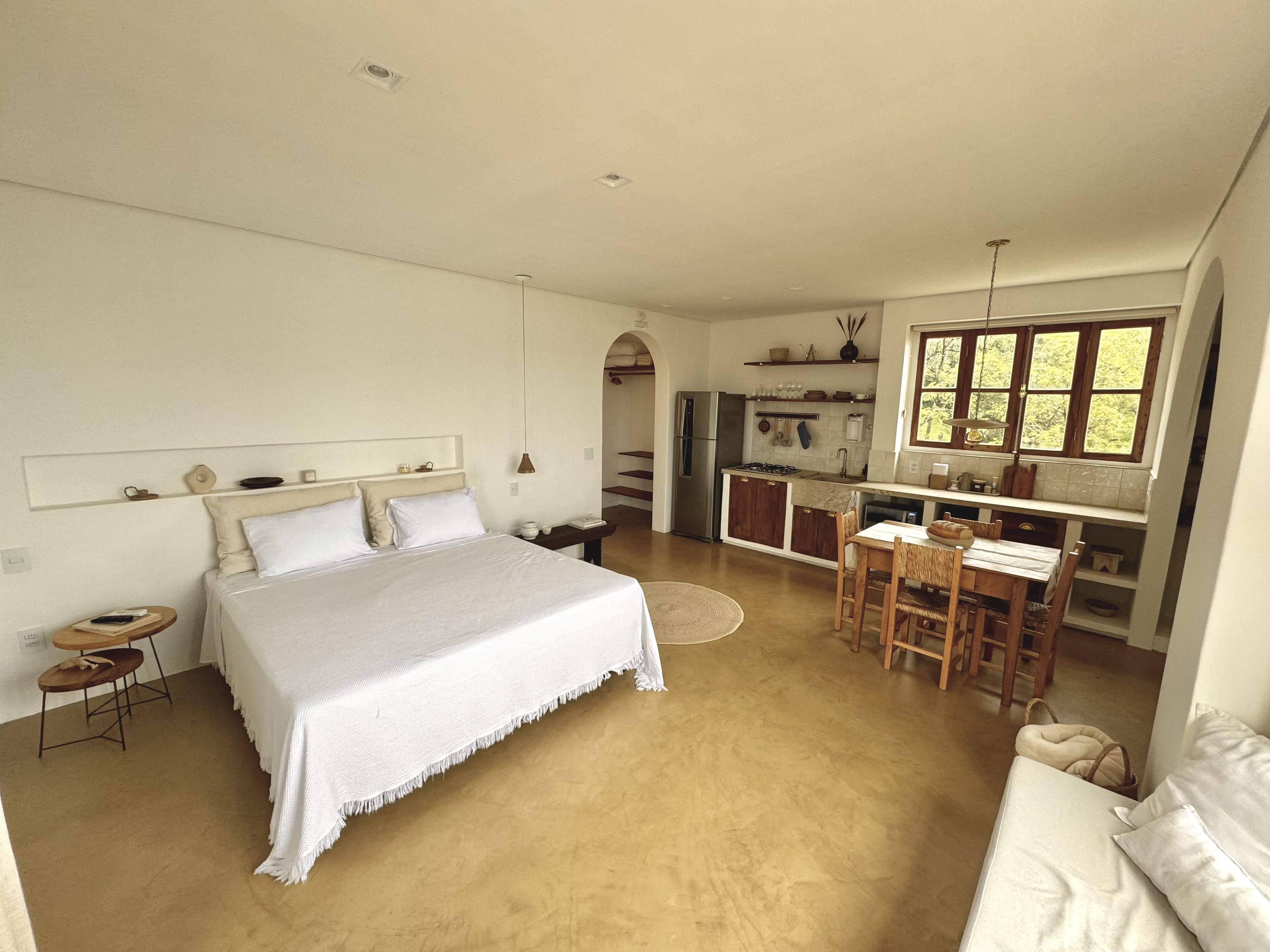 O estilo loft, com quarto e cozinha integrados, garante sempre a melhor vista de qualquer ambiente. A inspiração mediterrânea divide um espaço com as raízes mineiras dos anfitriões, em uma casa cheia de significados: a mesa da primeira casa dos avós, as janelas feitas da árvore do quintal da roça e até os utensílios de cerâmica da cozinha, feitos um a um pela anfitriã.