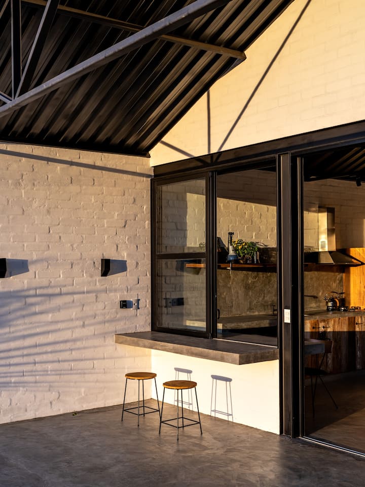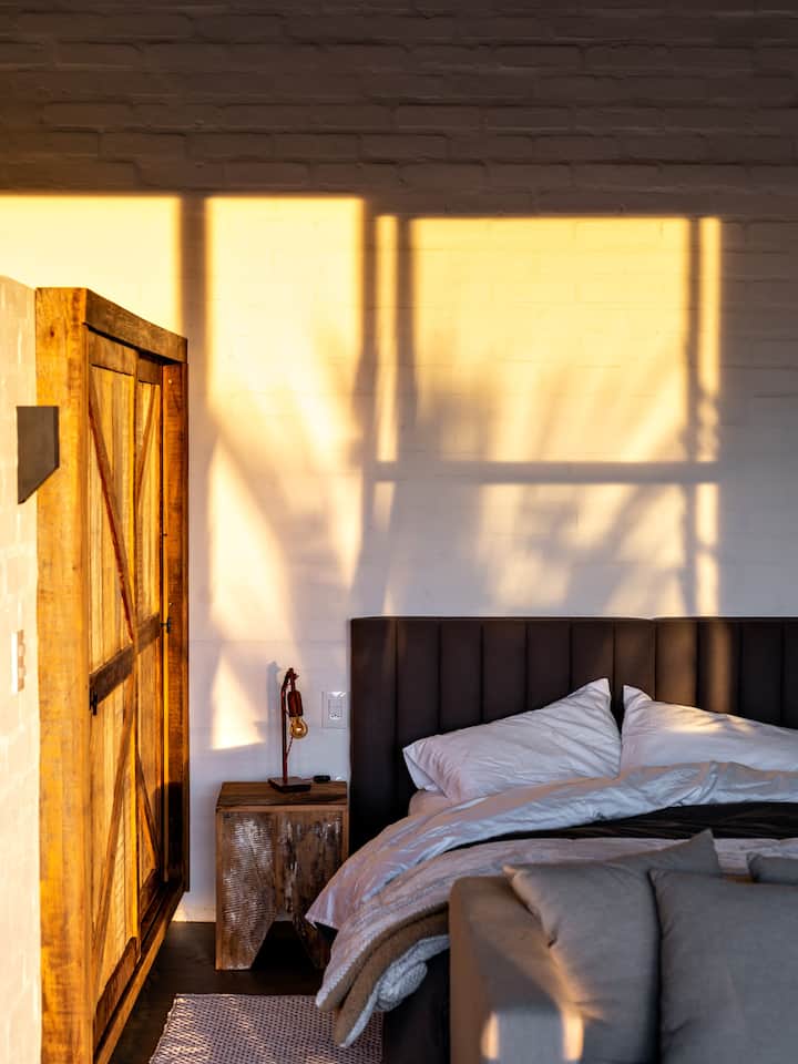 A cozinha equipada e a cama confortável garantem praticidade e descanso. O ambiente une simplicidade e aconchego para uma experiência de conexão e tranquilidade.