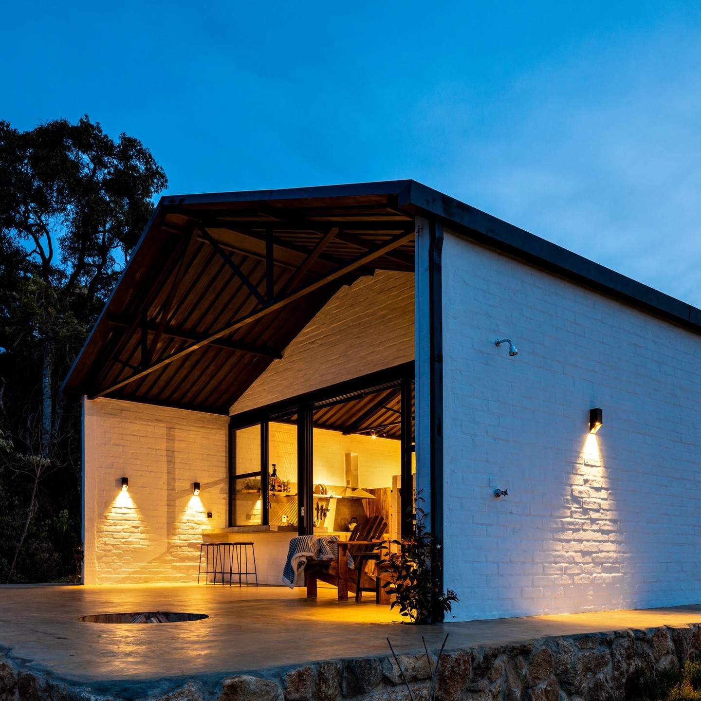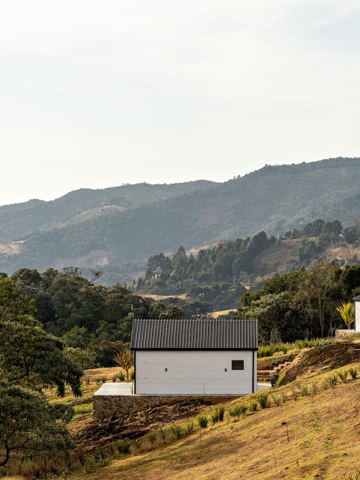 A tiny house de 50 m² está integrada à paisagem da Serra da Mantiqueira, em Gonçalves. A varanda convida à contemplação da mata nativa e do céu estrelado — com o som tranquilo da natureza ao redor.