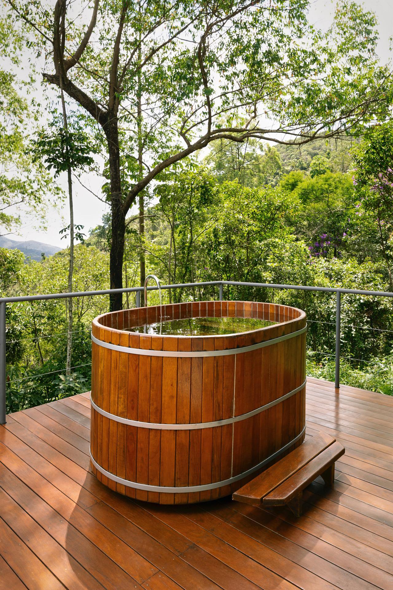 A área social conta com sala ampla, lareira a gás e mesa de jantar, além de cozinha integrada equipada para preparo de refeições. O quarto dispõe de cama king size, enxoval completo, cortinas blackout, ar-condicionado com aquecimento e televisão, enquanto o banheiro oferece chuveiro com água quente, toalhas macias, aquecedor de toalha, secador e amenities. Na parte externa, rede suspensa e ofurô com água quente convidam ao relaxamento, todos conectados ao deck principal com espaço gourmet, horta de temperos frescos, churrasqueira e firepit. Também são disponibilizados acessórios para treino ao ar livre, além de produtos orgânicos e pães artesanais selecionados da região. Entre os serviços adicionais, há opção de Private Chef, market concierge para bebidas e carta de vinhos exclusiva, bem como sessões de massoterapia, contratados separadamente da diária.