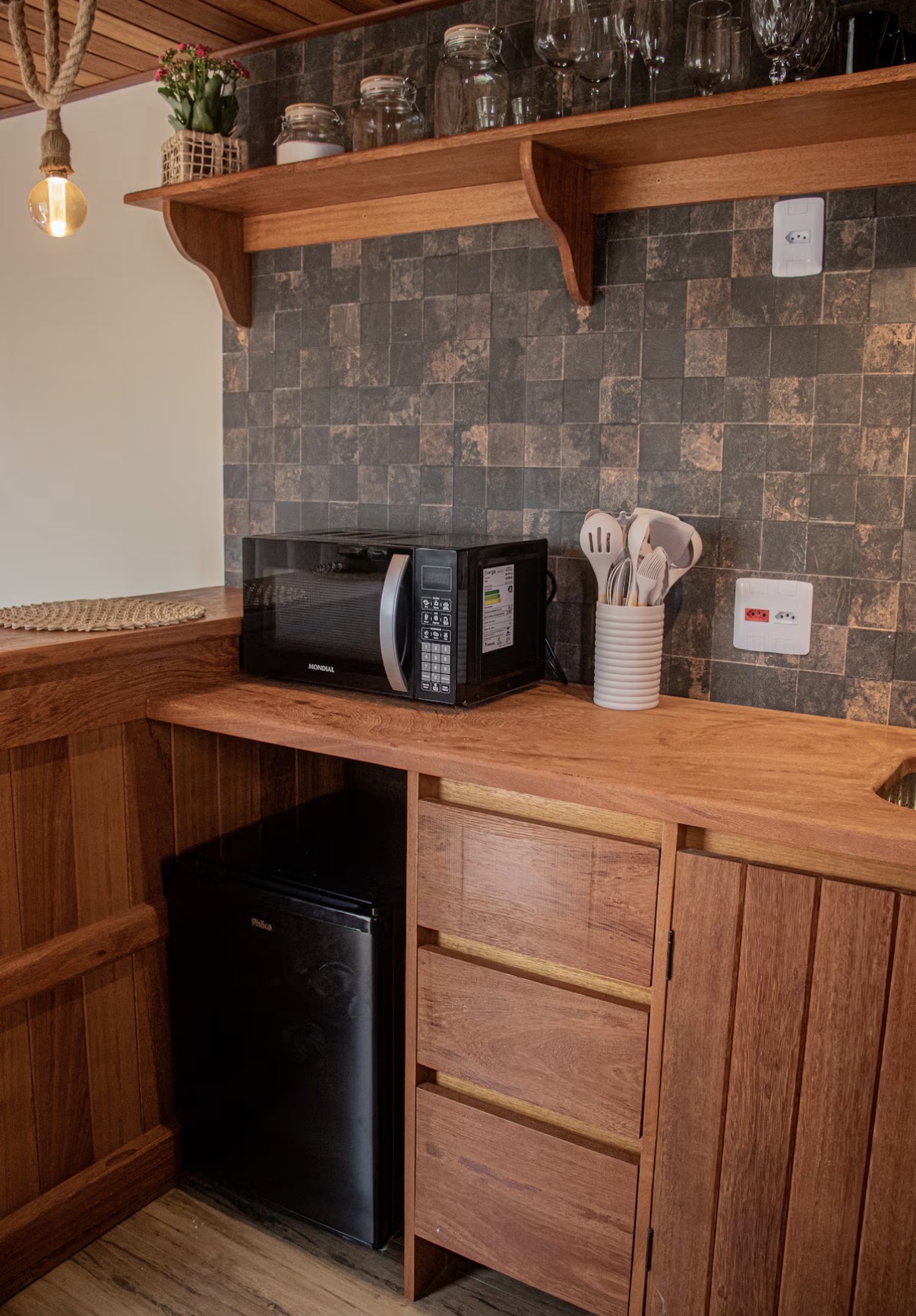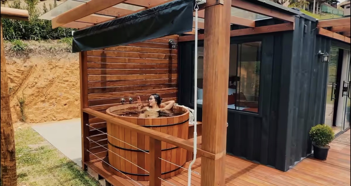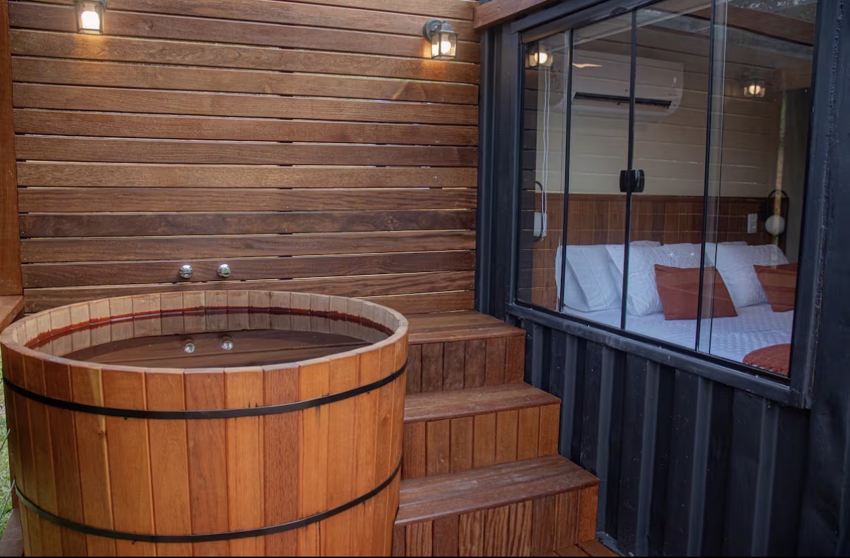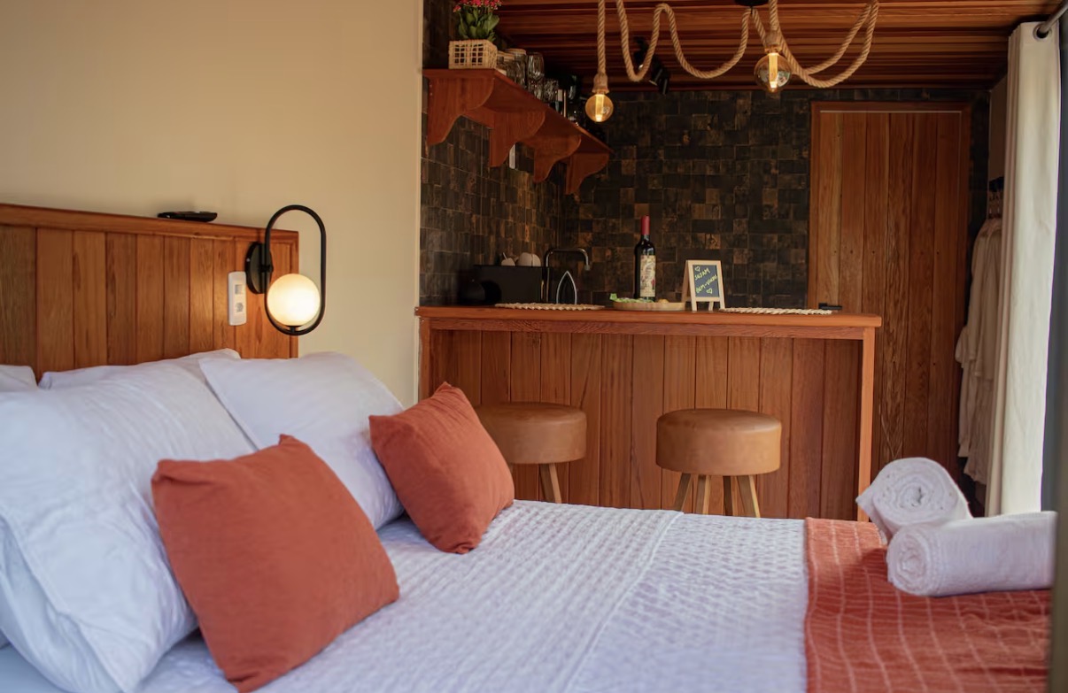 O chalé container foi idealizado para proporcionar ao casal um ambiente de reconexão e renovação, com máximo conforto e detalhes pensados para uma estadia especial. A área interna reúne quarto, banheiro e cozinha equipada com utensílios e eletrodomésticos, criando um espaço funcional e acolhedor.
