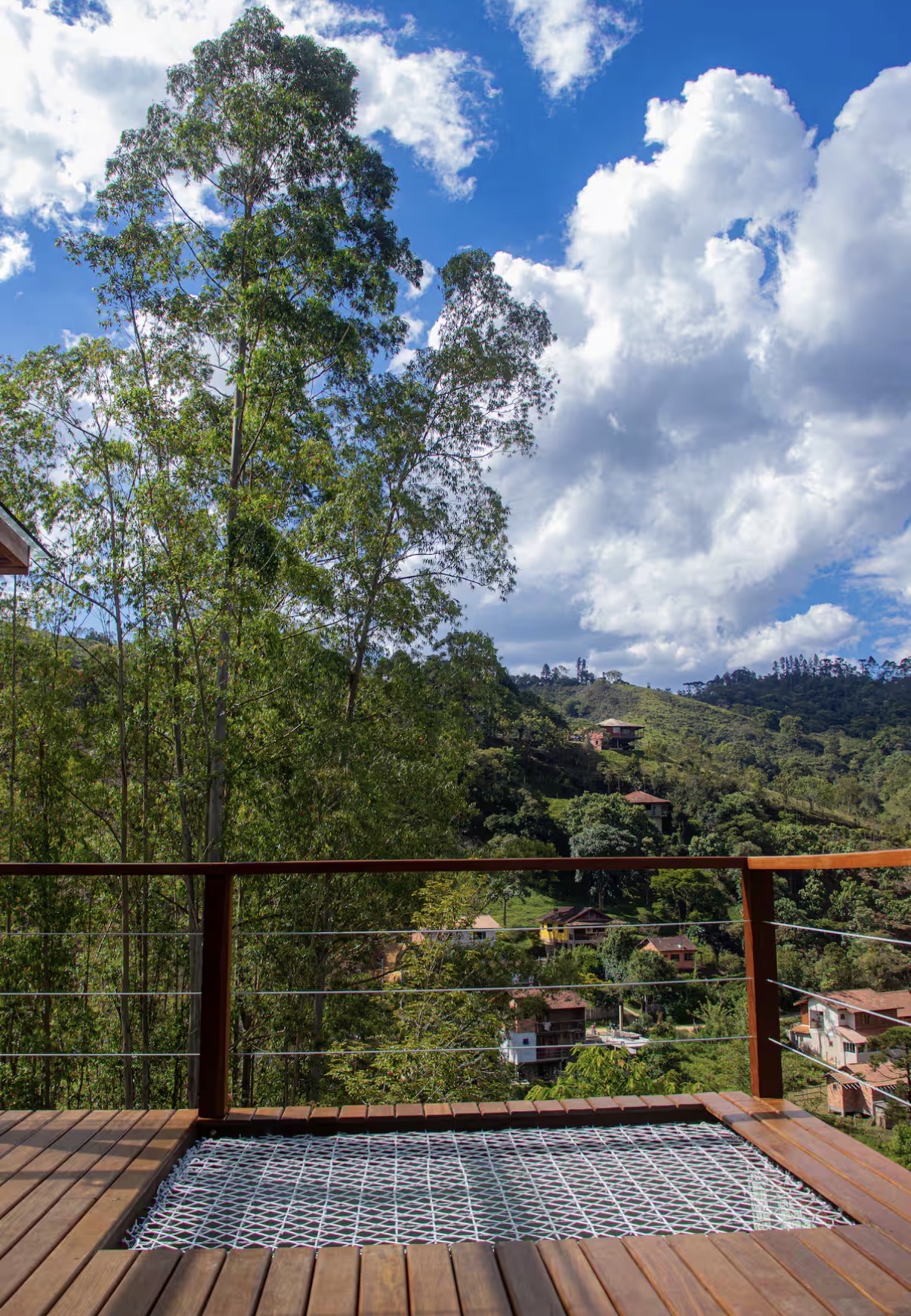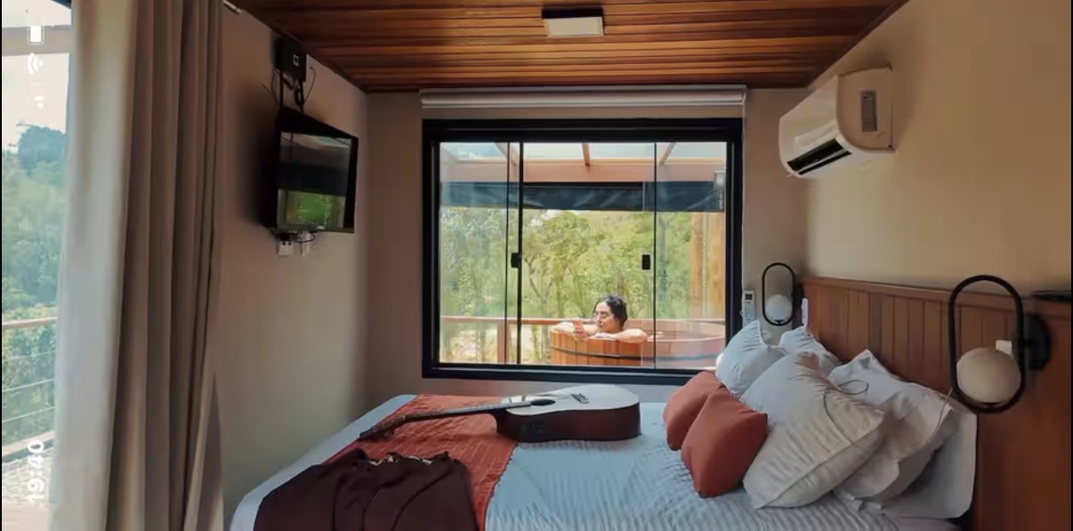 Na parte externa, o deck conta com ofurô de água quente e rede suspensa, complementando a experiência ao ar livre. Cercado por um cenário sereno, o chalé oferece um clima romântico em meio à natureza, ideal para desacelerar e viver momentos de tranquilidade.