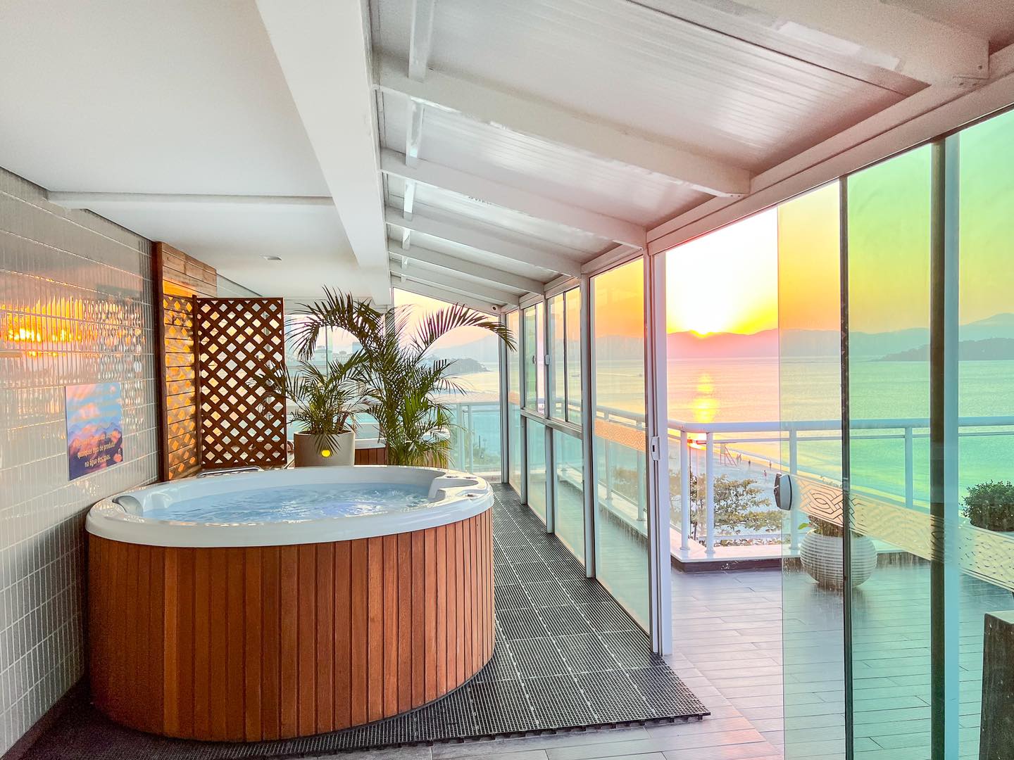 Ar condicionado Secador de cabelo TV a cabo / Smart TV Jacuzzi / Ofurô / Banheira Coberta Frigobar Lareira Máquina de Café Enxoval de Luxo (+ Roupão e Pantufa) Sauna Cozinha Estação de trabalho (mesa e cadeira) Piscina Aquecida ou climatizada Borda Infinita Coberta